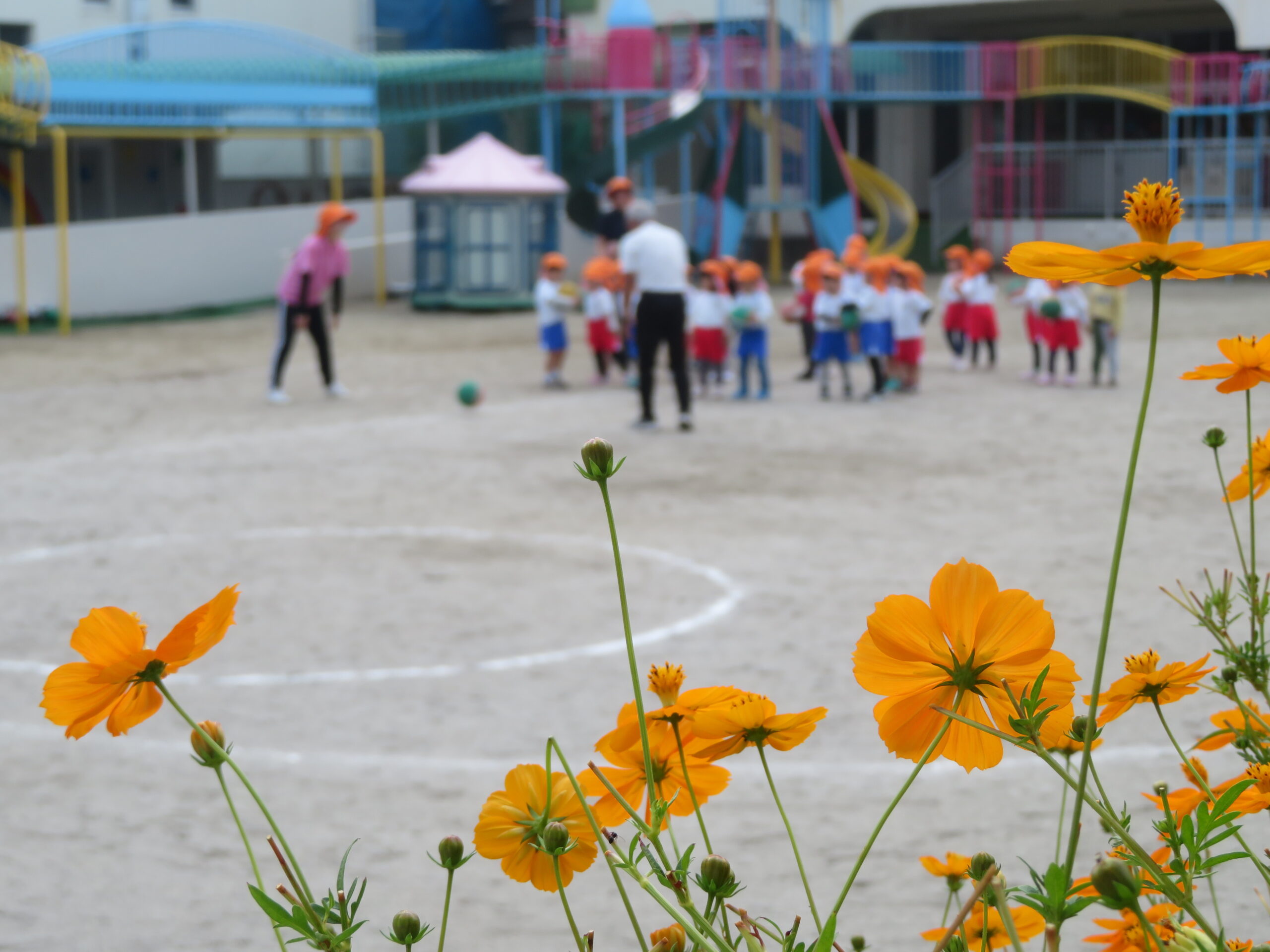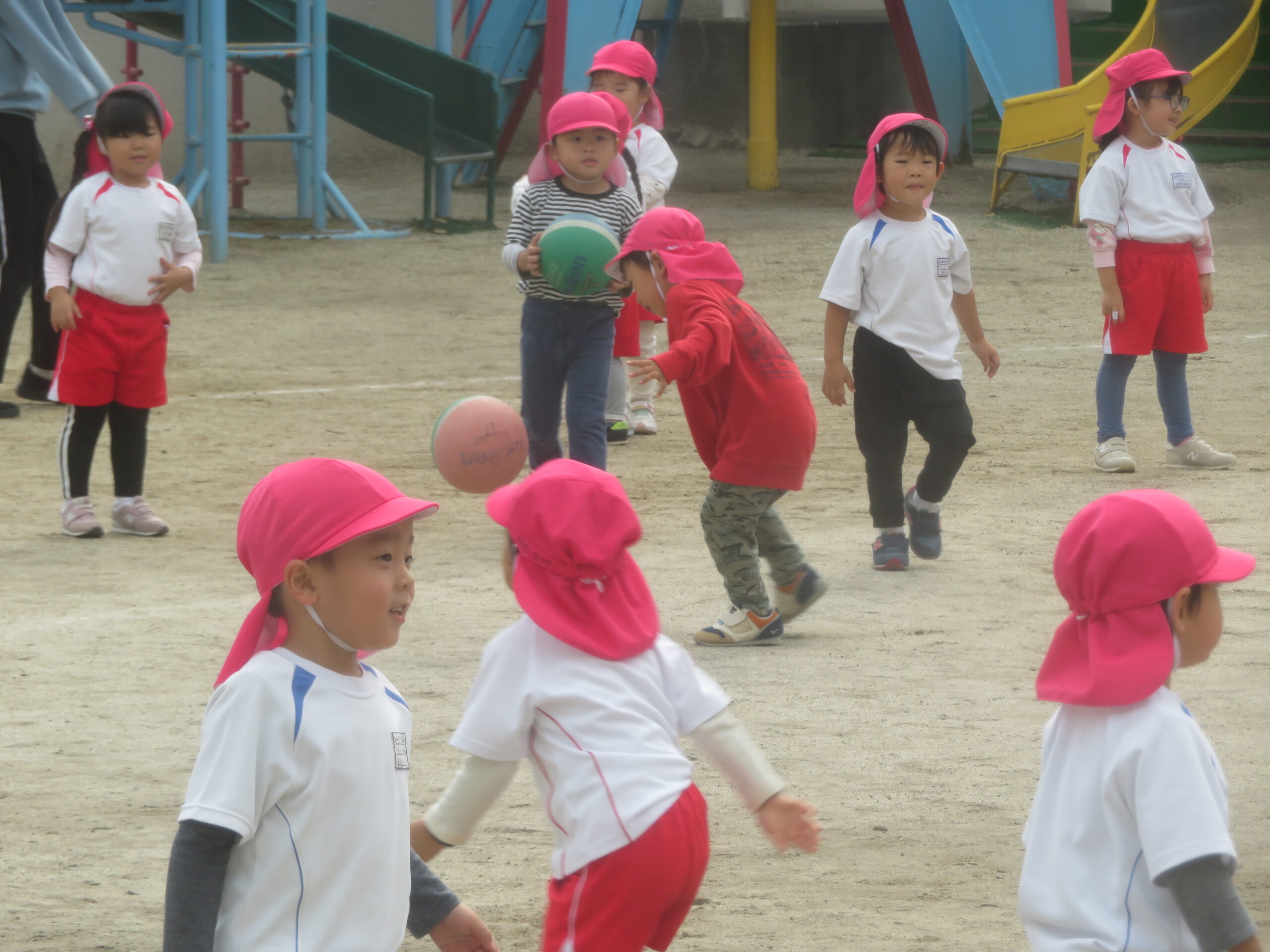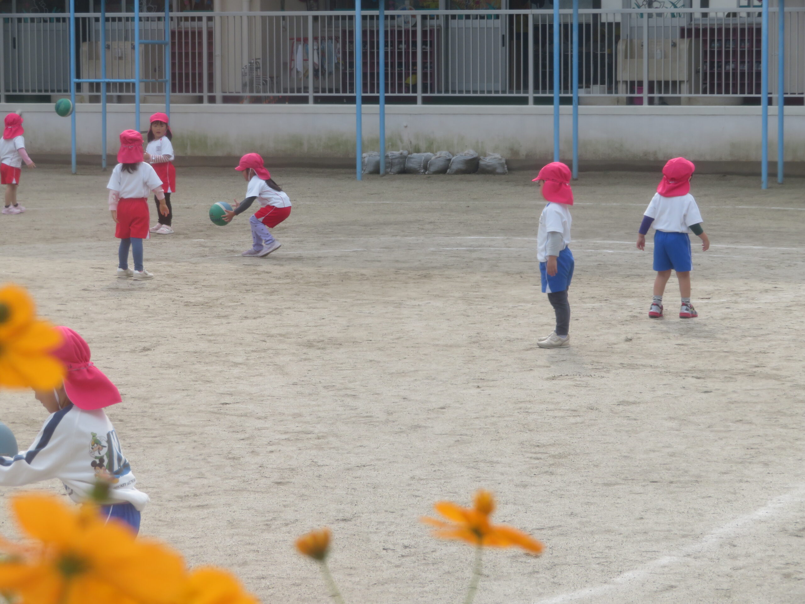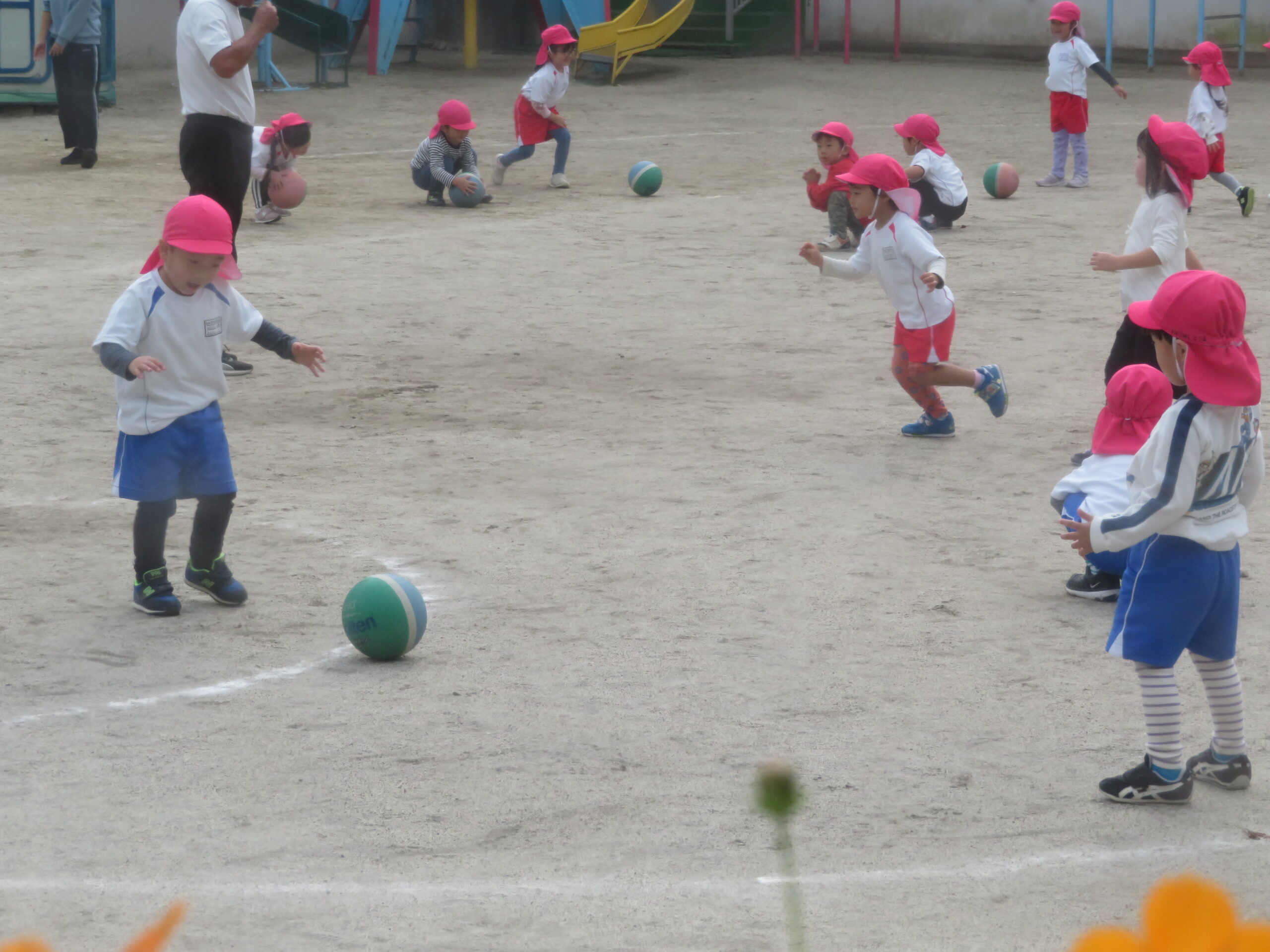 11月17日(月)年少さんのボール遊びの運動がありました。大きなボールを二人向かい合って転がす運動です。両手で相手をめがけて転がし、相手はボールをつかみます。上手になると二人の距離を長くして転がします。