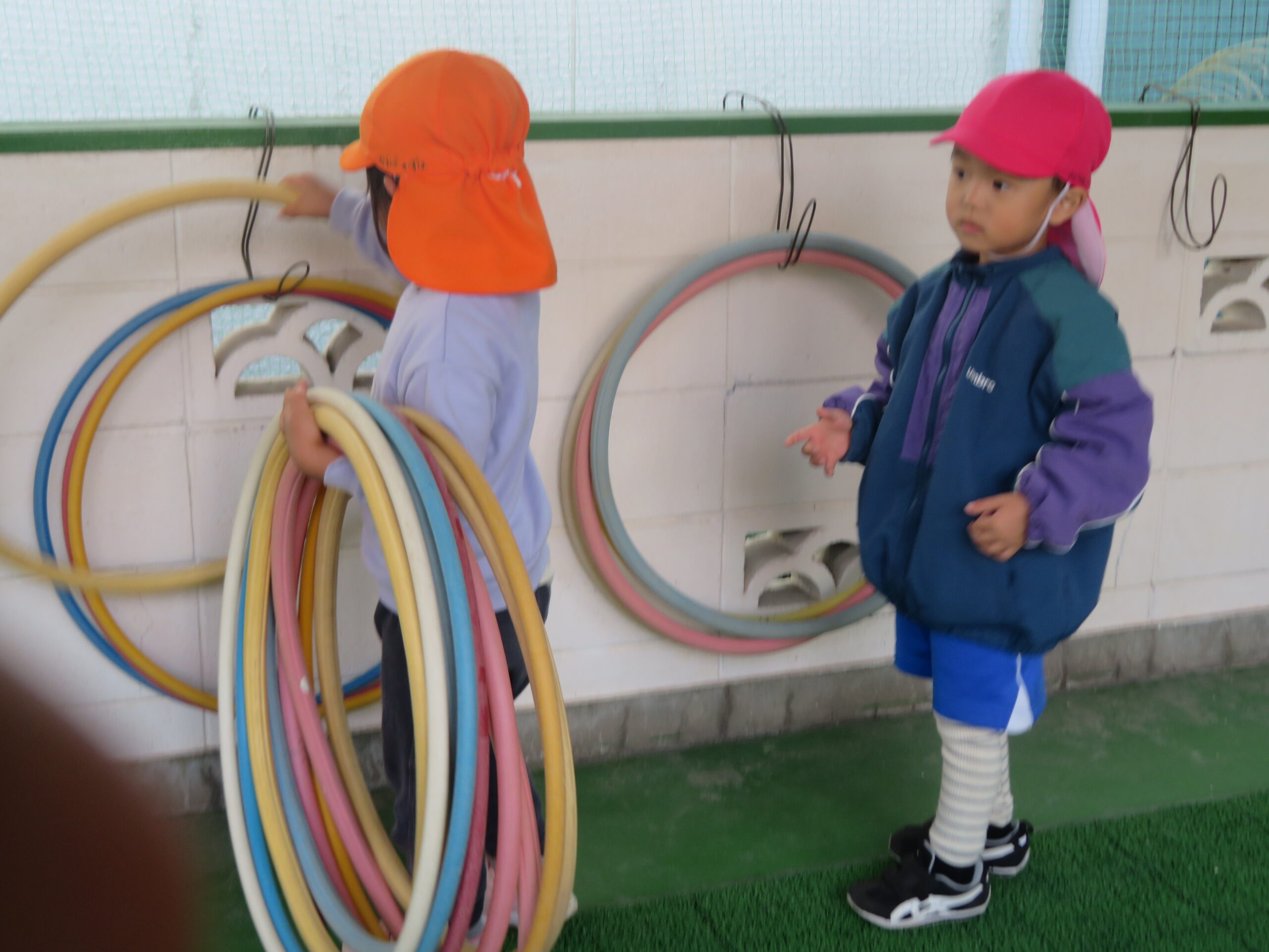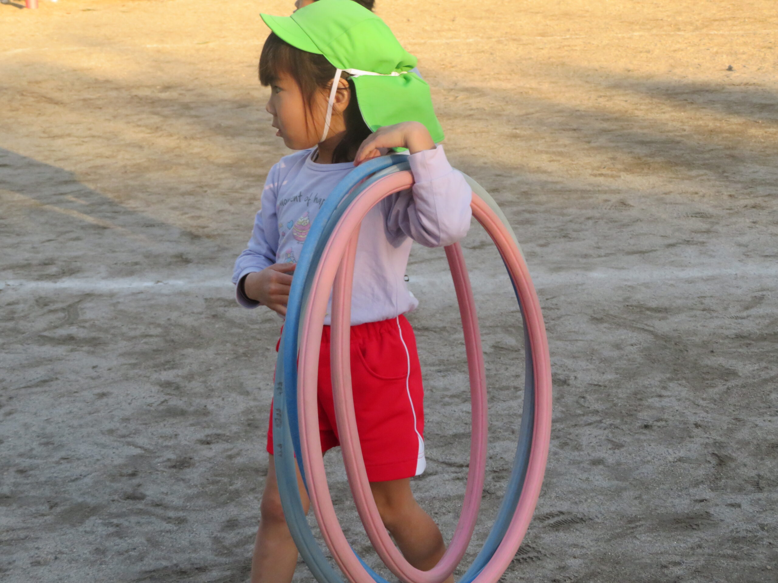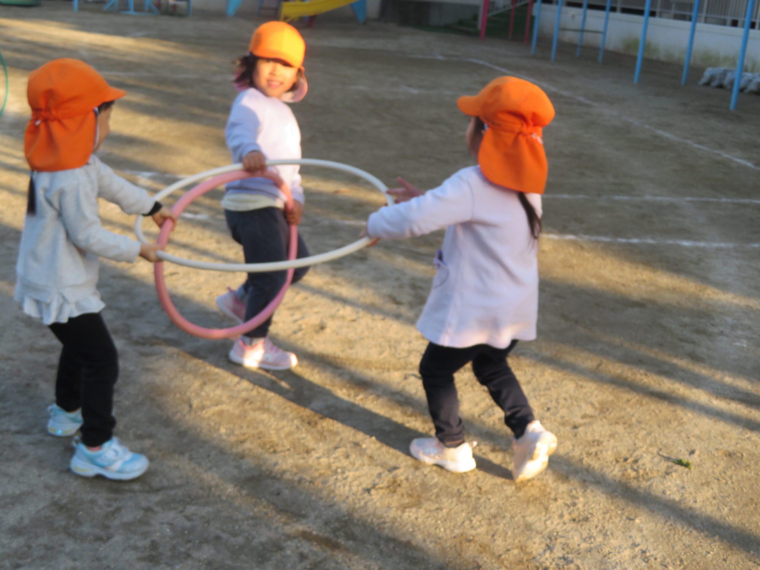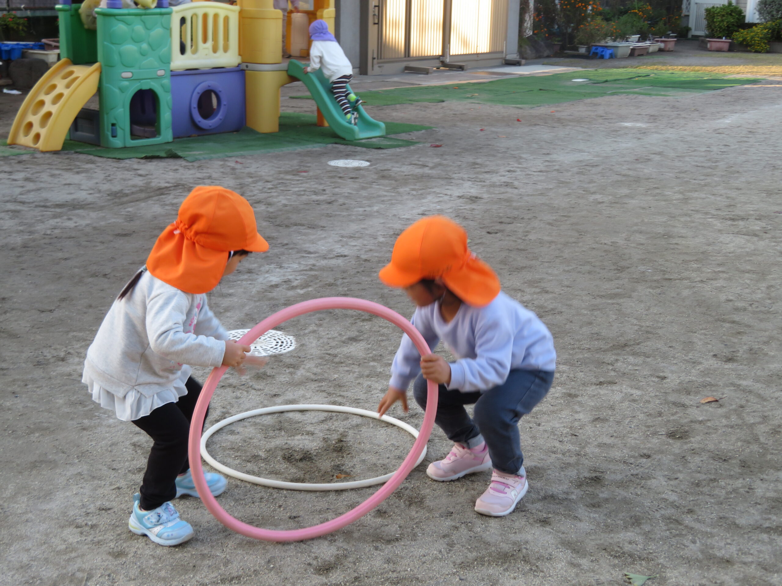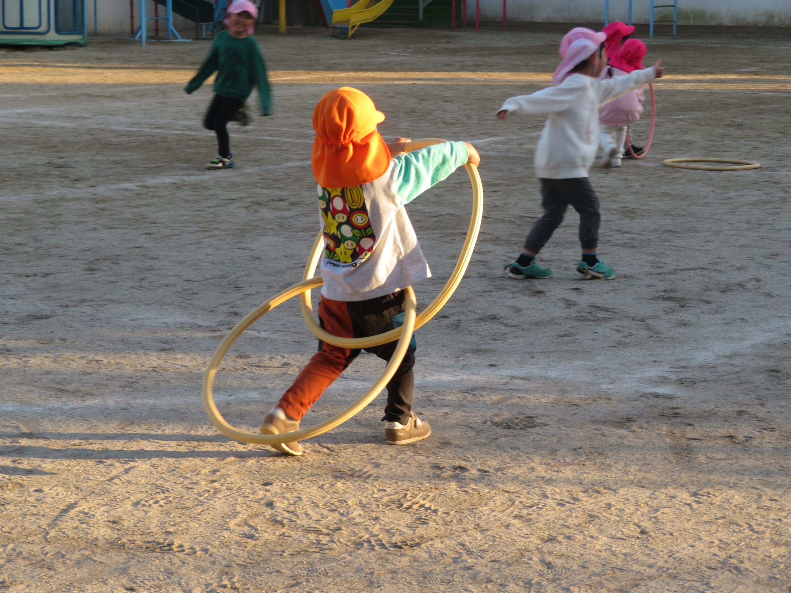 11月26日(水)の預かり保育(いちょうクラブ)は「フラフープを使って遊ぼう」でした。子どもたちは、園庭いっぱい広がり、いろんな遊びに熱中していました。その様子を紹介します。最後は自分たちで使ったフラフ-プを片付けていました。