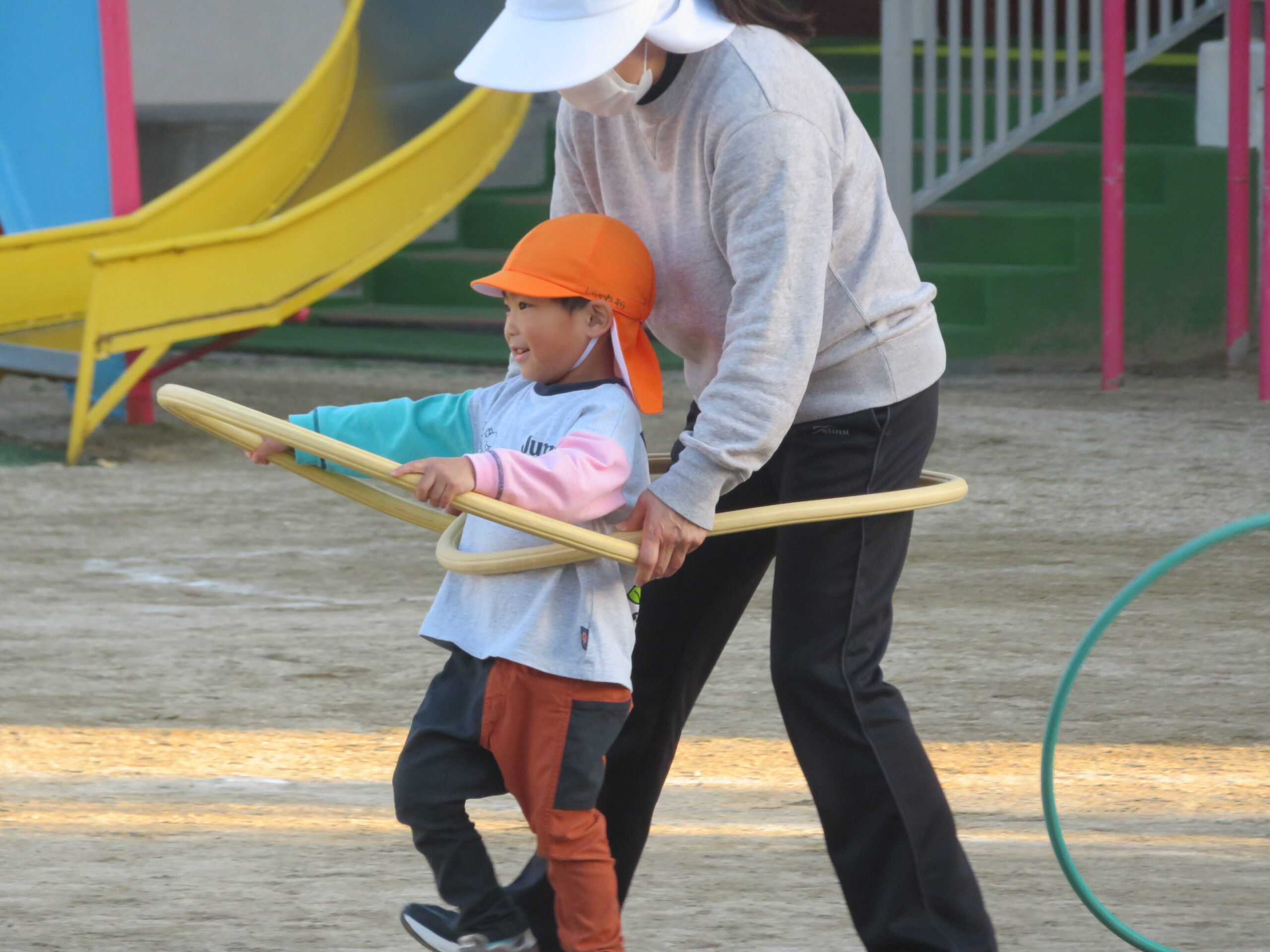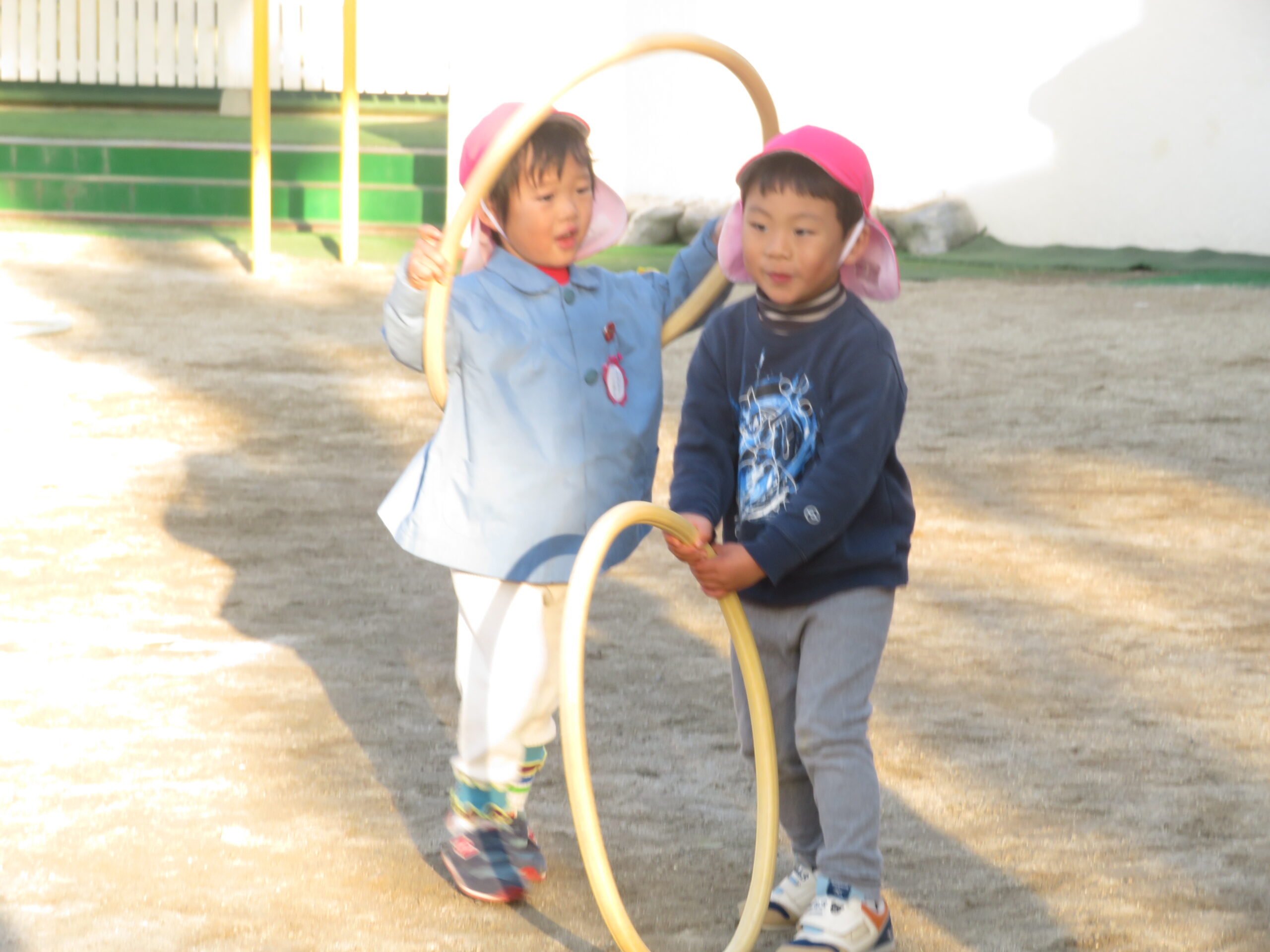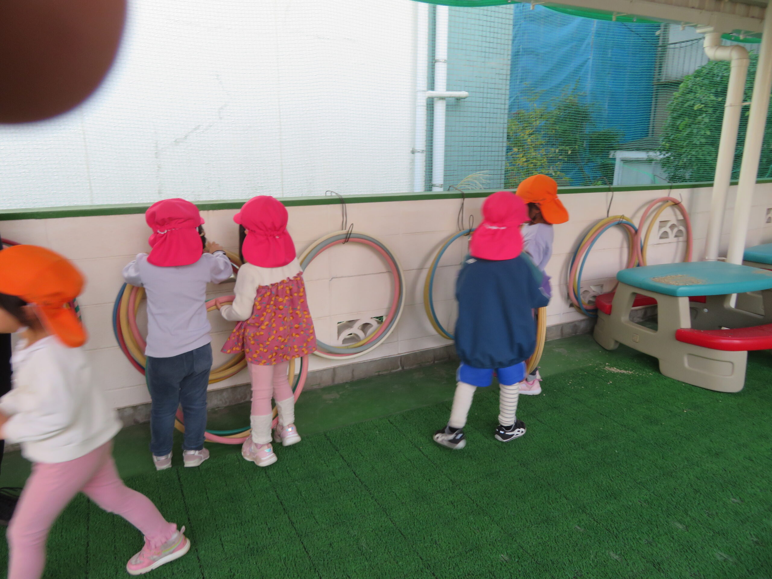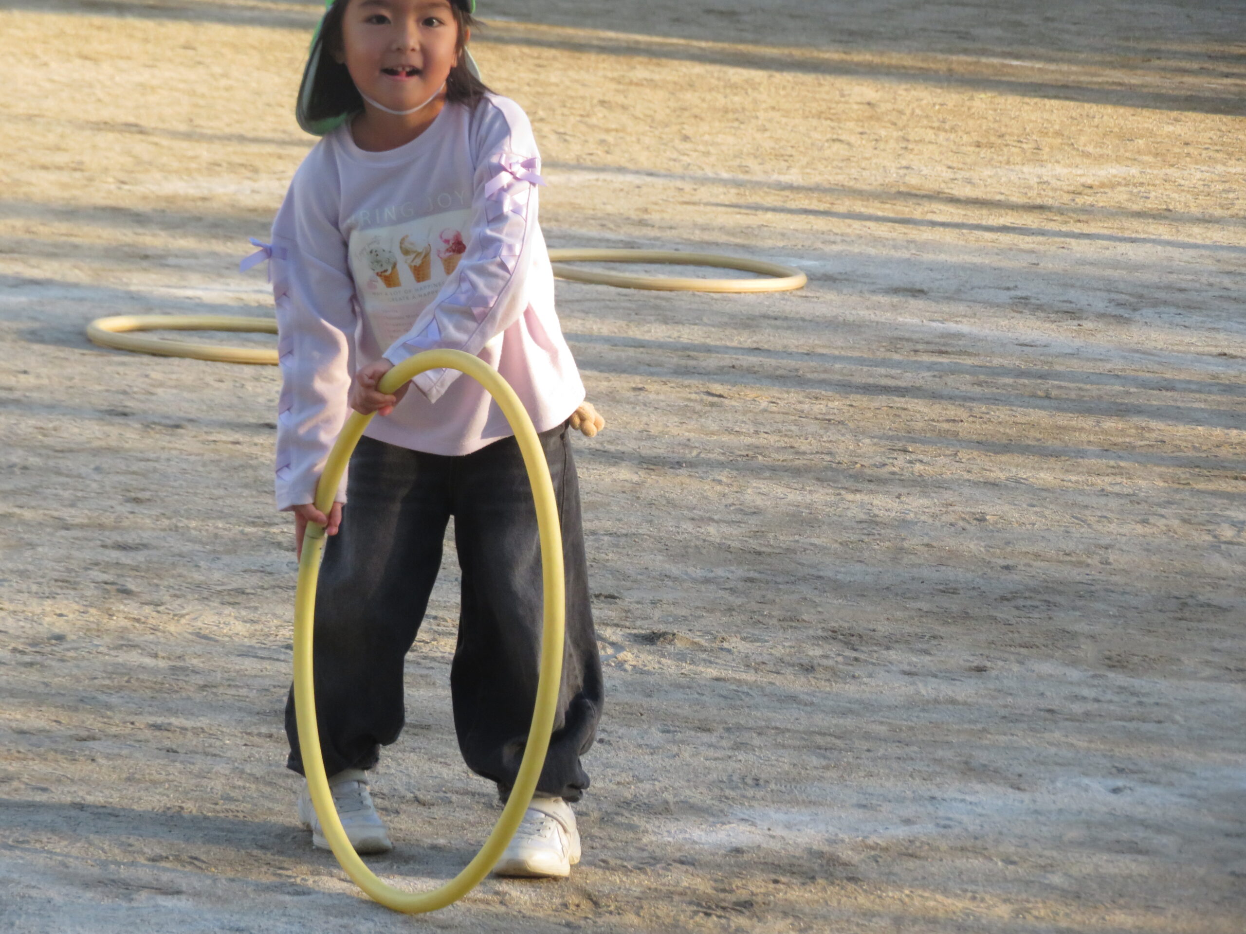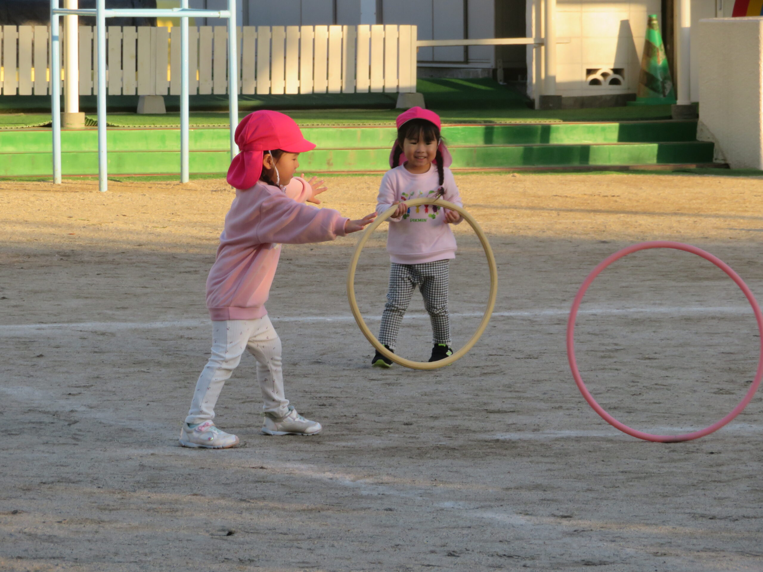 11月26日(水)の預かり保育(いちょうクラブ)は「フラフープを使って遊ぼう」でした。子どもたちは、園庭いっぱい広がり、いろんな遊びに熱中していました。その様子を紹介します。最後は自分たちで使ったフラフ-プを片付けていました。