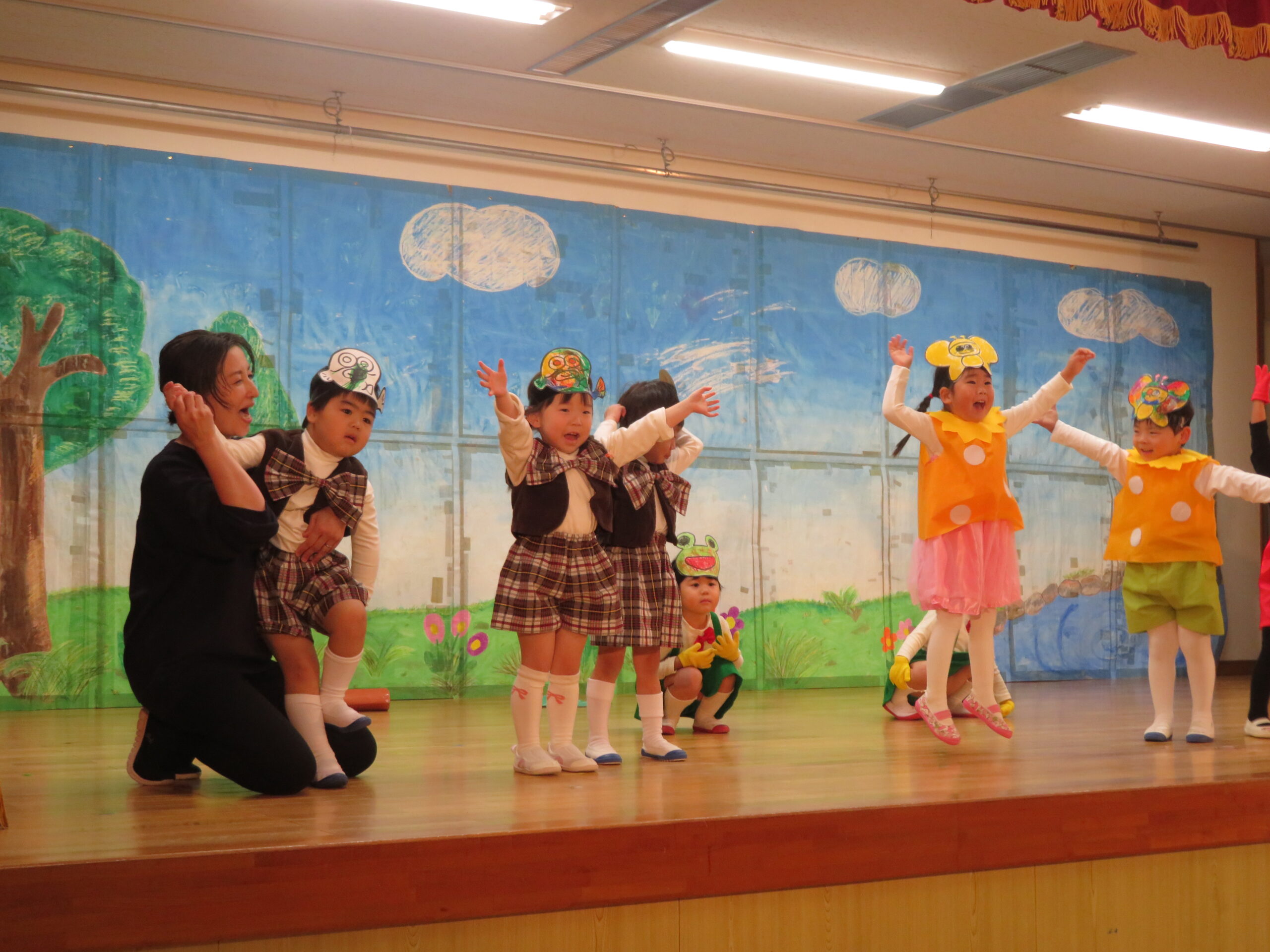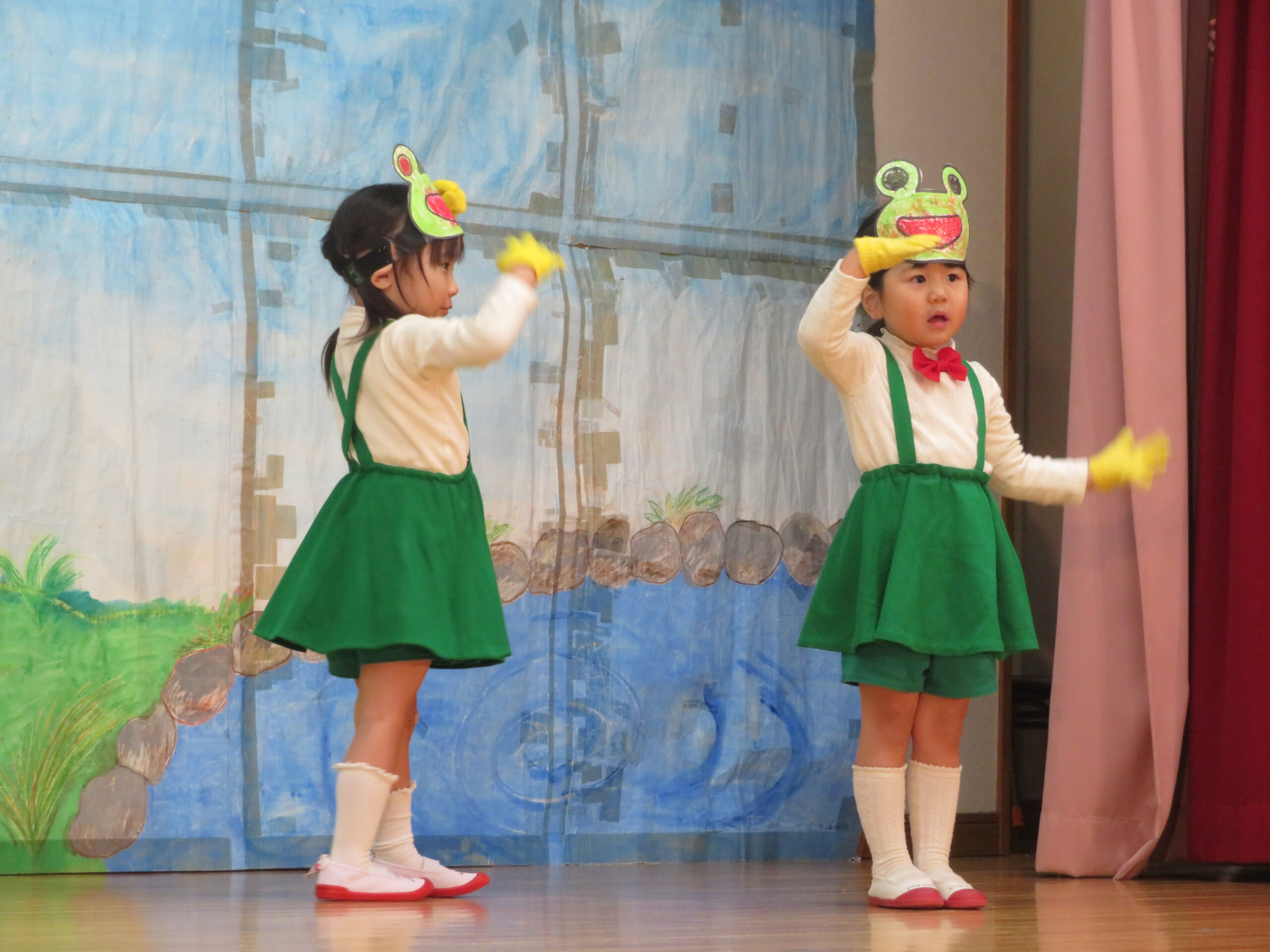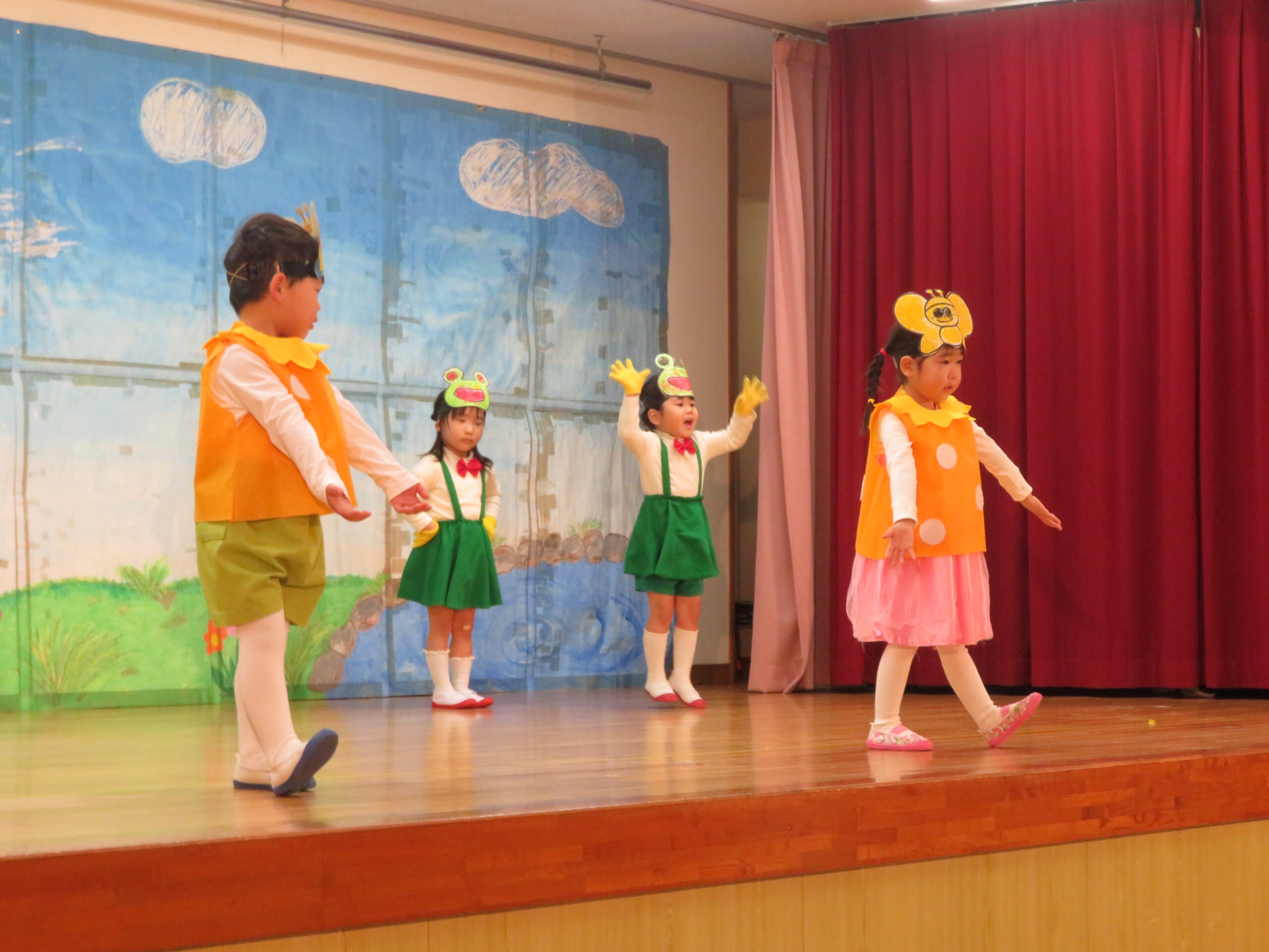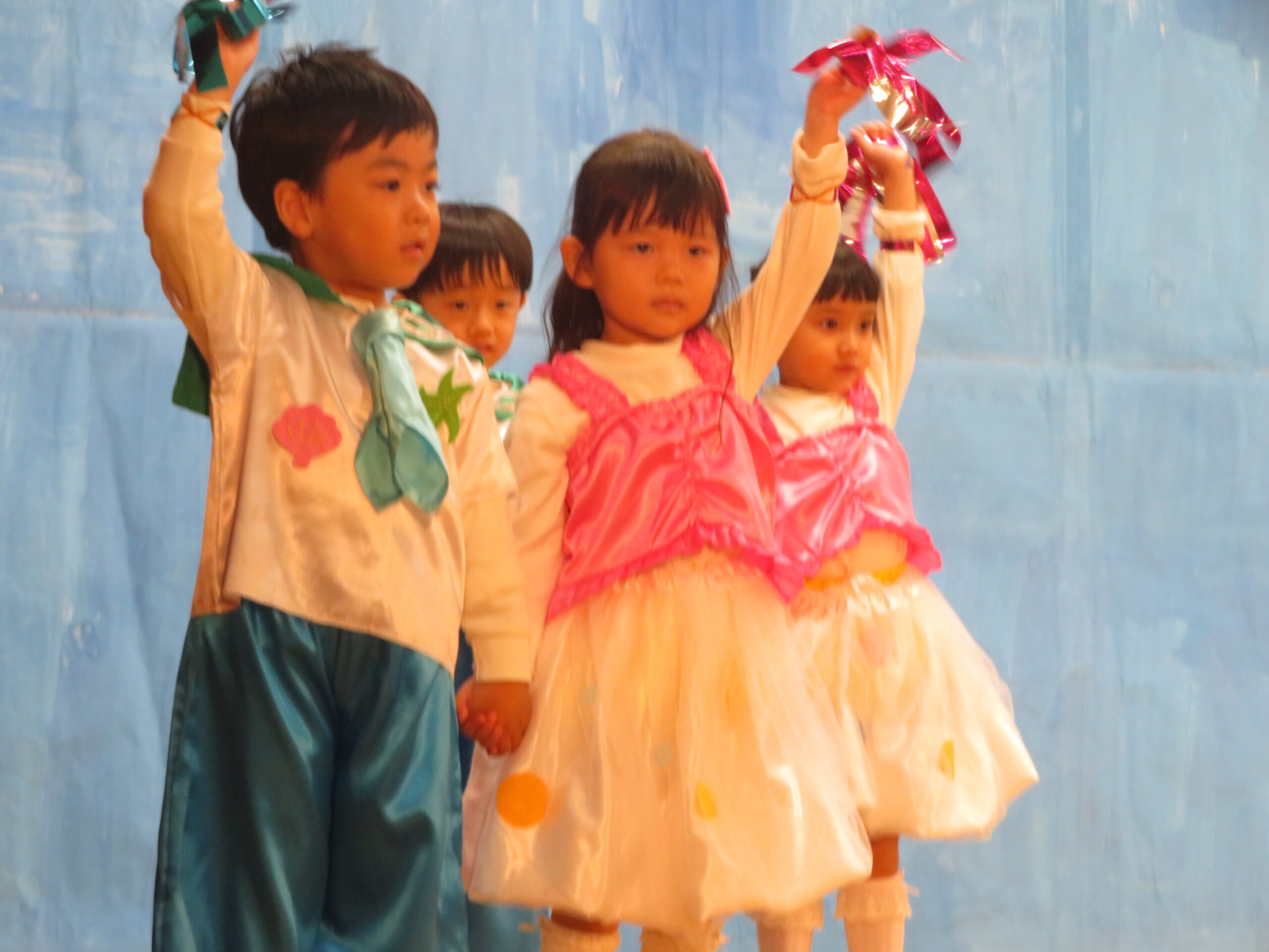 11月30日(日)、年少・すみれ組の発表会がありました。遊戯「アンダー・ザ・シー」、リズム劇「10ぴきのかえる」合唱「どんな色が好き」などを発表しました。観客の皆様からたくさんの温かい拍手をいただきました。