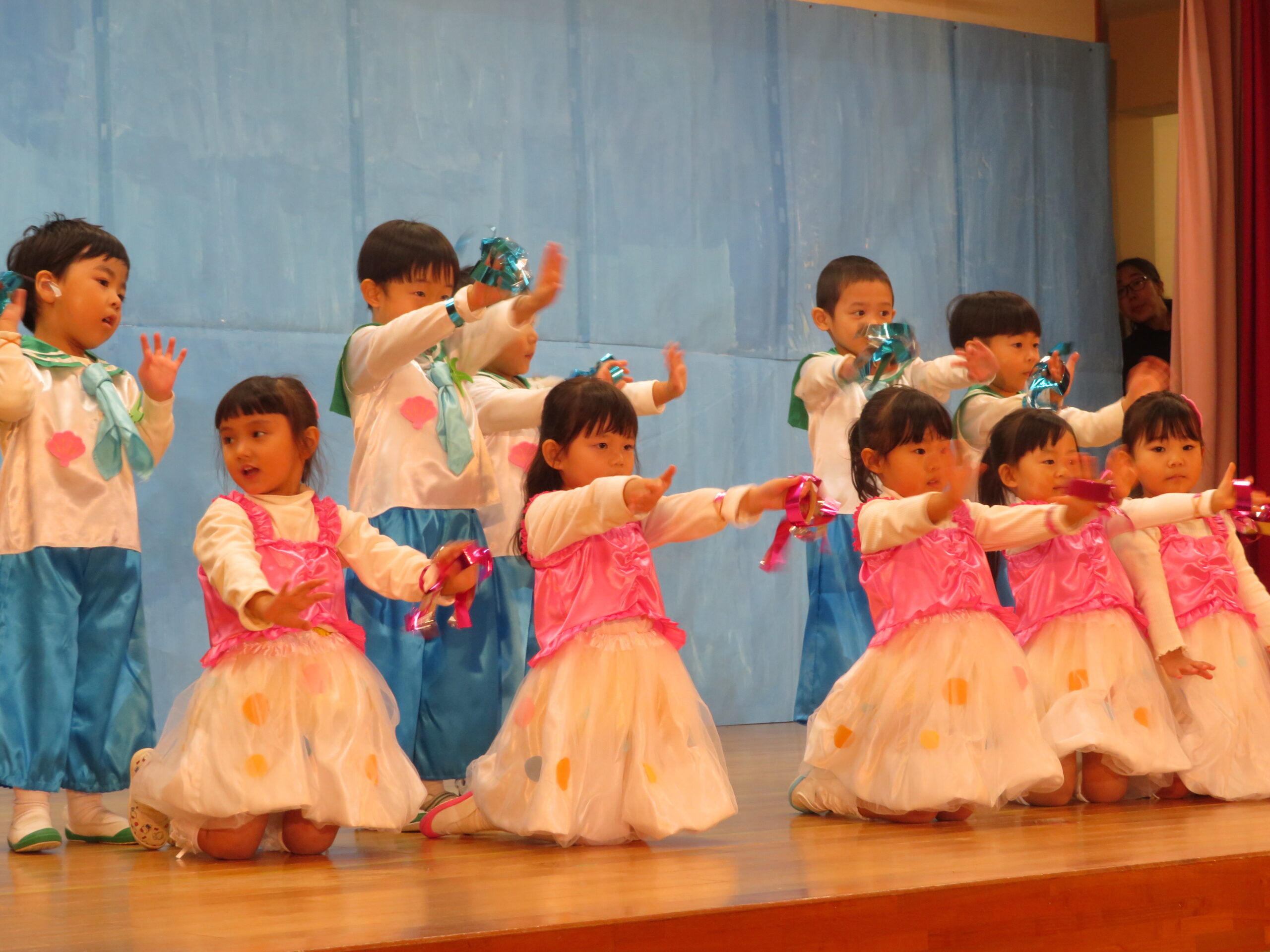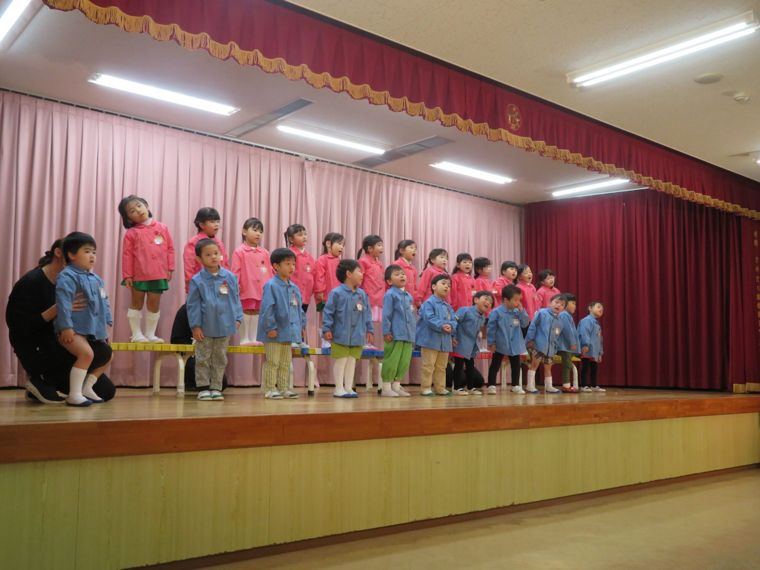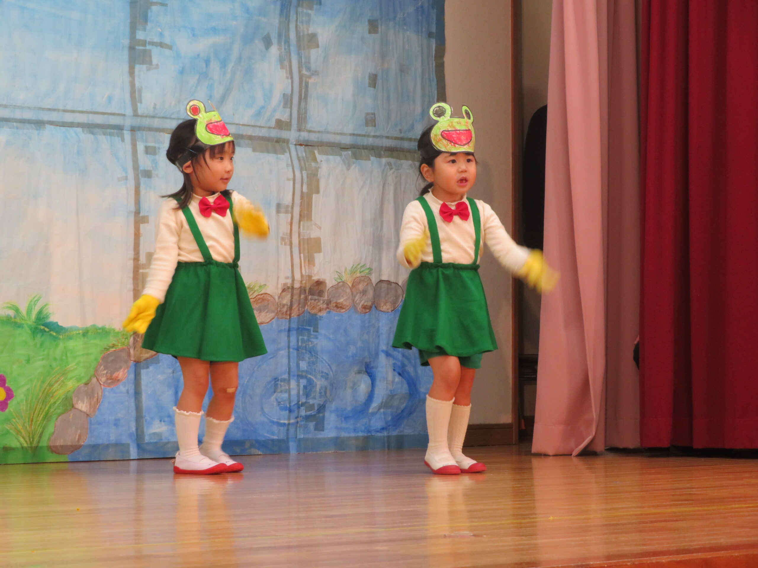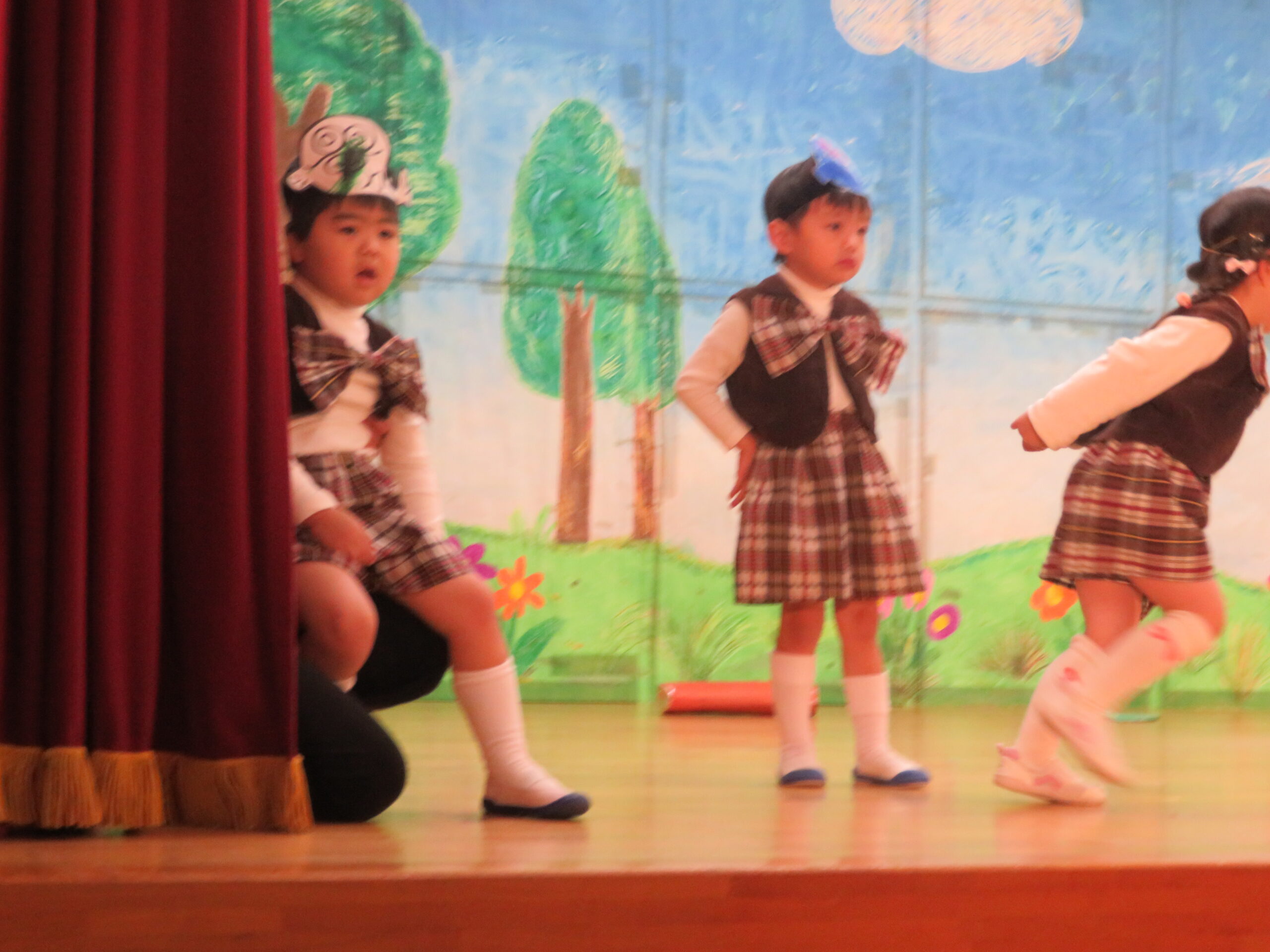 11月30日(日)、年少・すみれ組の発表会がありました。遊戯「アンダー・ザ・シー」、リズム劇「10ぴきのかえる」合唱「どんな色が好き」などを発表しました。観客の皆様からたくさんの温かい拍手をいただきました。