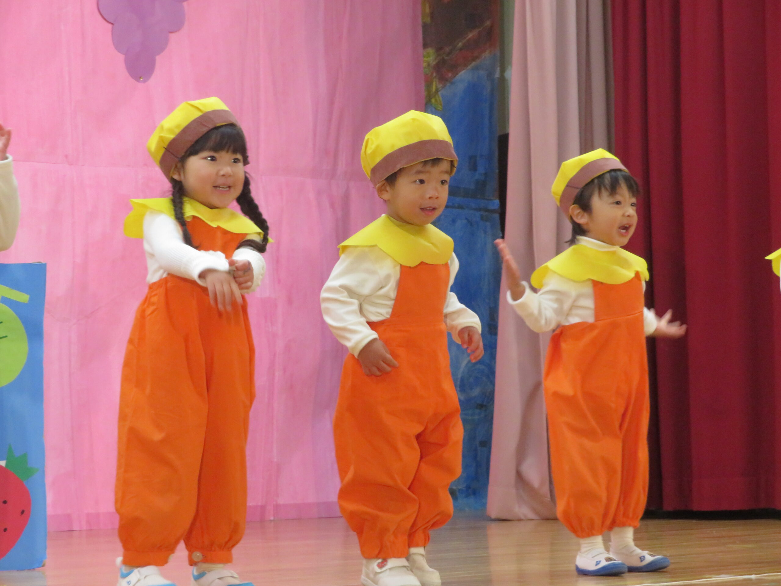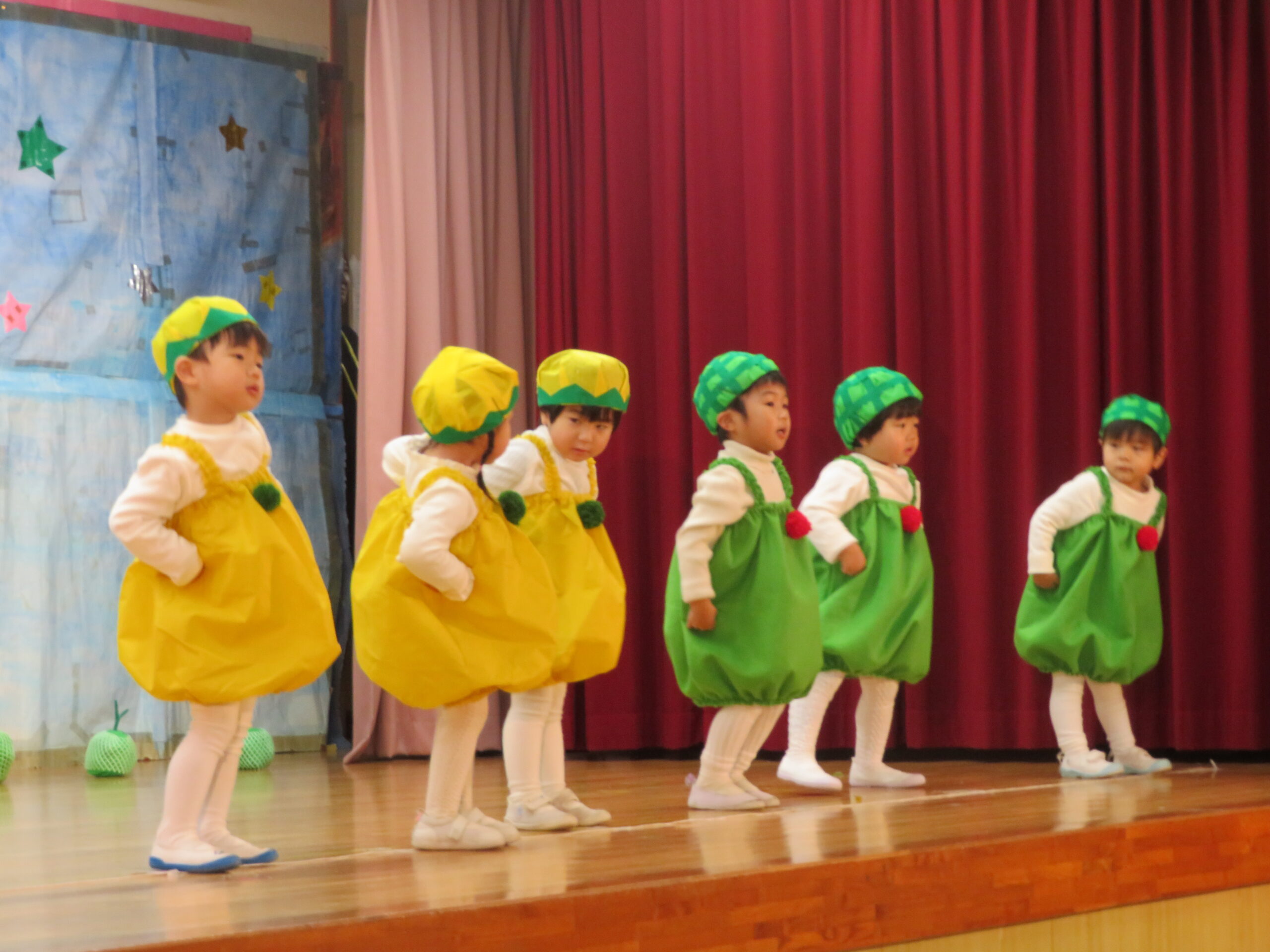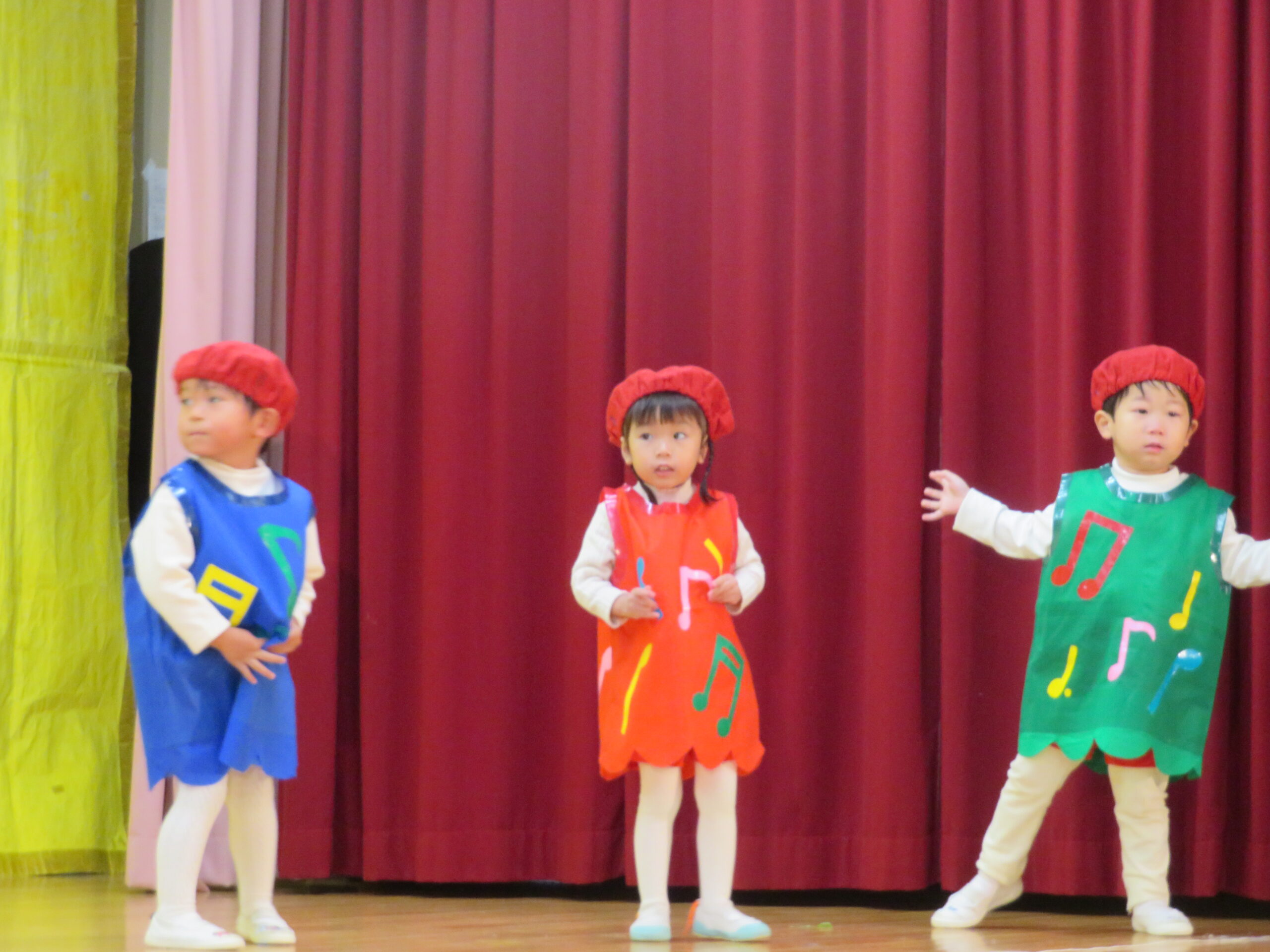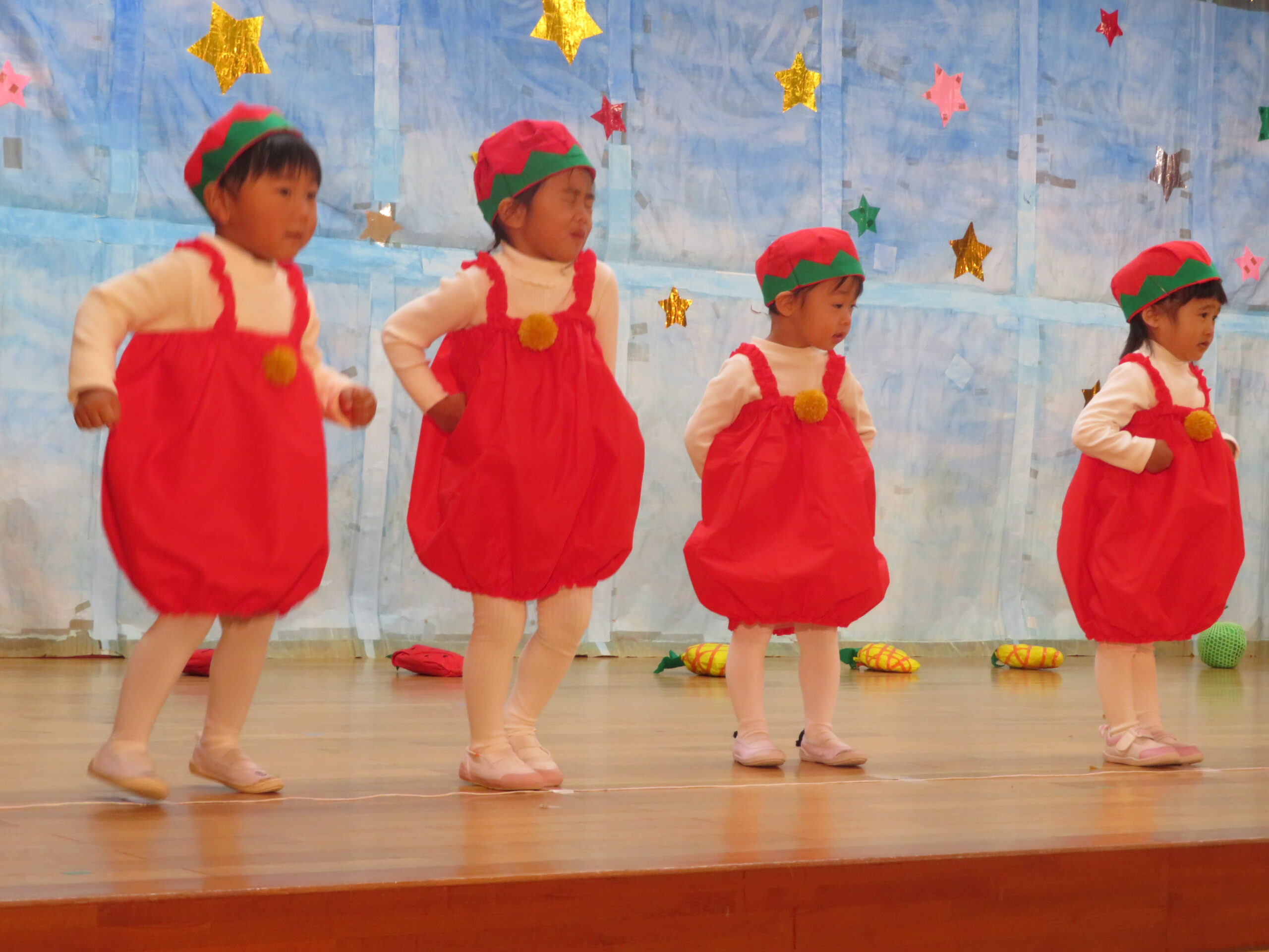 12月7日(日)、年少々・ちゅうりっぷ1組・2組の発表会がありました。遊戯[かみなりビリビリ」「音のマーチ」「フルーツ・フルーツ」「プリンであらもーど」と合唱「クリスマス」「サンタクロース」などを発表しました。観客の皆様からたくさんの温かい拍手をいただきました。