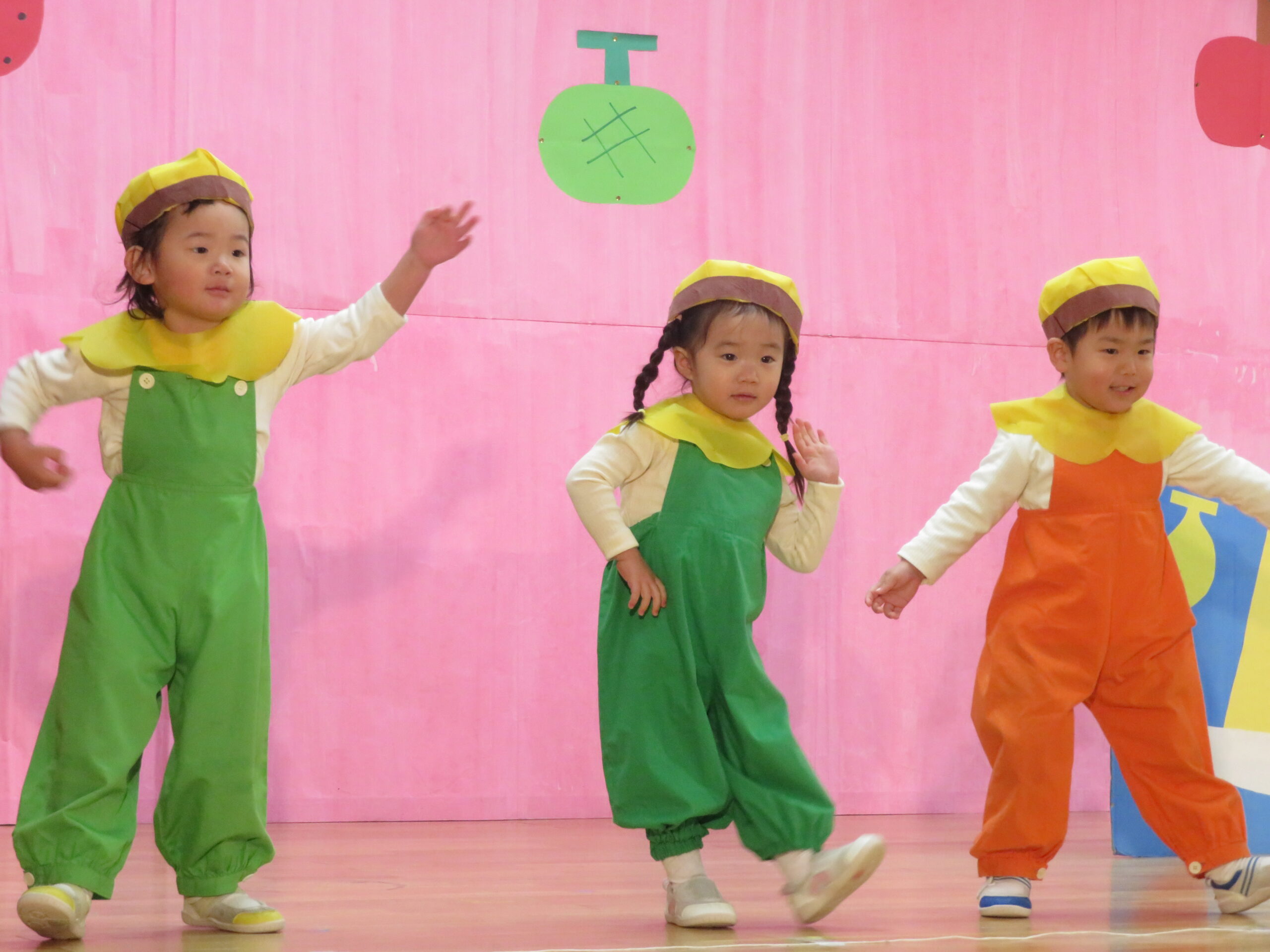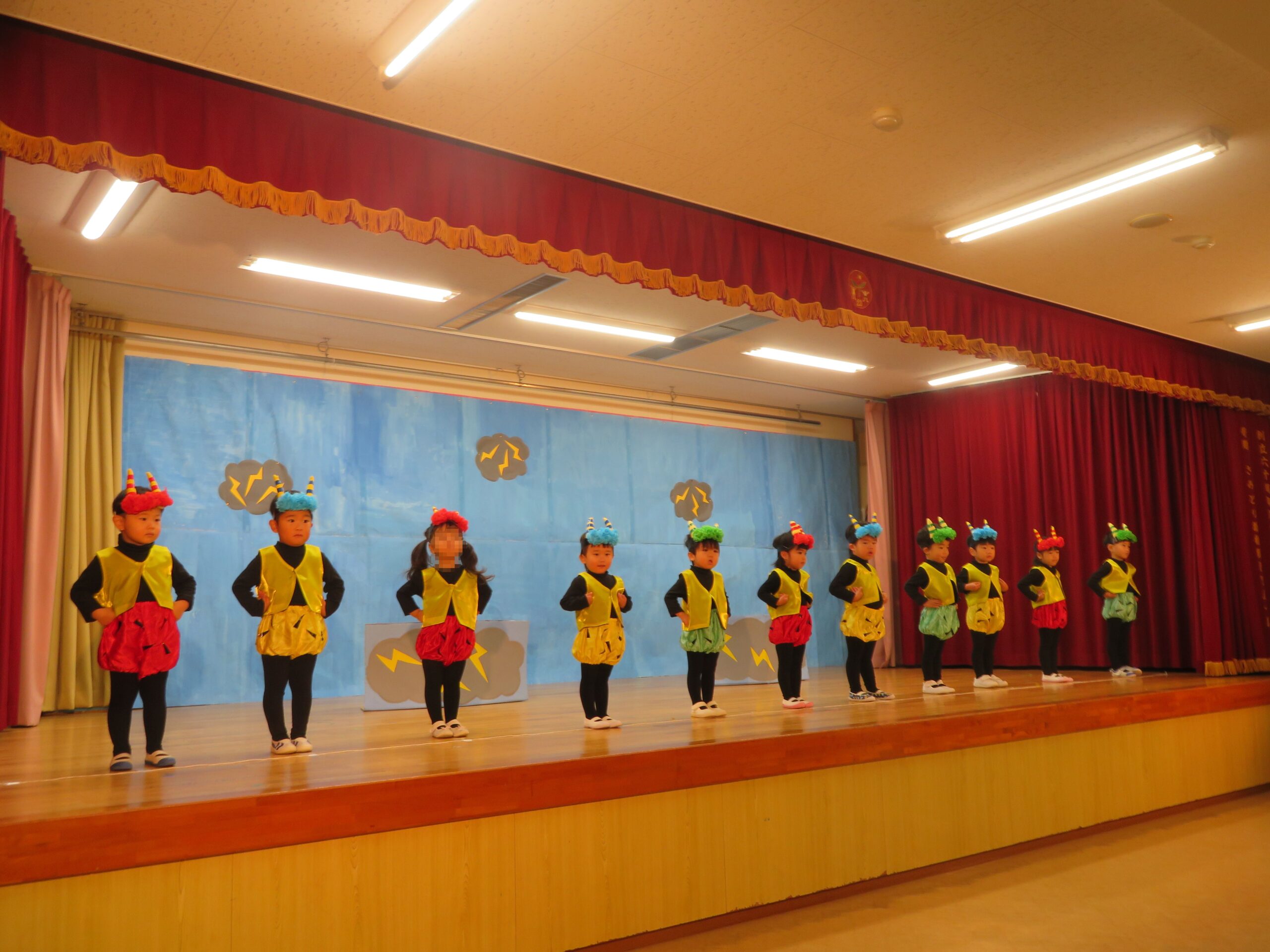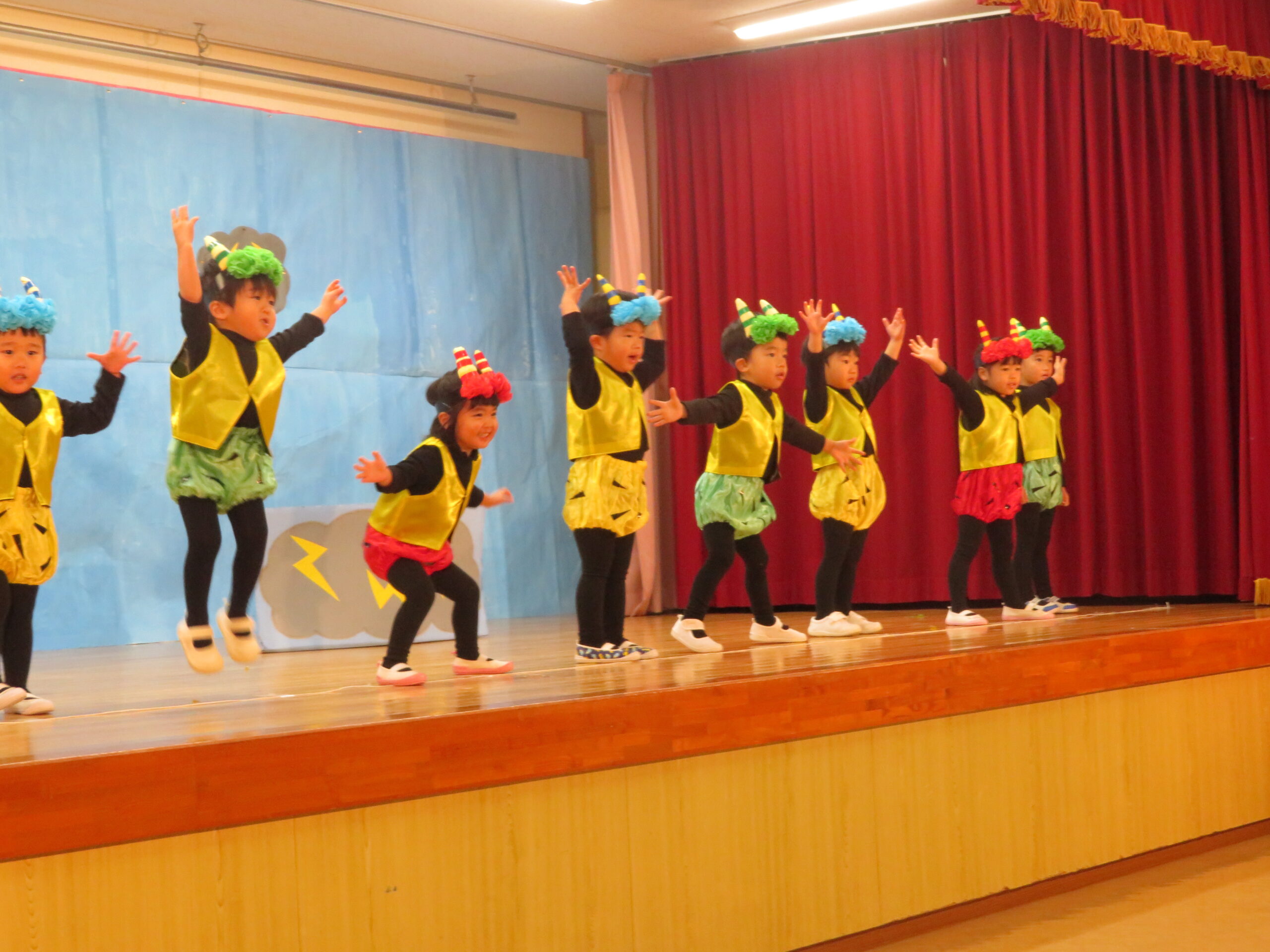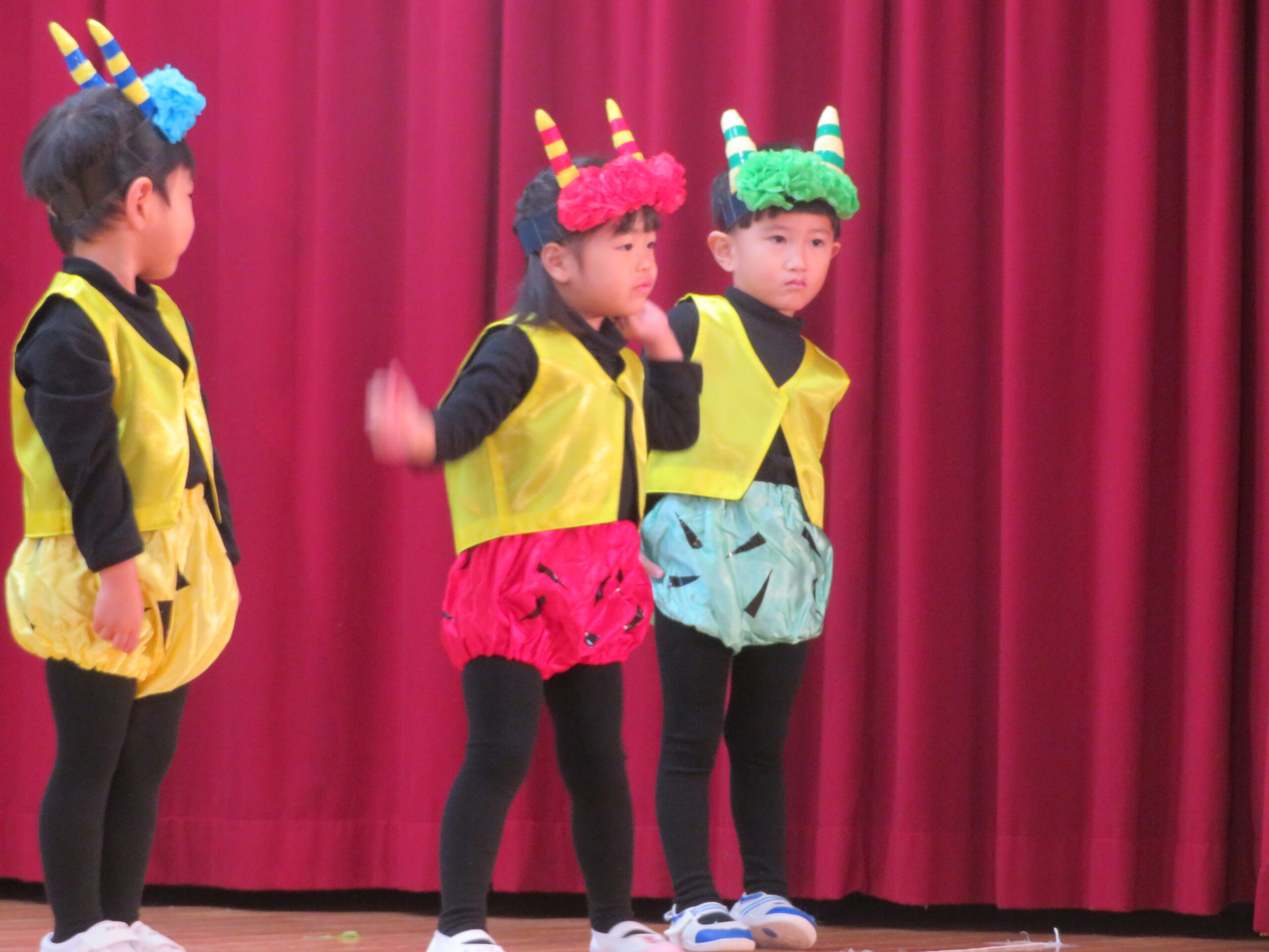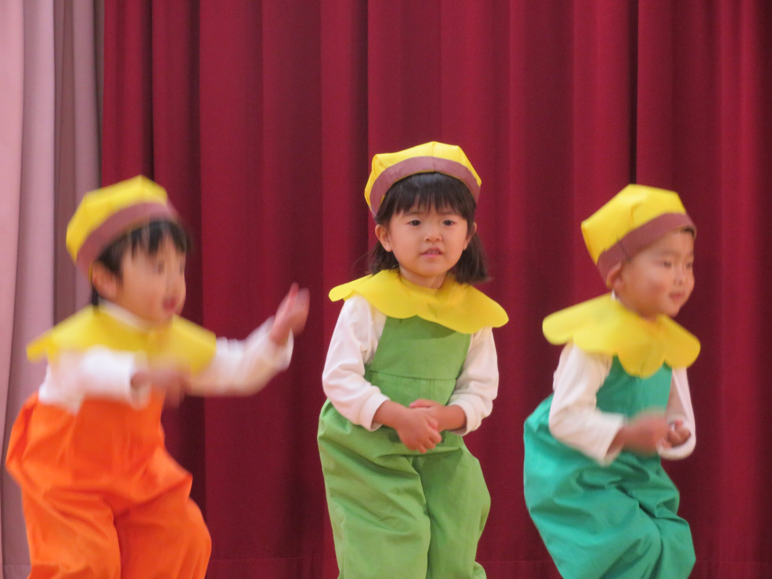 12月7日(日)、年少々・ちゅうりっぷ1組・2組の発表会がありました。遊戯[かみなりビリビリ」「音のマーチ」「フルーツ・フルーツ」「プリンであらもーど」と合唱「クリスマス」「サンタクロース」などを発表しました。観客の皆様からたくさんの温かい拍手をいただきました。