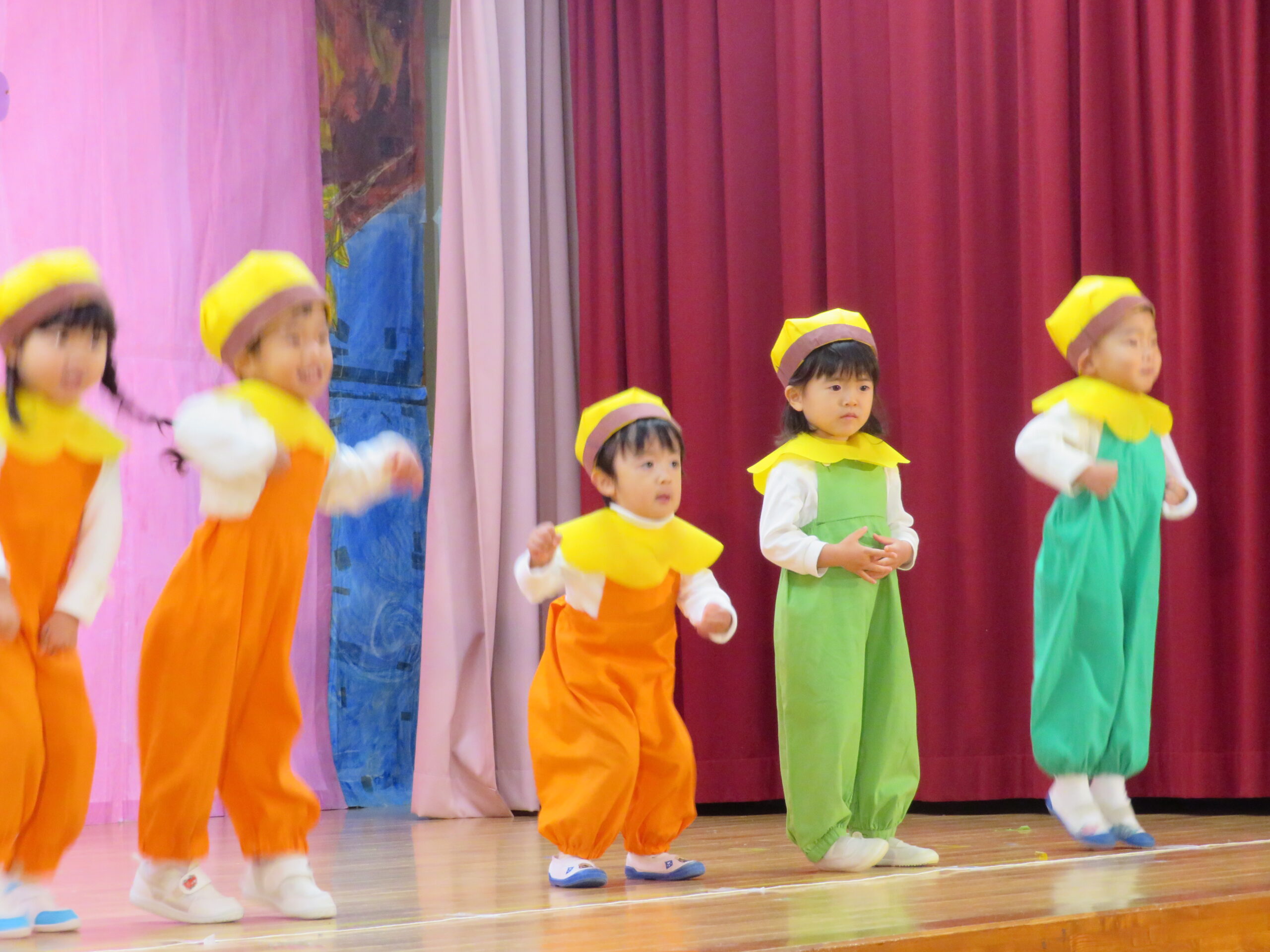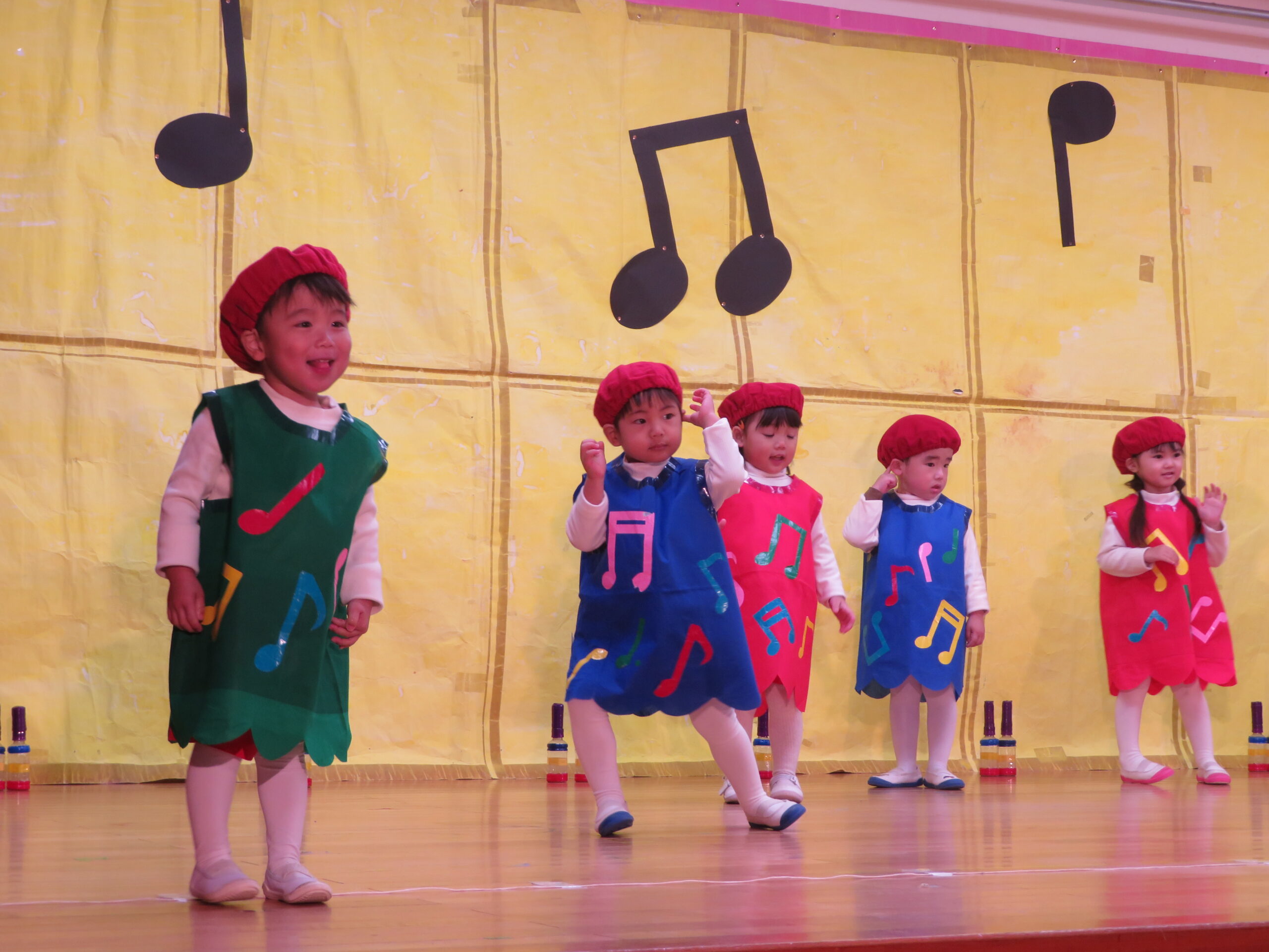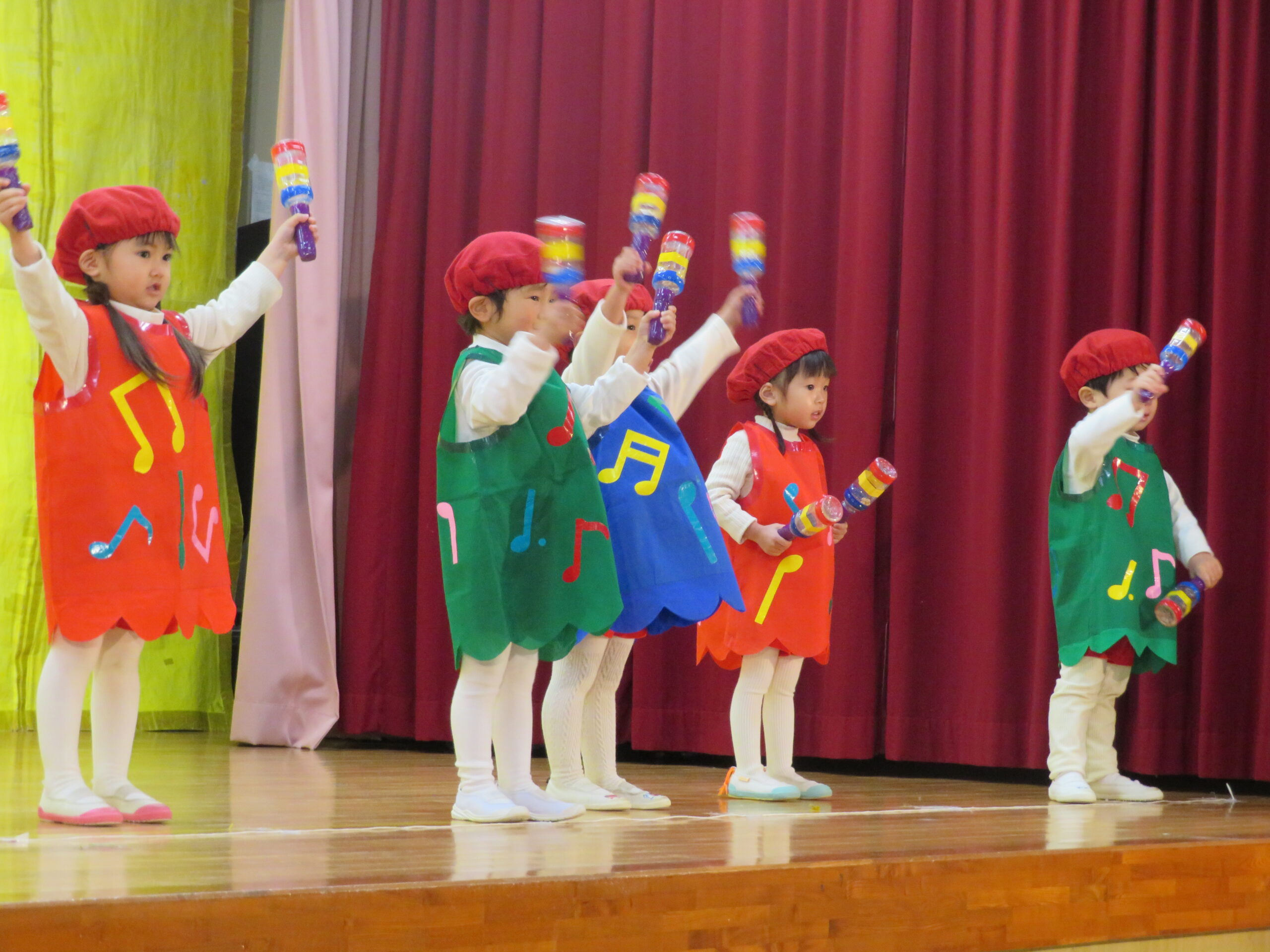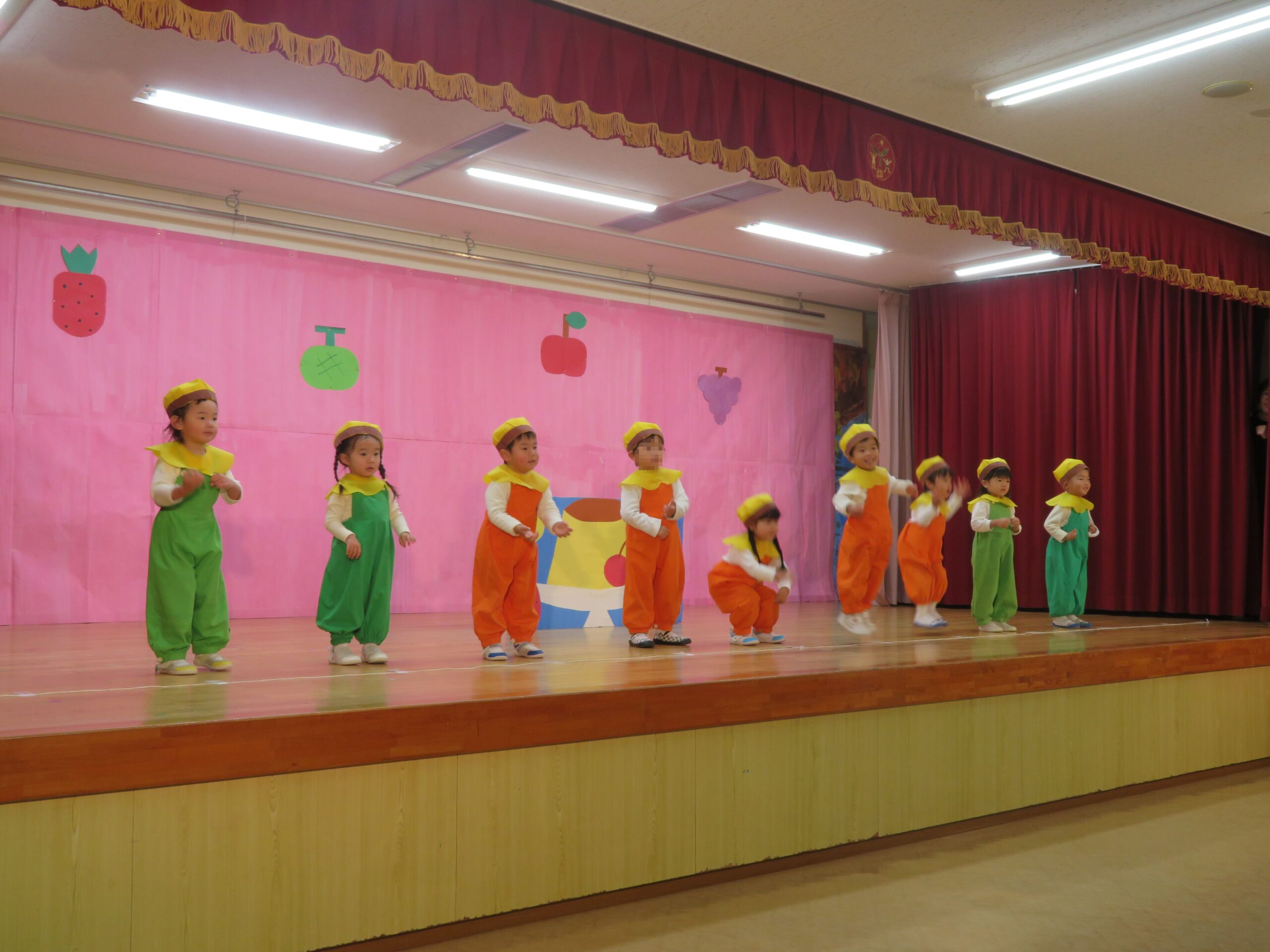 12月7日(日)、年少々・ちゅうりっぷ1組・2組の発表会がありました。遊戯[かみなりビリビリ」「音のマーチ」「フルーツ・フルーツ」「プリンであらもーど」と合唱「クリスマス」「サンタクロース」などを発表しました。観客の皆様からたくさんの温かい拍手をいただきました。