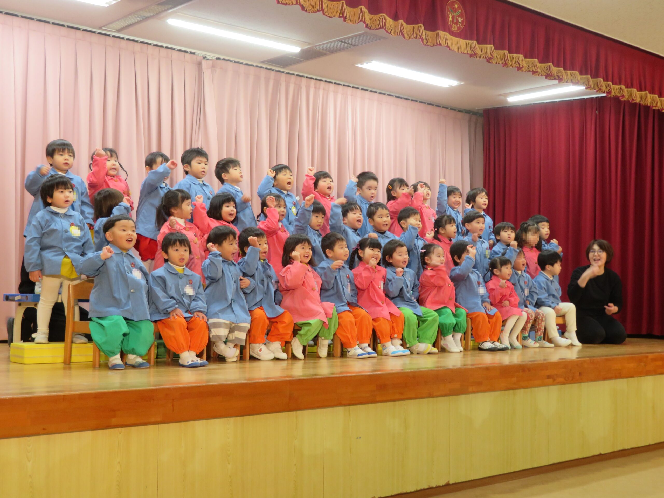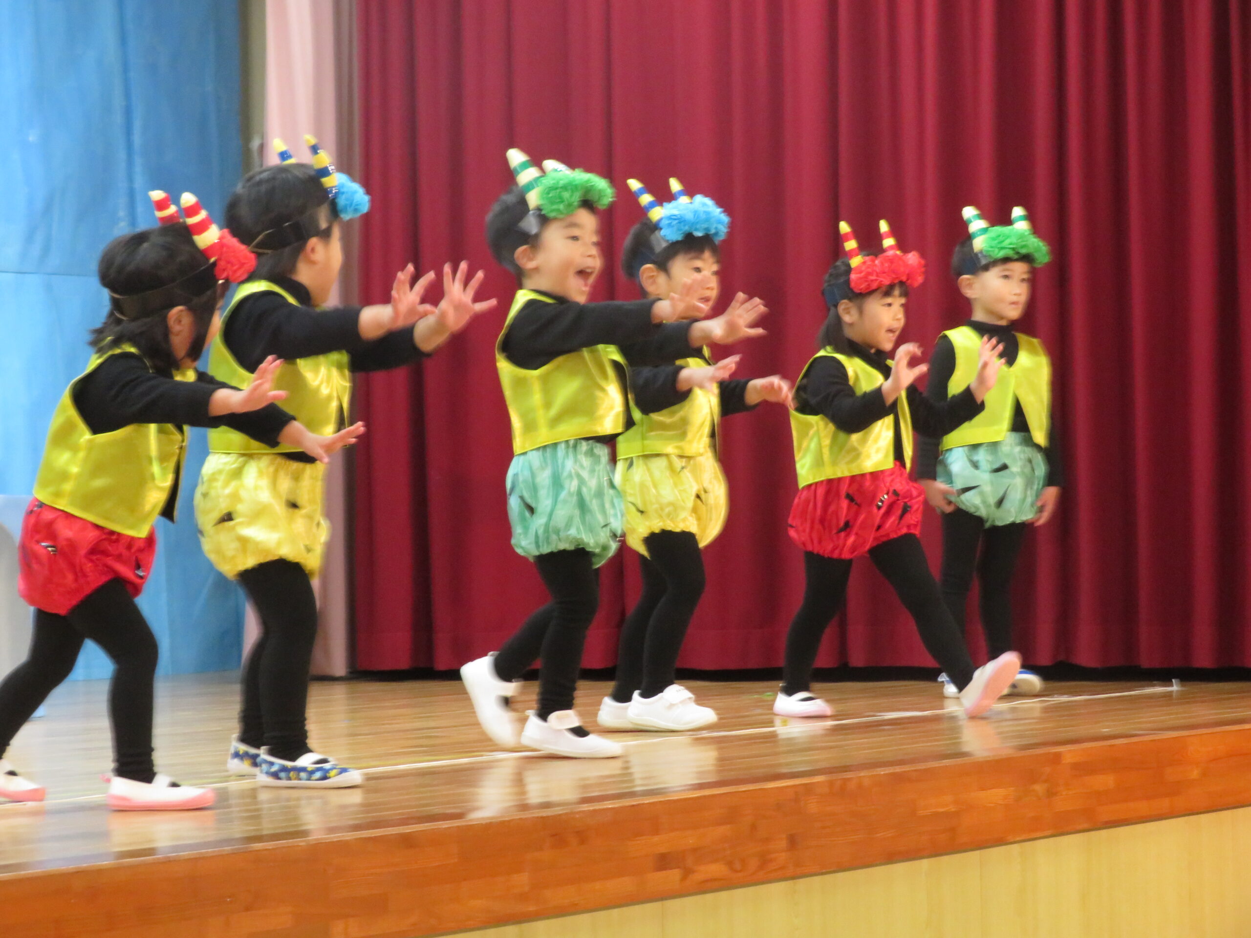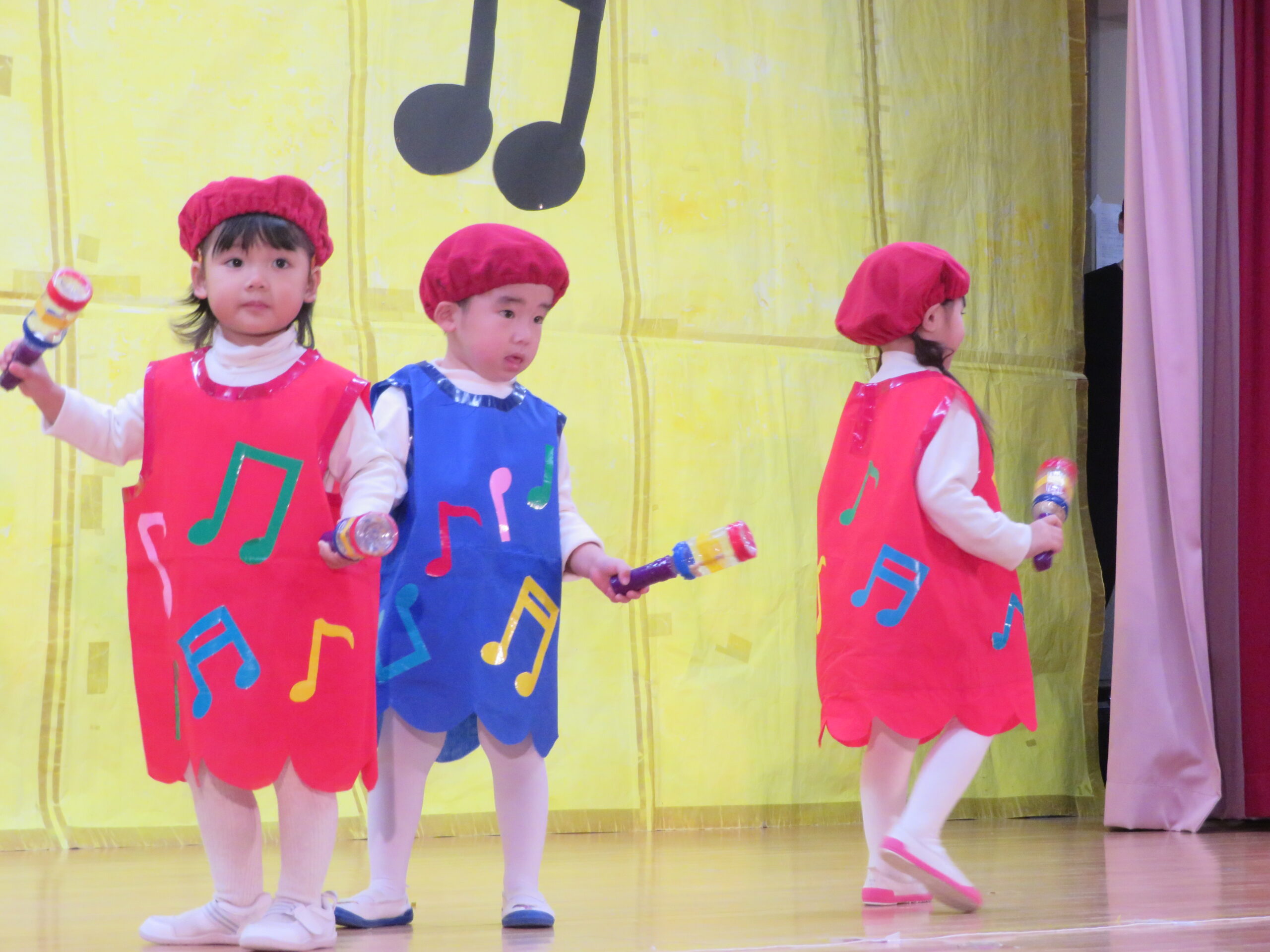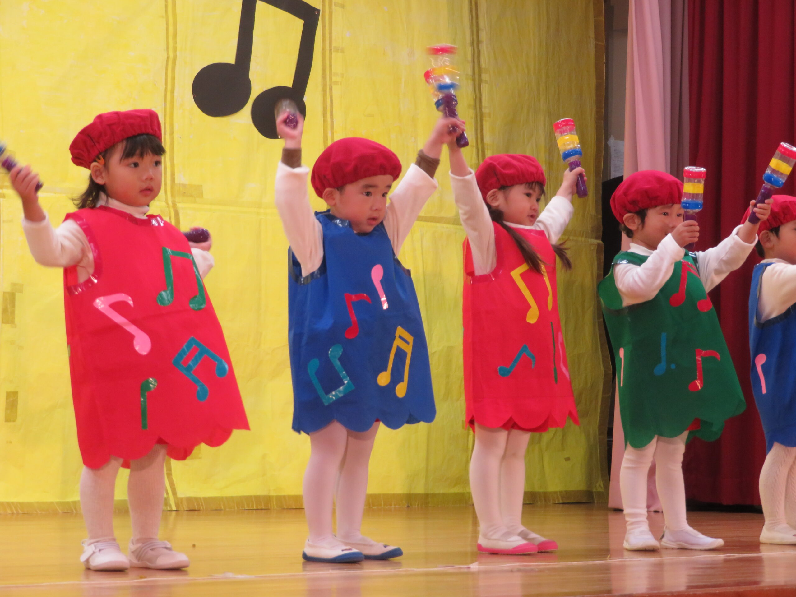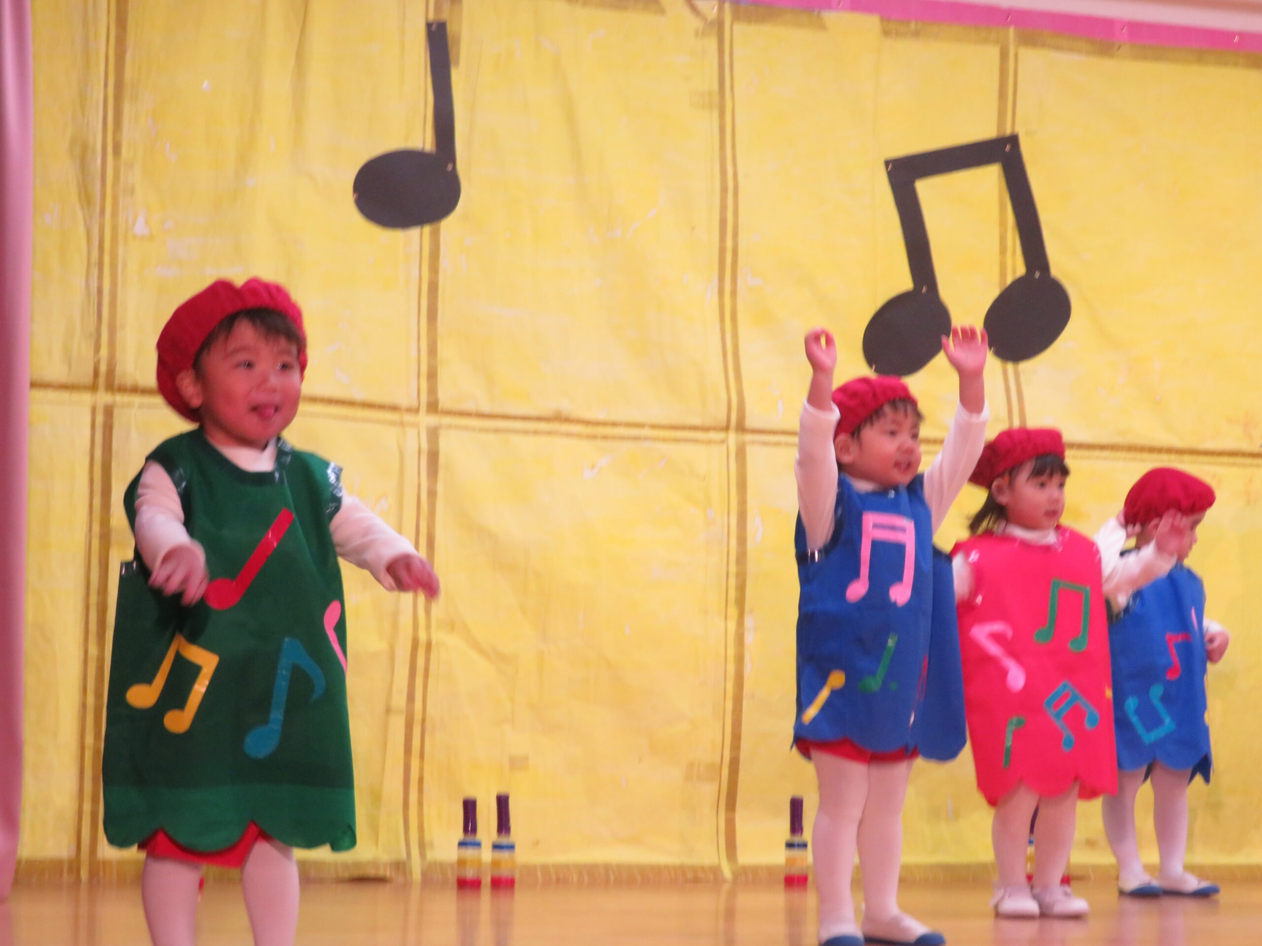 12月7日(日)、年少々・ちゅうりっぷ1組・2組の発表会がありました。遊戯[かみなりビリビリ」「音のマーチ」「フルーツ・フルーツ」「プリンであらもーど」と合唱「クリスマス」「サンタクロース」などを発表しました。観客の皆様からたくさんの温かい拍手をいただきました。