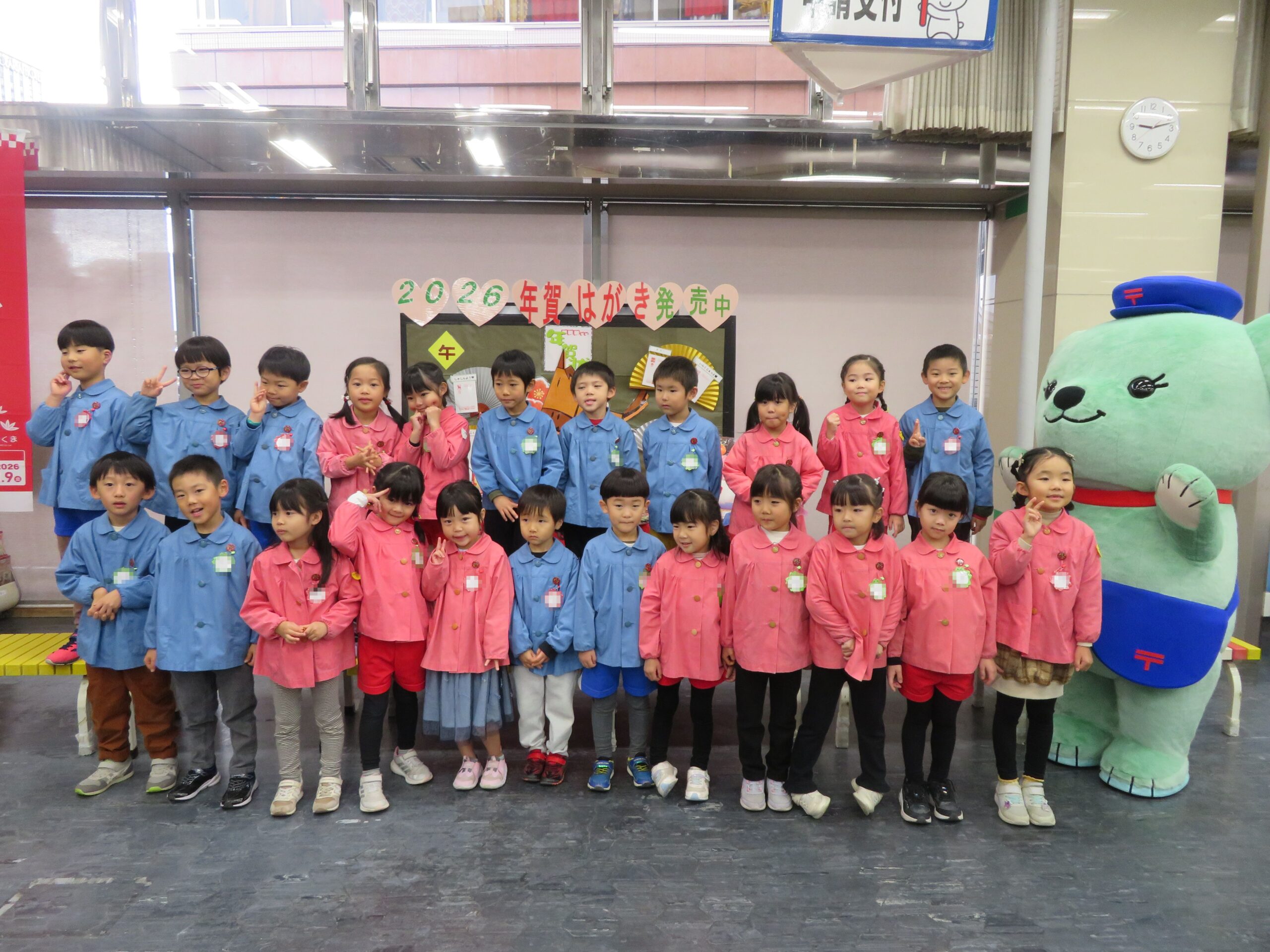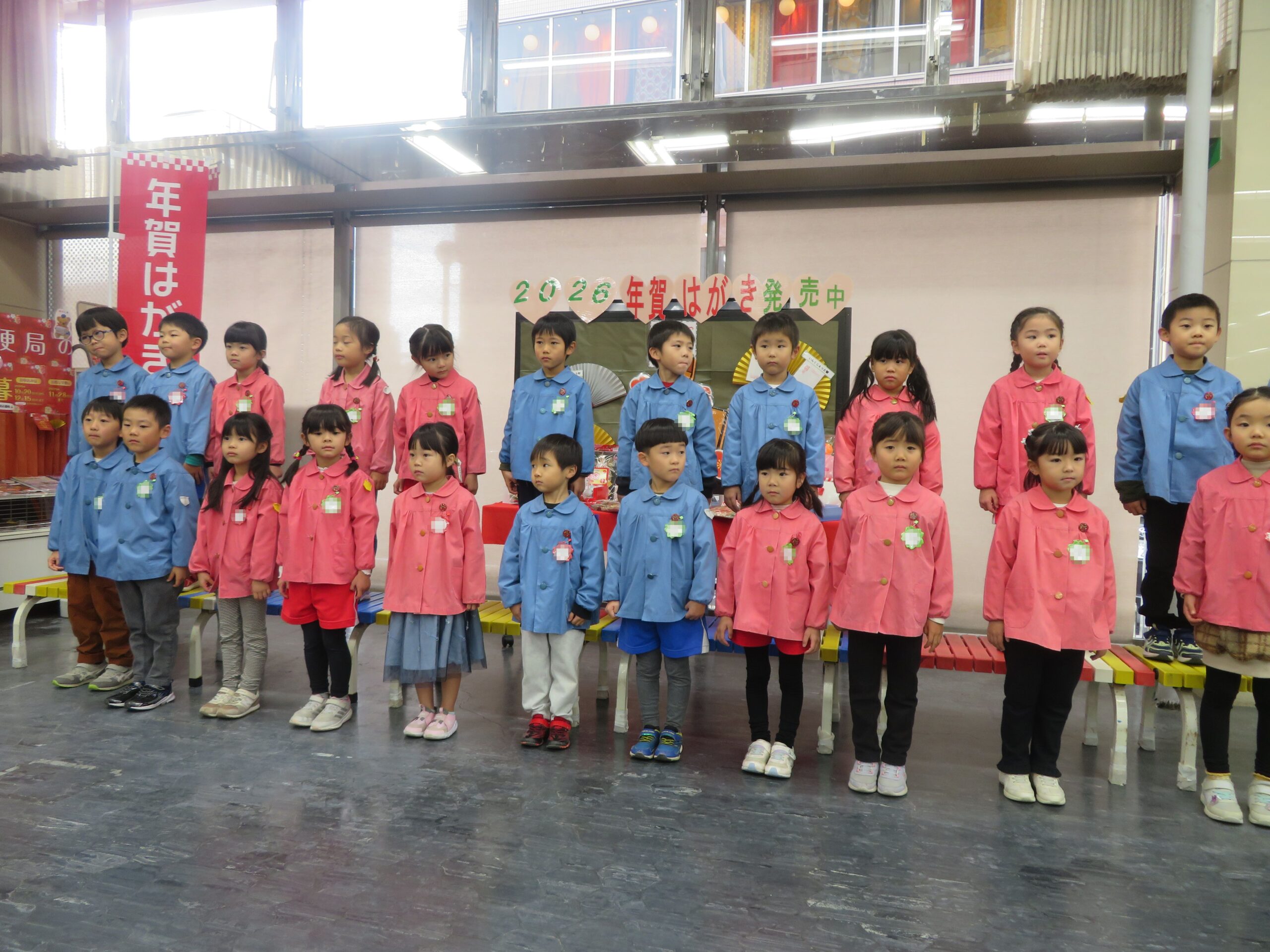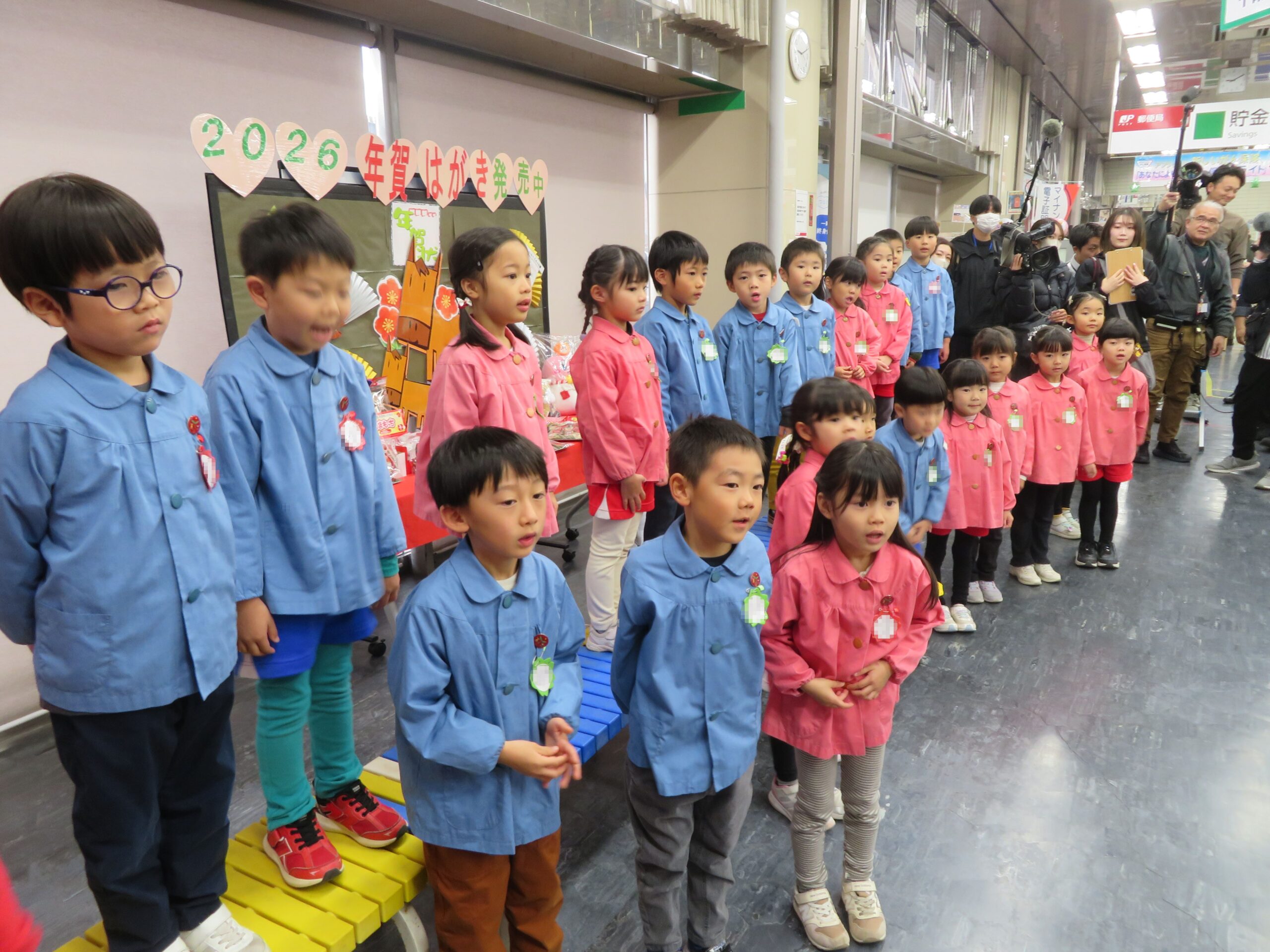 12月15日(月)、中央郵便局の「2026年用年賀葉書引き受けイベント」に園児が参加しました。子どもたちは、「やぎさんゆうびん」「おしょうがつ」の歌を発表しました。その後、園児は自分で作成した年賀状をポストに投函しました。