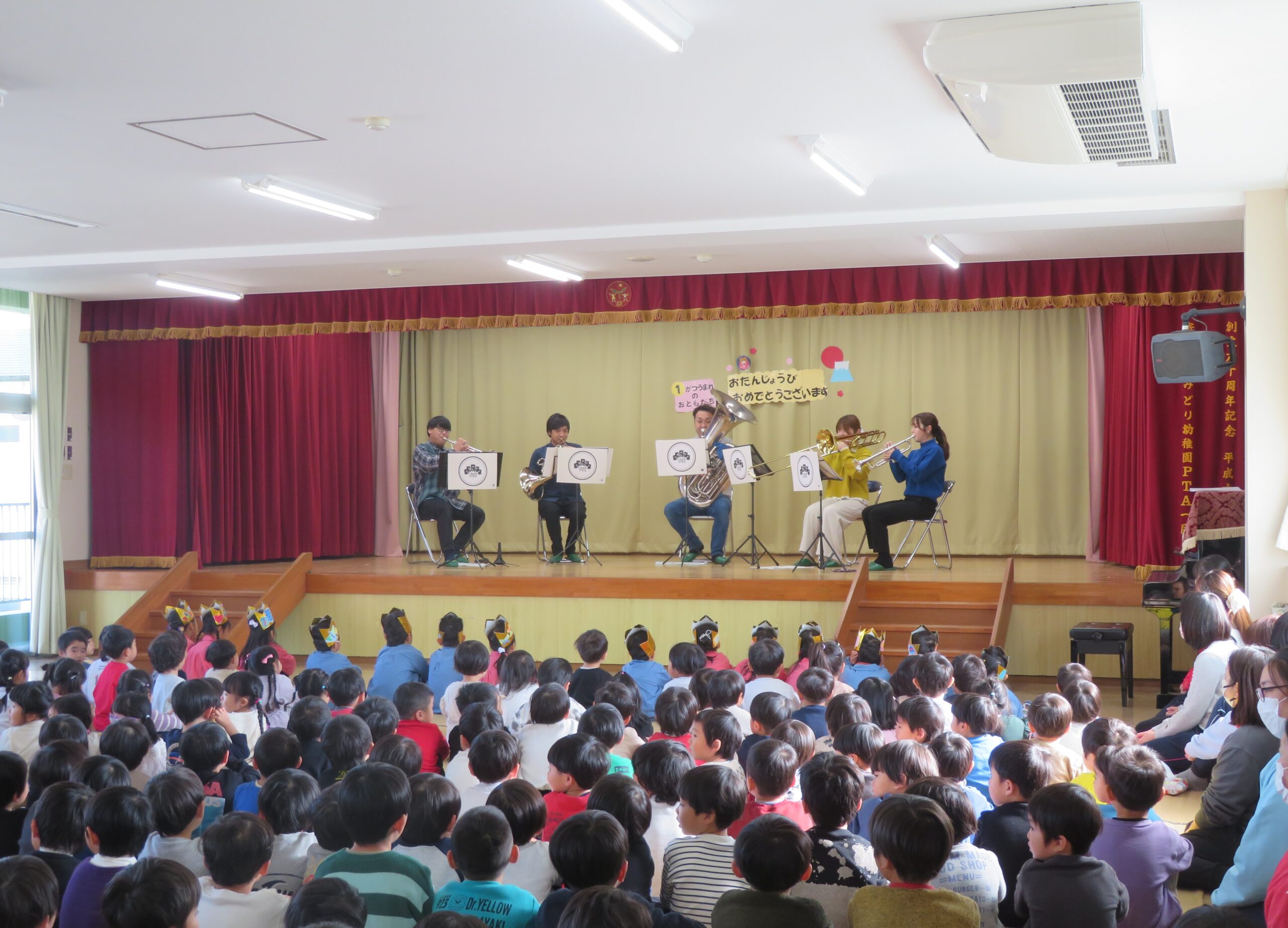 1月生まれの誕生会がありました。みんなでお祝いをして素敵な時間でした。そして「黒豚ブラス」の皆さんが演奏をしてくださり、楽しい誕生会になりました。