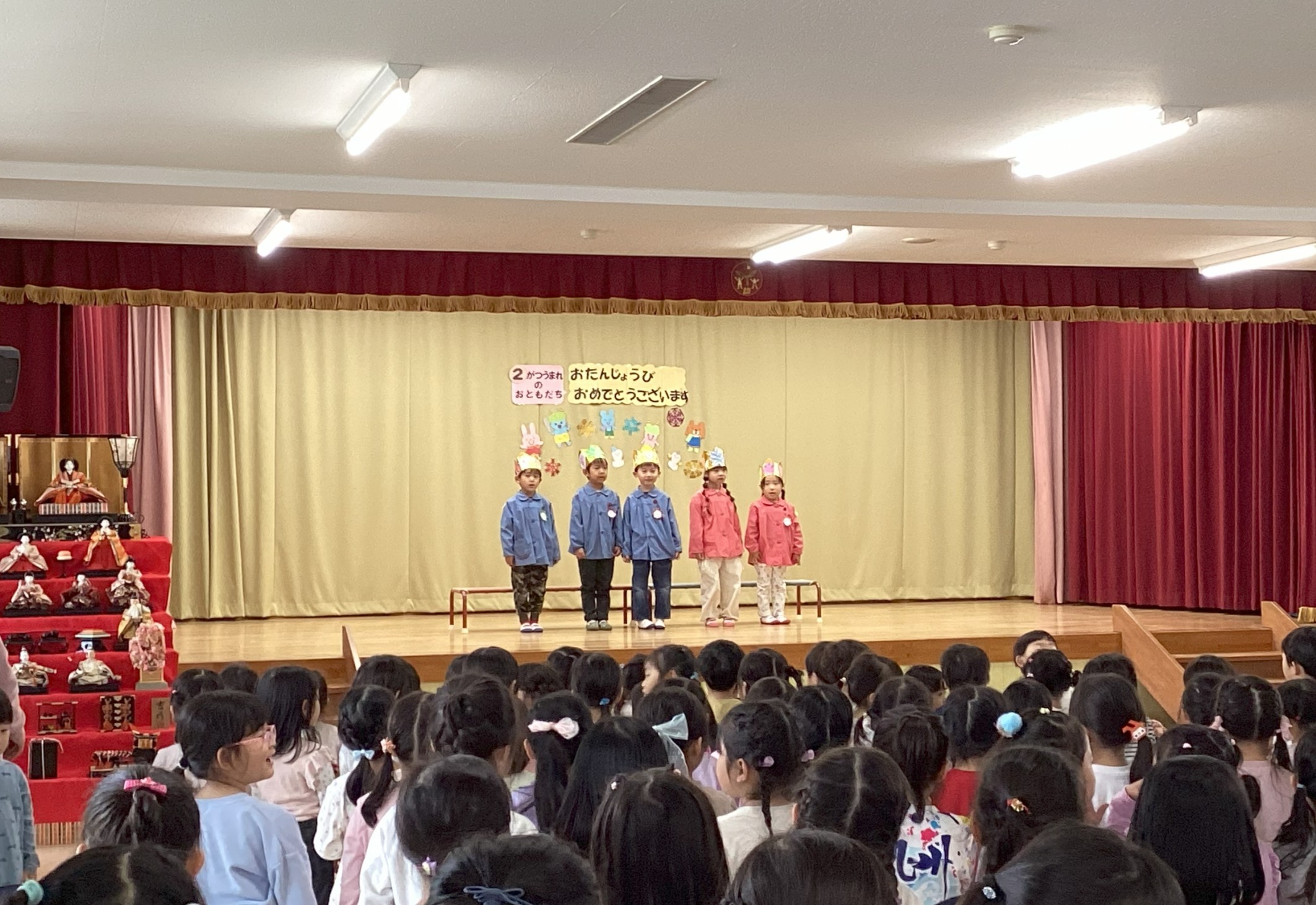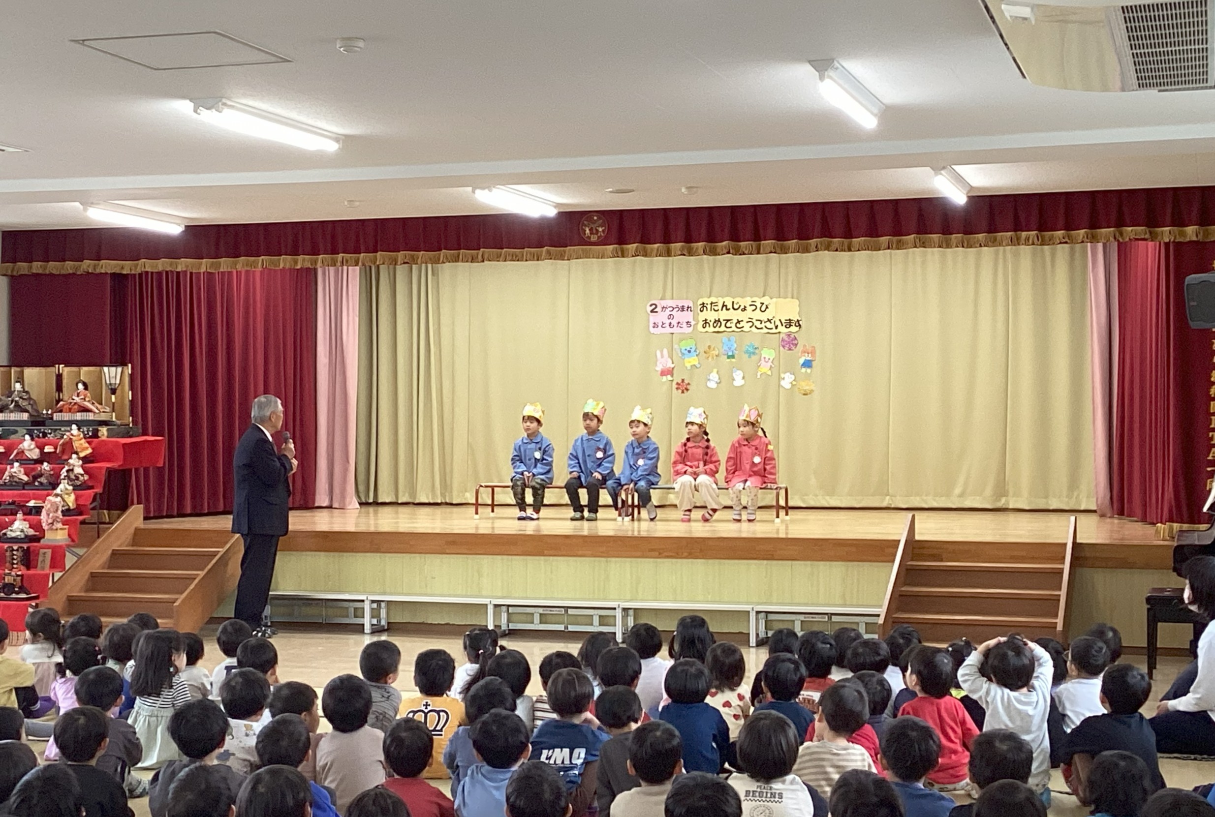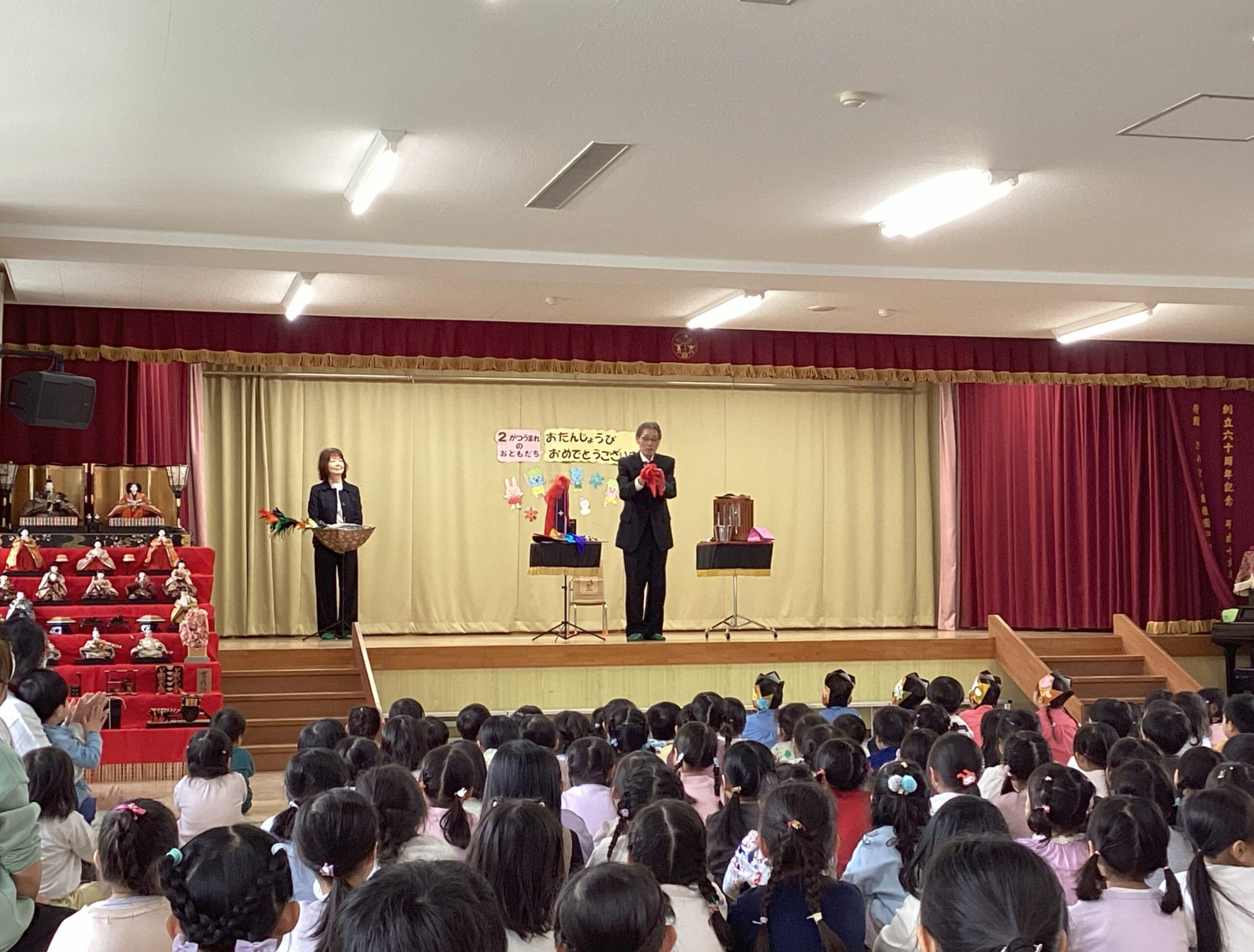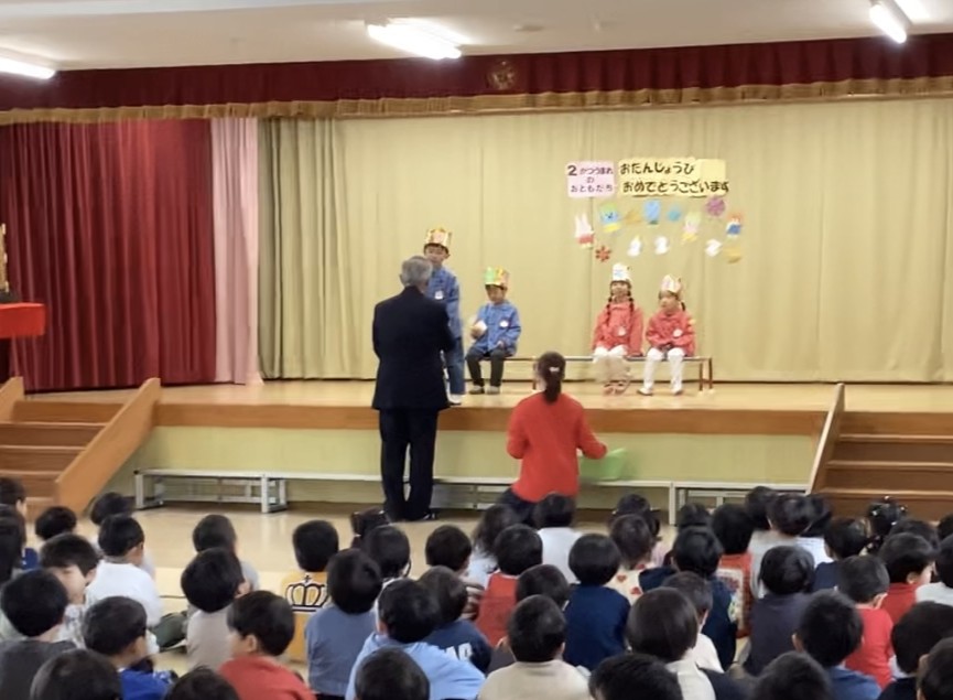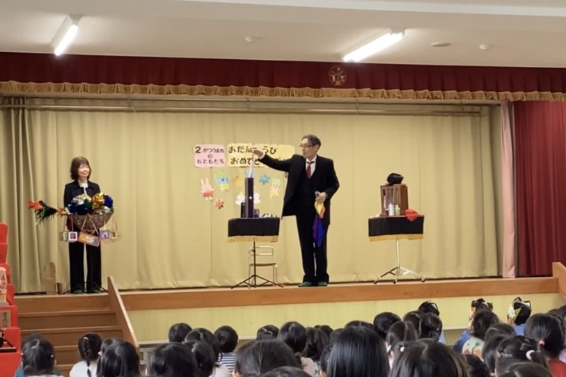 2月生まれの誕生会がありました。誕生児の子どもたちは自分のクラスや名前、頑張っていることなど、元気に発表することができました。そしてみんなでお祝いをして素敵な時間でした。マジシャン大迫先生から手品のプレゼントもあり、興味津々で見ていました。