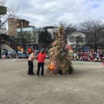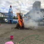 立派なやぐらができ、お正月に飾ったしめ縄や門松等を持ち寄り、やぐらに取り付け、今年1年の幼稚園の発展、子どもたちの無病息災等(特に新型コロナウイルスの一日も早い終息)を祈念し、点火しました。今年もきっといい1年になると思います。