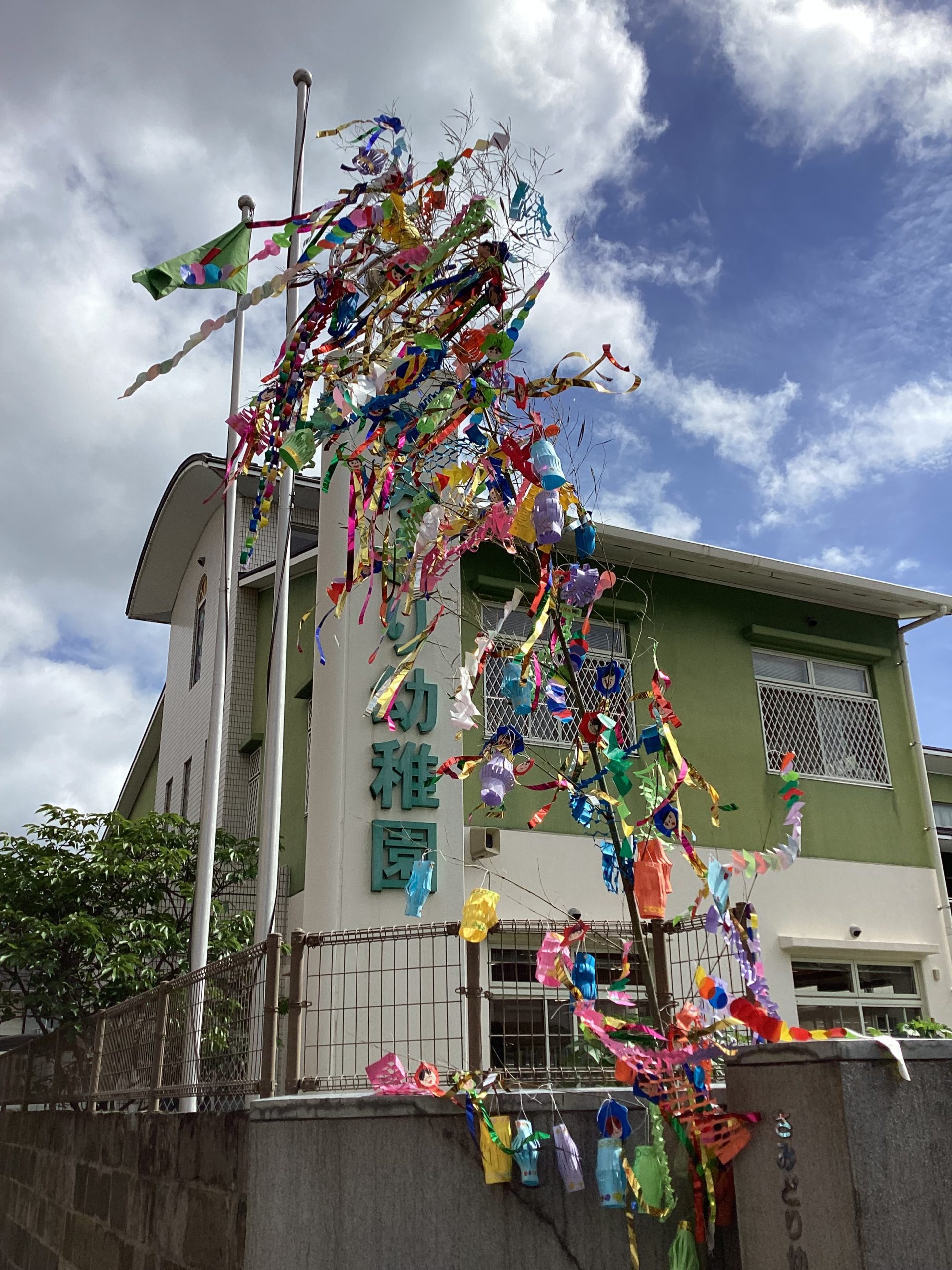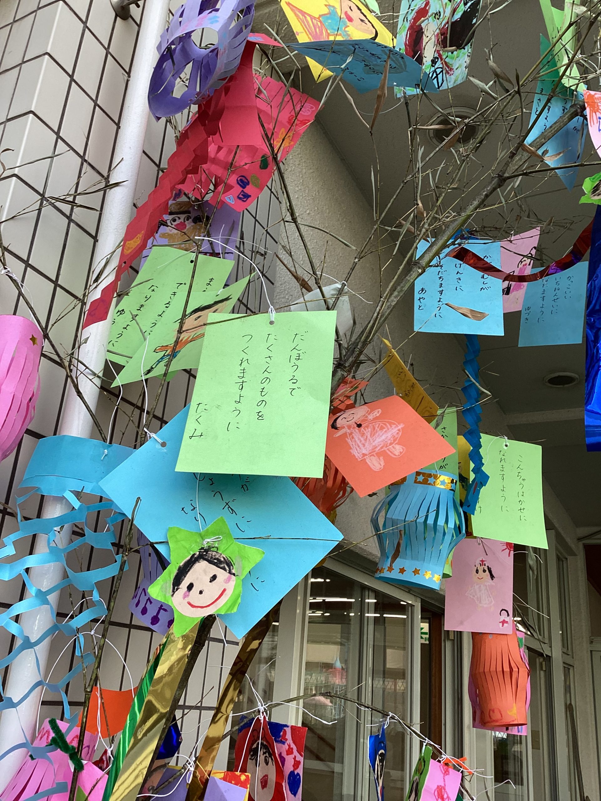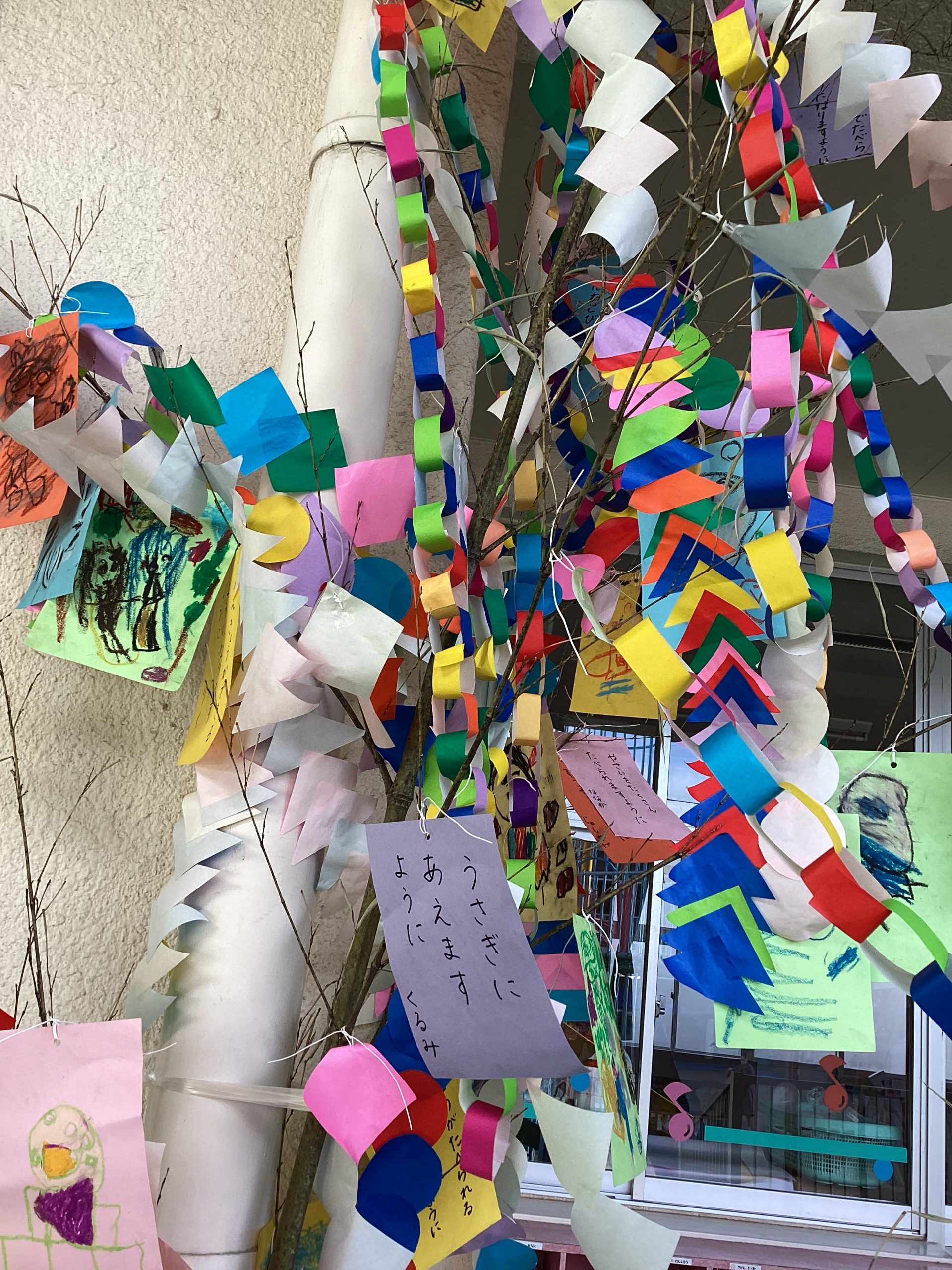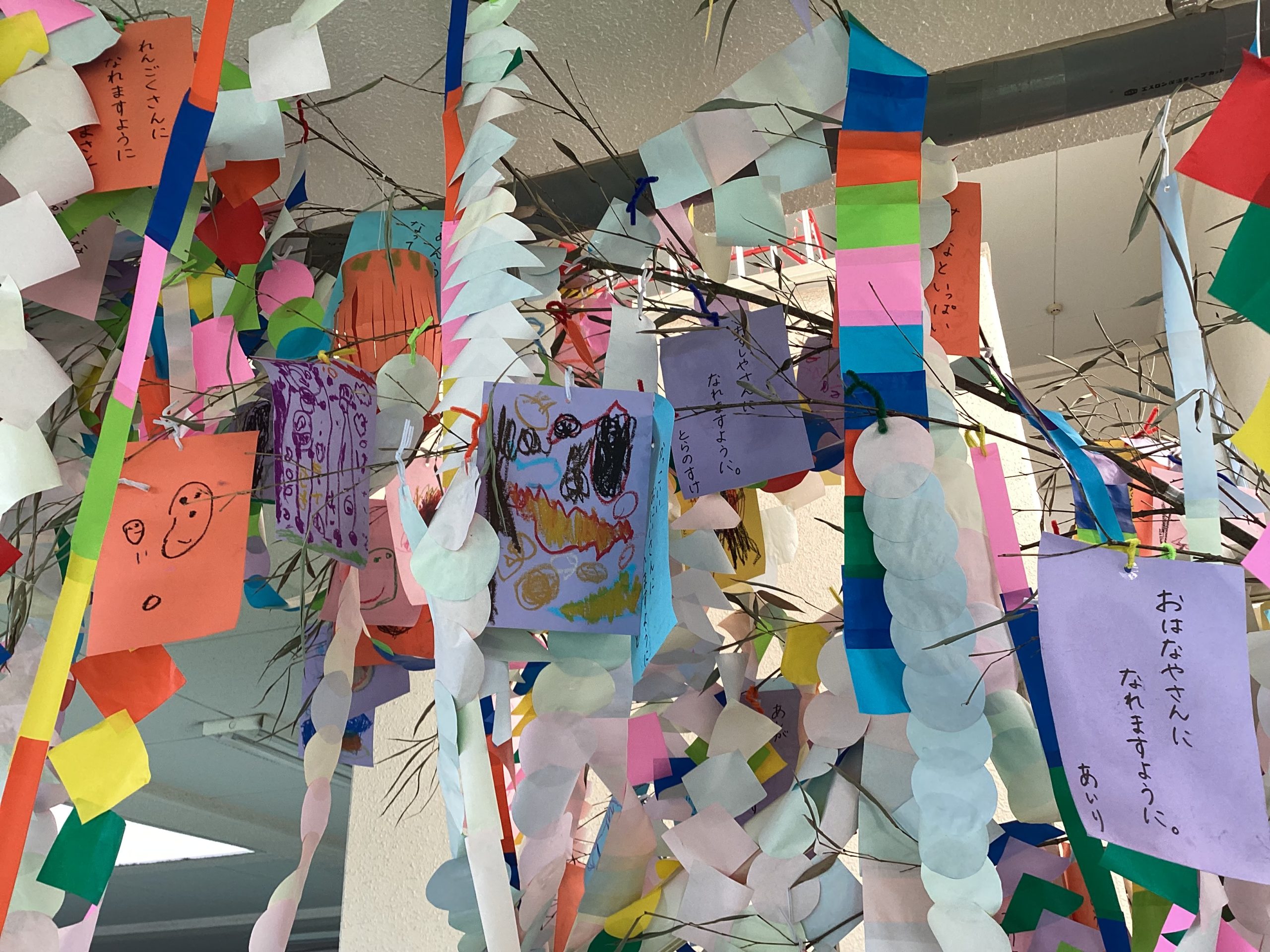 お話をしてくださいました。全員真剣に聞くことができました。子供たちの色々な願いなどを描いた七夕飾りを幼稚園内に飾りました。