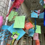 彦星と織姫のお話でした。そのあと、短冊や、提灯、蜘蛛の巣、流れ星、まる、さんかく、しかくのかざりなど、七夕飾りについて