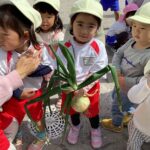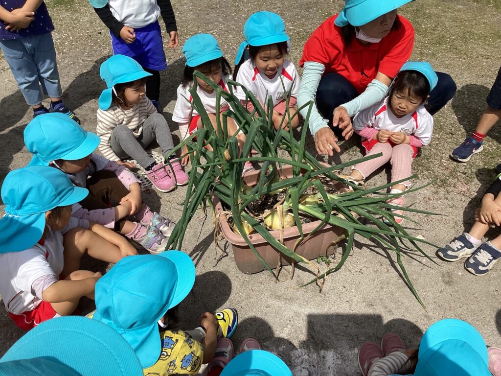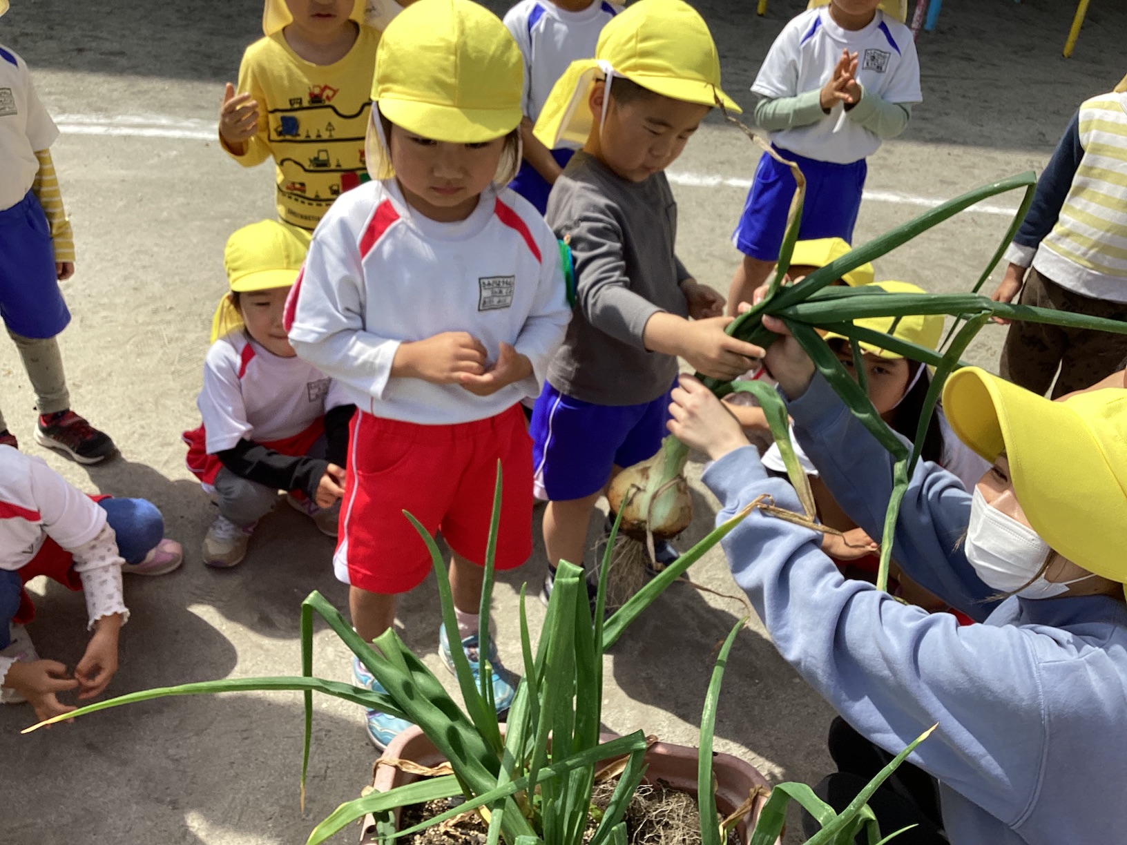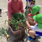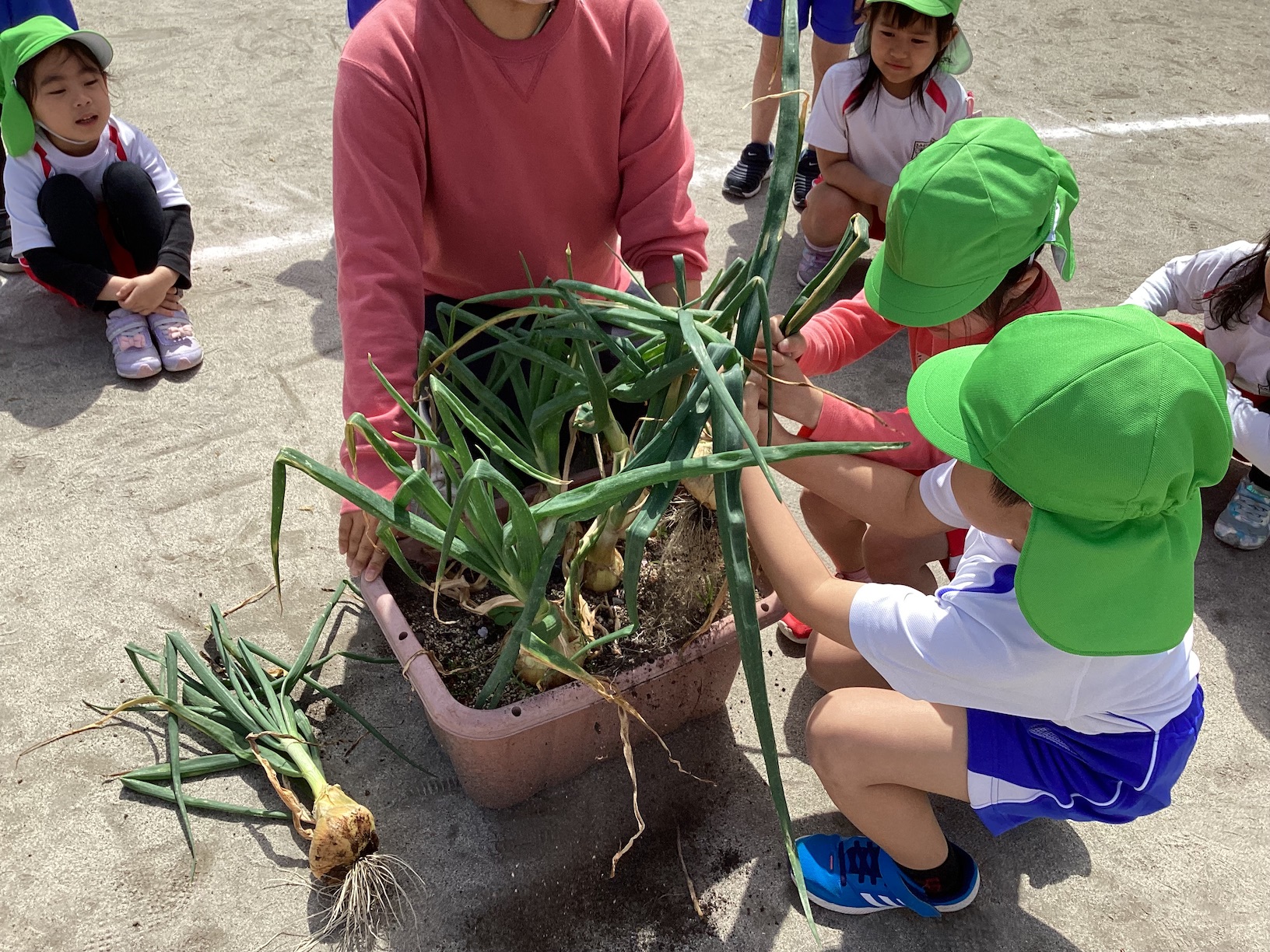 昨年の11月末に、プランタに植え付けた玉ネギが大きく生長し、子どもたちで収穫しました。ソフトボールの球みたいに大きくなっている玉ネギを数人がかりで引き抜くと、玉ネギの匂いがプーンとして、涙する子どももいました。