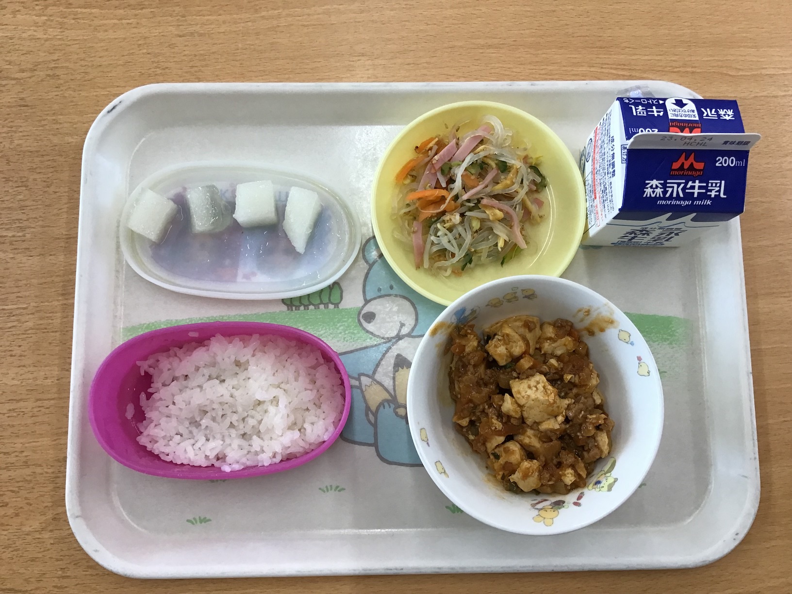 4月17日(月)には、給食の先生方に、玉ネギ入りの麻婆豆腐を作っていただきました。