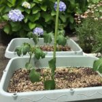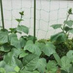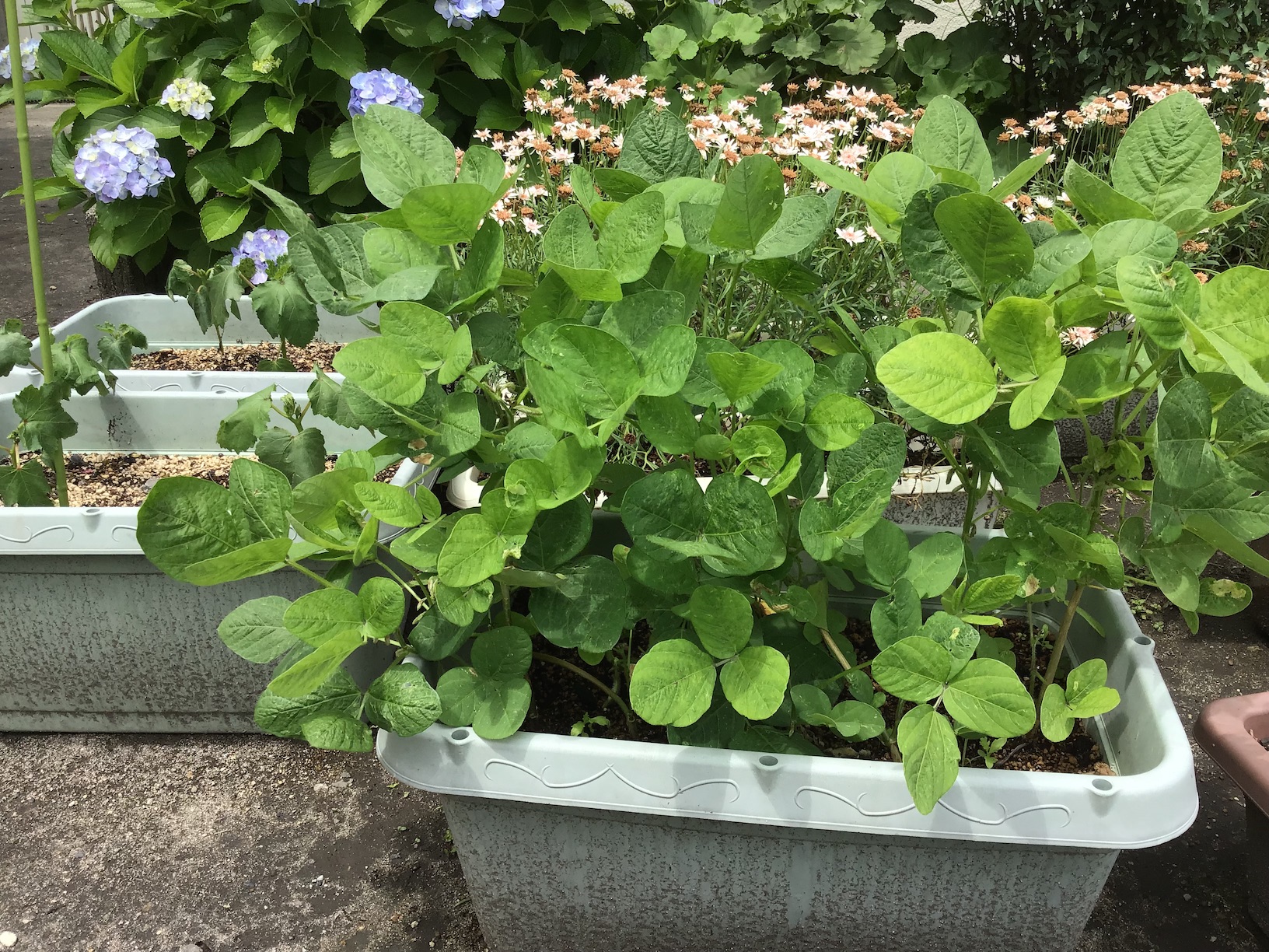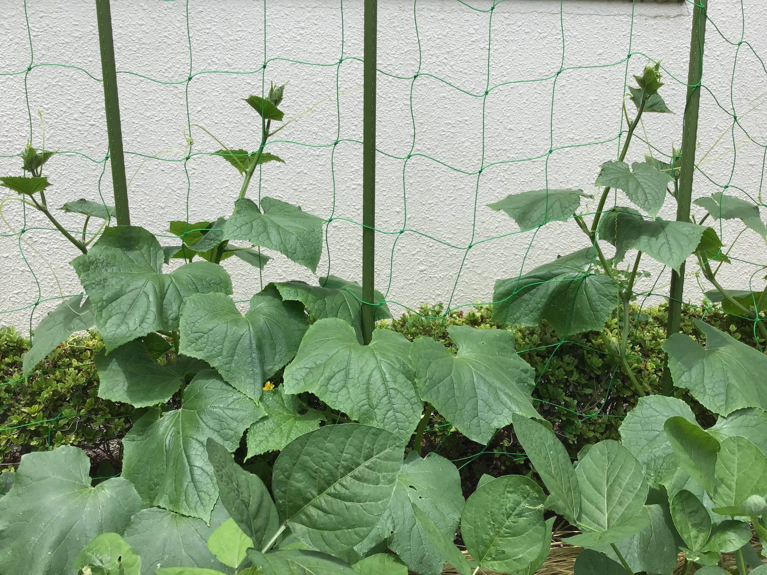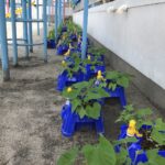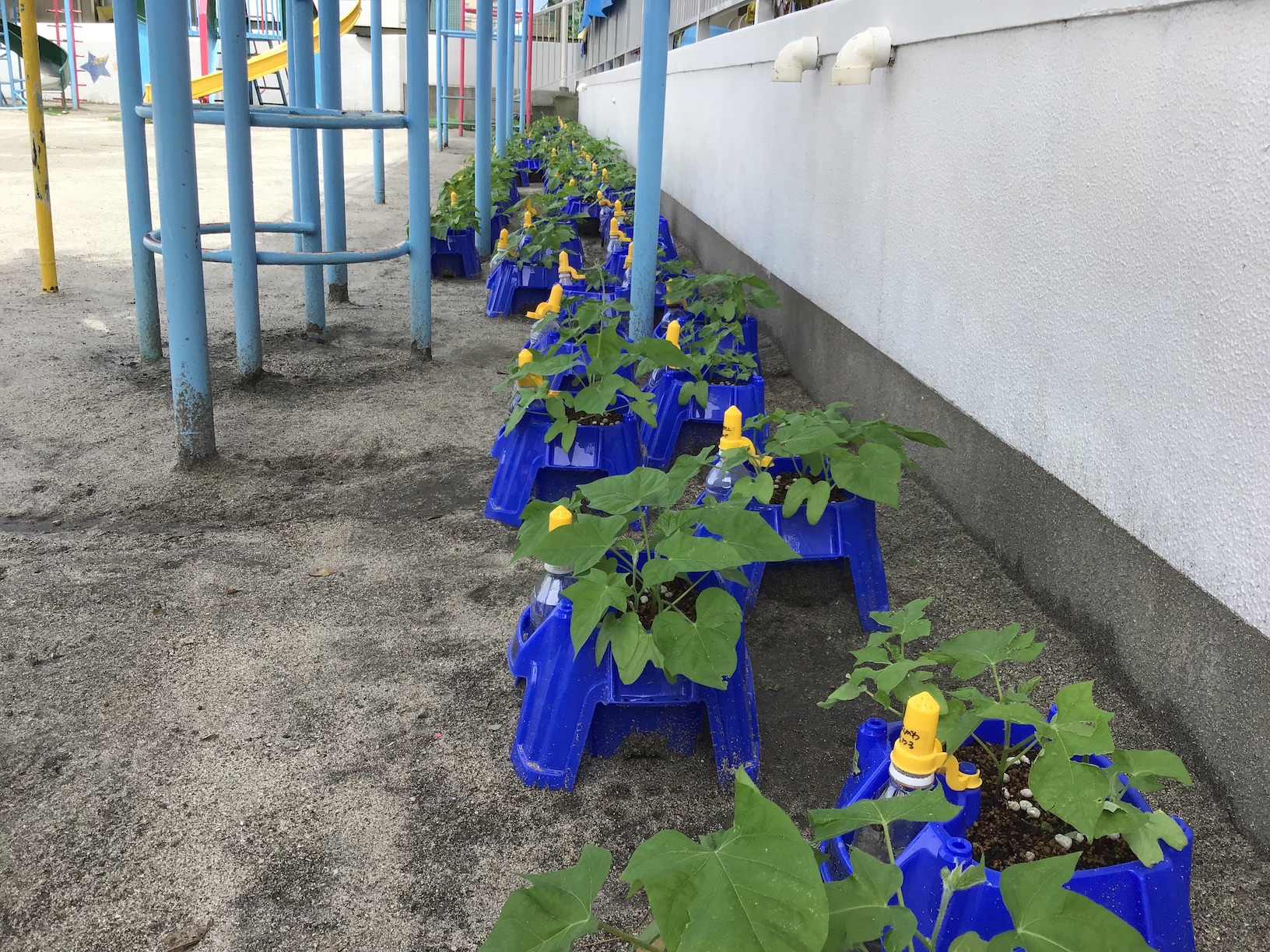 食育栽培がスタートしています。園庭の花壇には、キュウリや枝豆が生長しています。