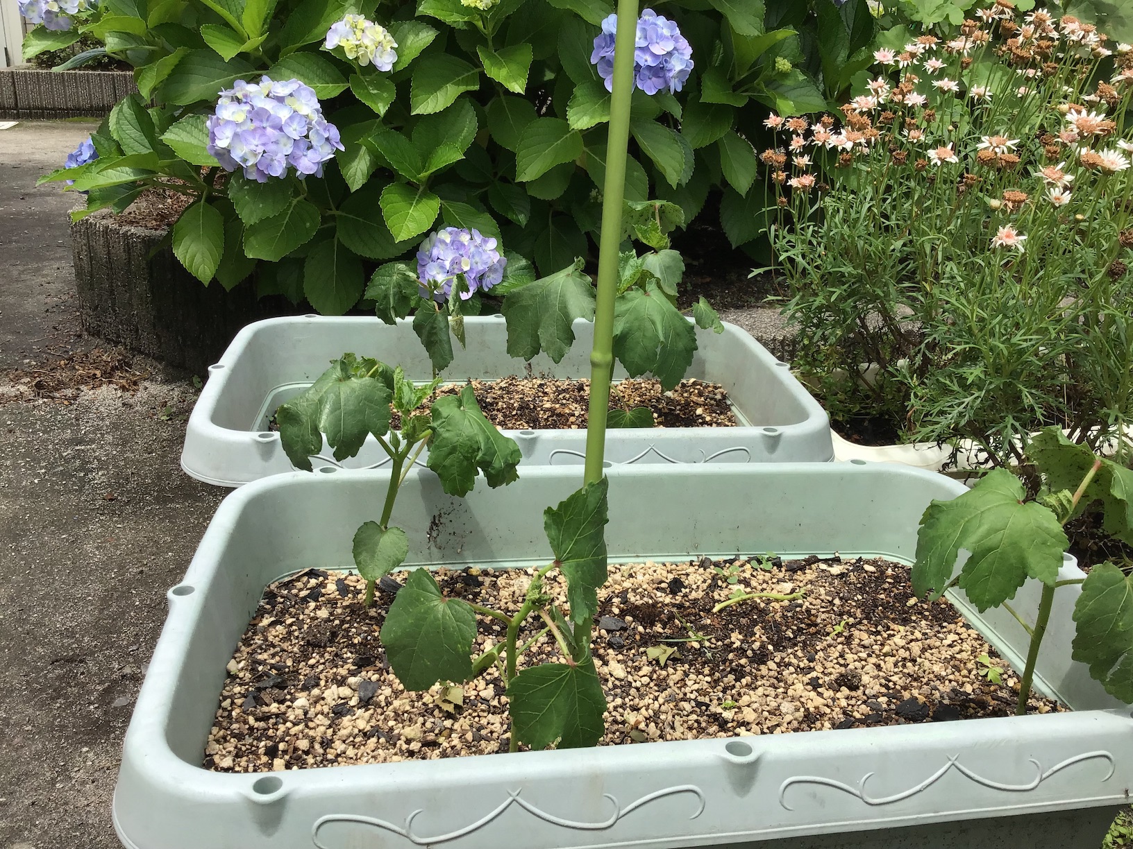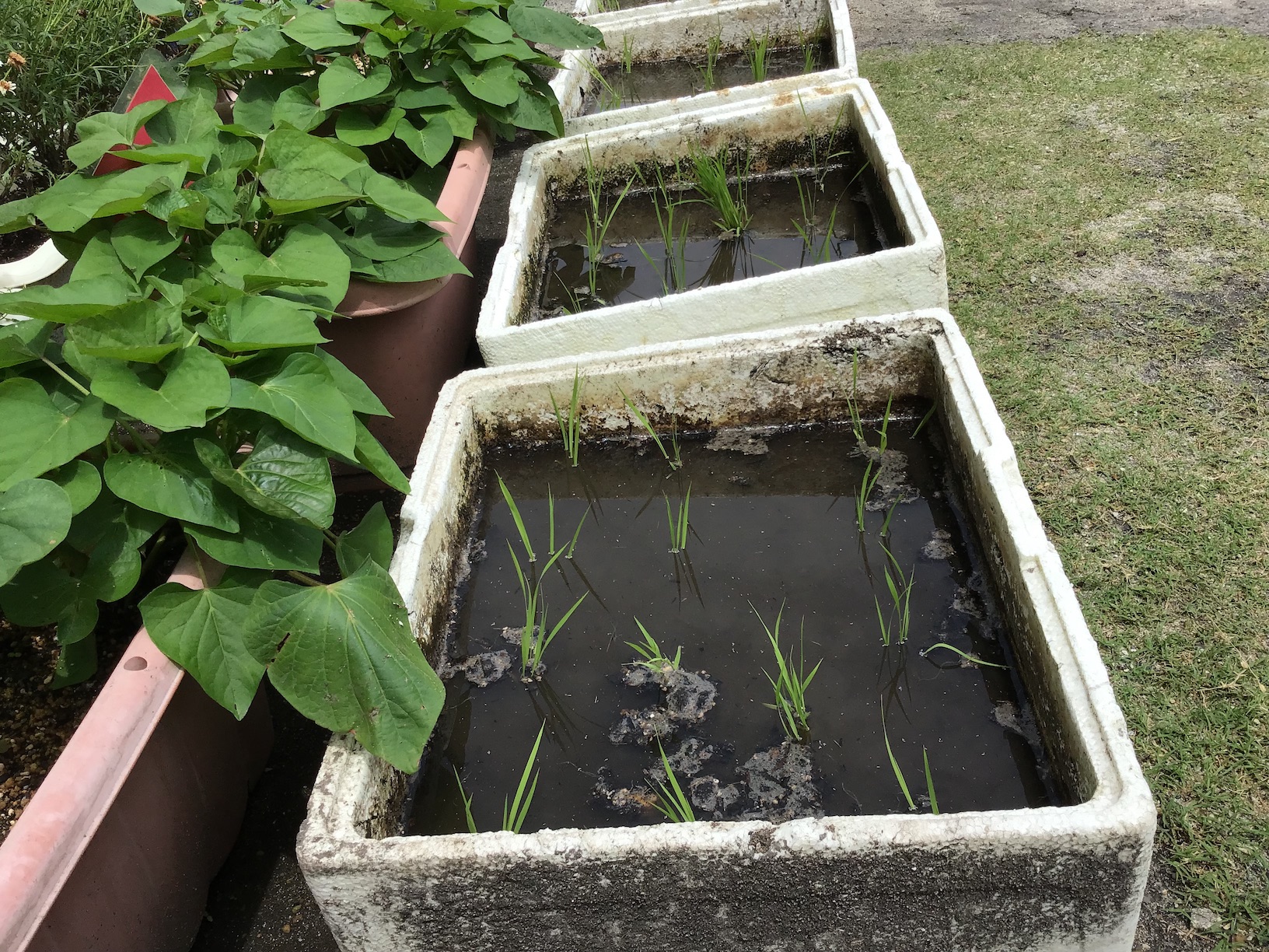 プランターには、オクラや芋、稲も植えられています。また、子どもたちが楽しみにしている10月の芋掘り用の芋の苗は、犬迫の広い畑に植えられています。これからこれらの苗の生長を楽しみにしながら観察していきます。