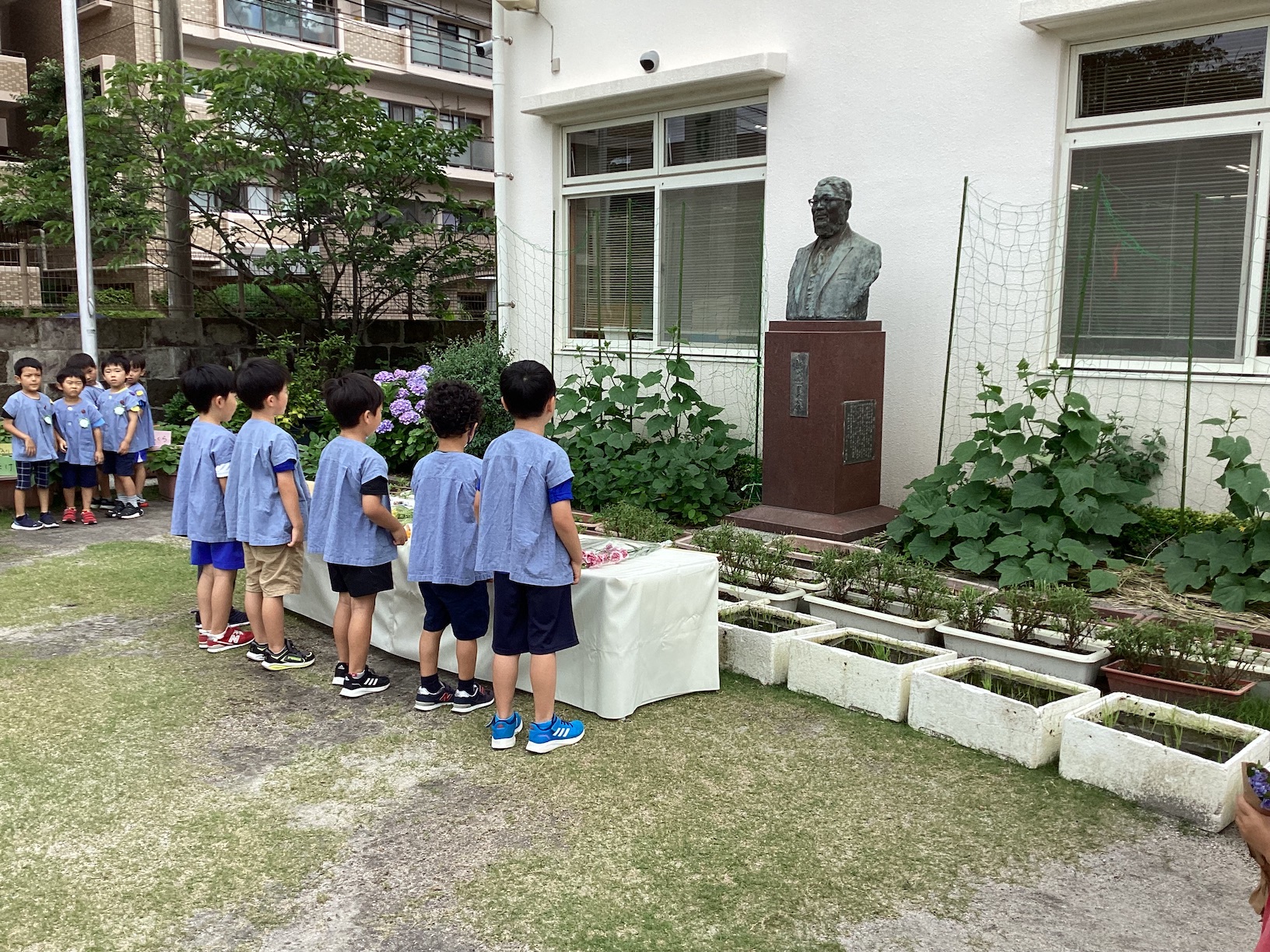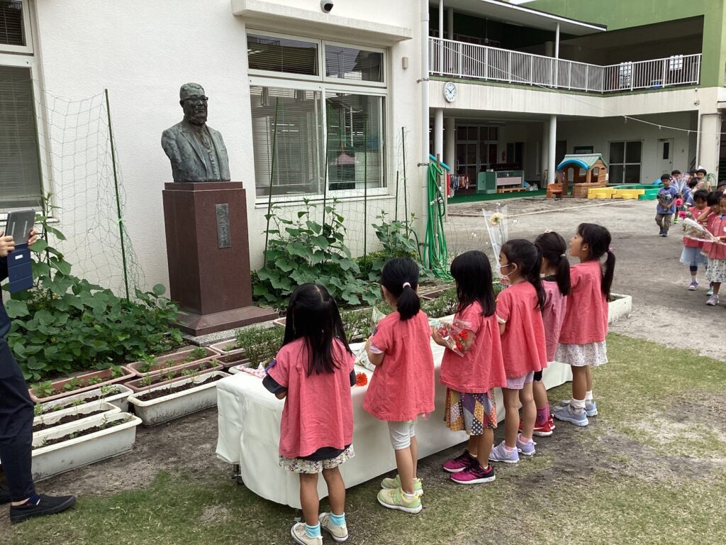 園庭の新川近義先生の胸像に、子どもたちが持参したあじさいやガーベラ、ひまわりなどの季節の花を供えました。