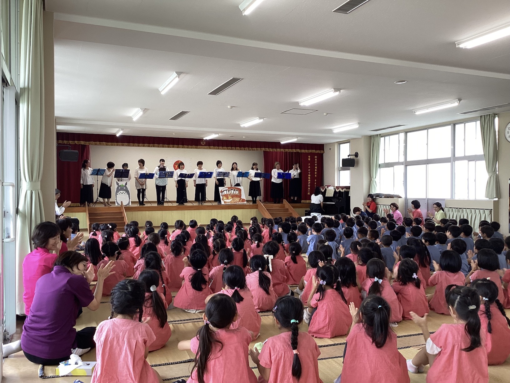 その後、遊戯室では、園長先生の卒園生の新川靖博理事長先生や山野真理さん、川畑和也さんのお話やお母さんコーラスさみどりの歌でお祝いしました。コーラスさみどりさんは、誕生日の歌でオープニング。園歌、アンパンマンの歌と続き、この時期にふさわしい「にじ」の合唱。終わりの曲「となりのトトロ」「さんぽ」では、子どもたちも一緒に歌って盛り上がりました。リクエスト曲は「勇気100パーセント」。子どもたちの知っている曲がたくさんあり、子どもたちも一緒に口ずさみながら楽しくおごしました。