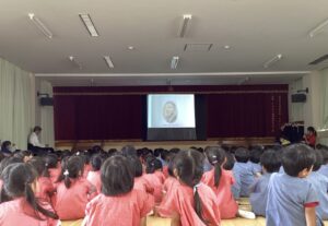 最後はプロジェクターの写真を見ながら、さみどり幼稚園の77年の歴史について勉強しました。30周年、50周年、60周年、70周年と時を重ねてきたさみどり幼稚園の歩みを熱心聞いていました。最後はお誕生日おめでとうの気持ちを込めて「進んでさみどり幼稚園」を歌って終わりました。