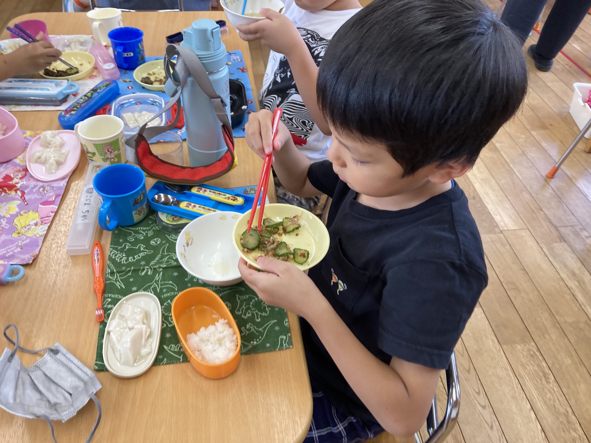 1回目収穫した10本のキュウリは給食室であえ物にしてみんなでいただきました。