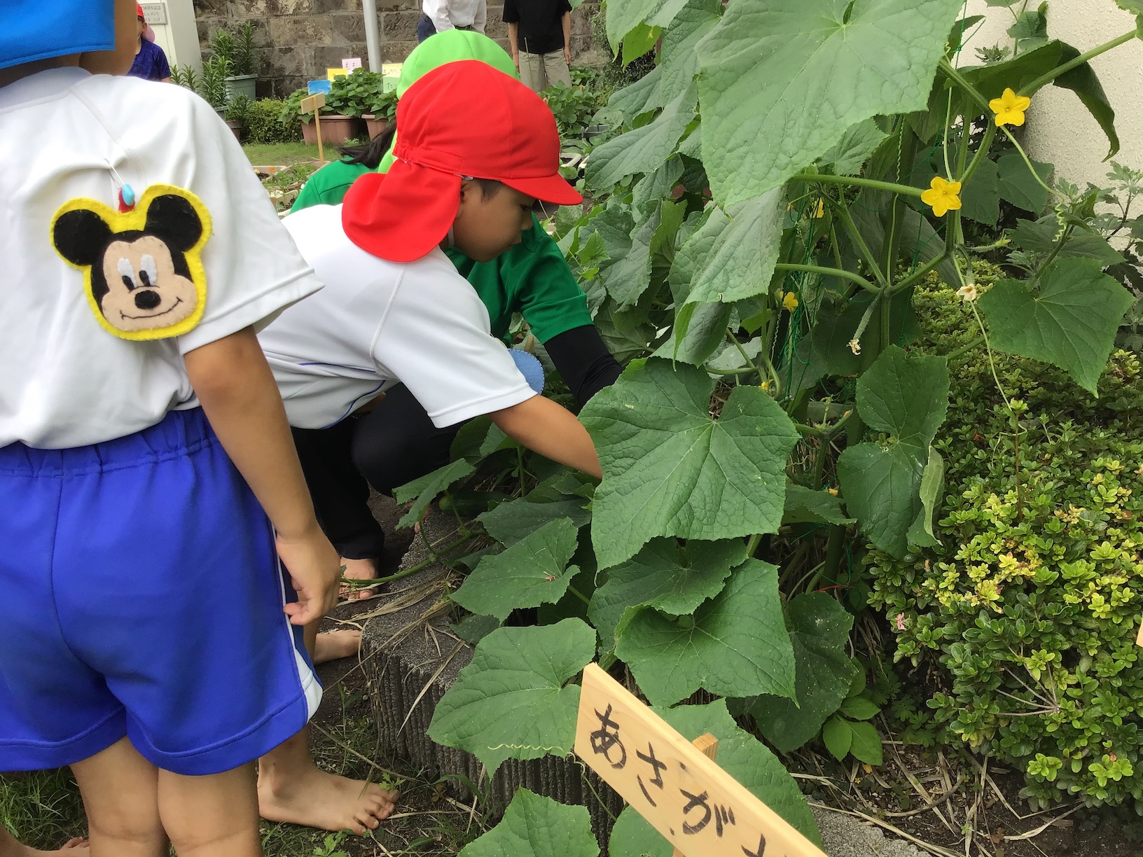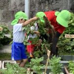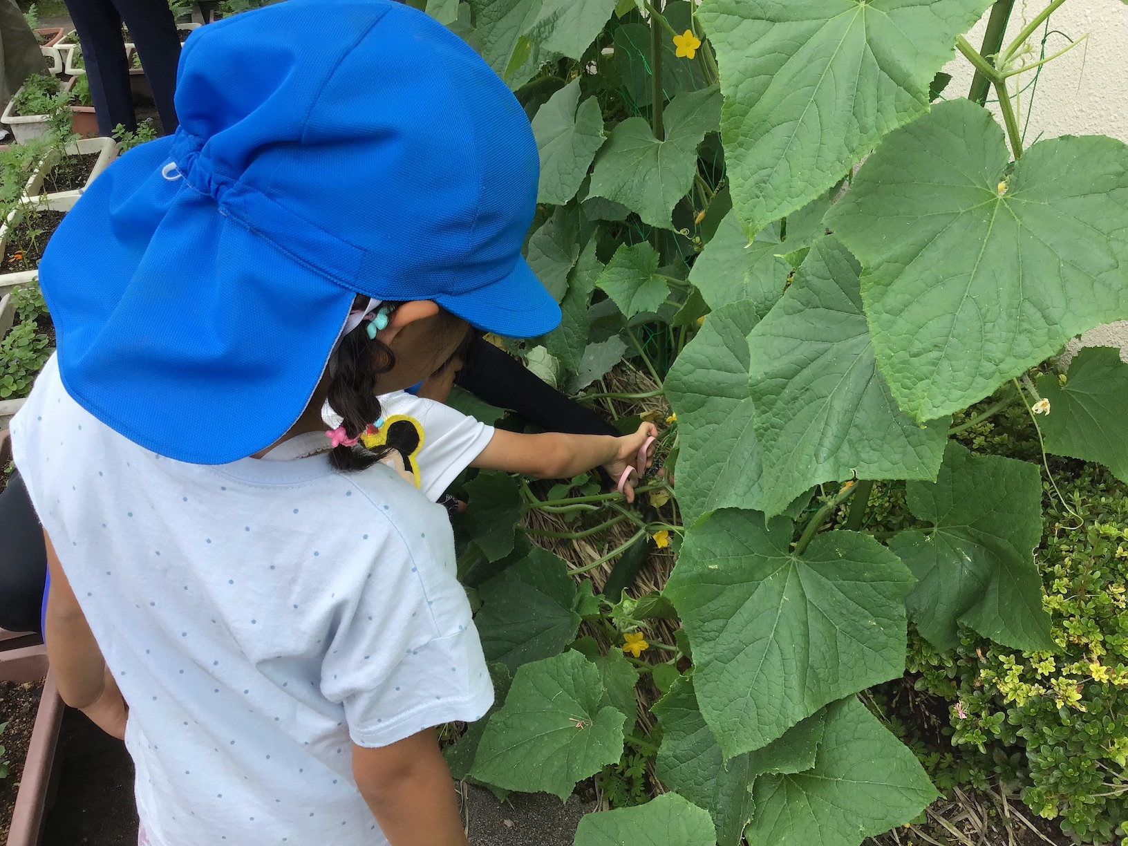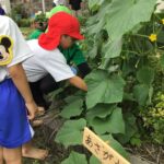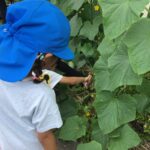 年長さんが6月27日に2回目のキュウリちぎりをしました。枝豆も一緒に収穫しました。
