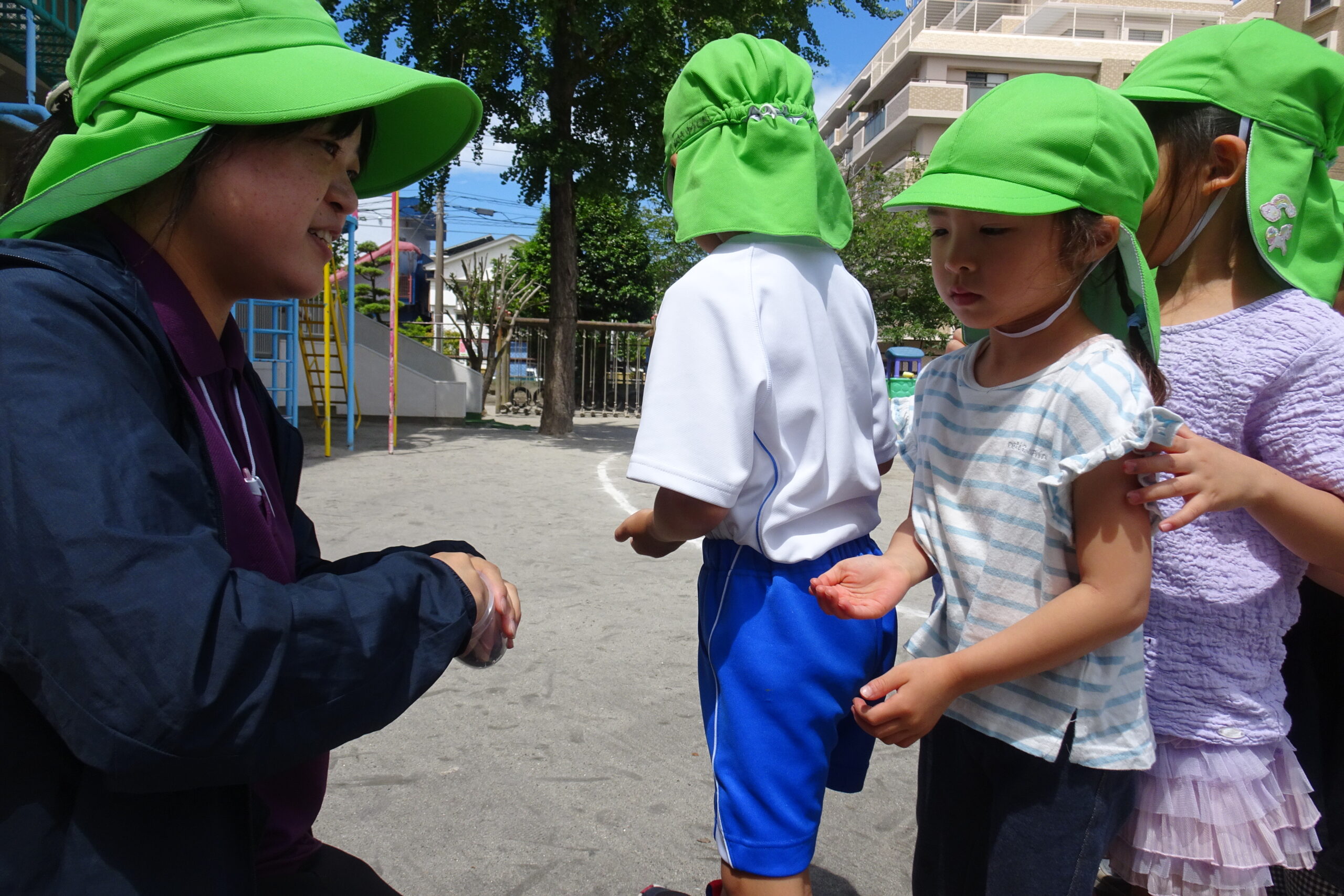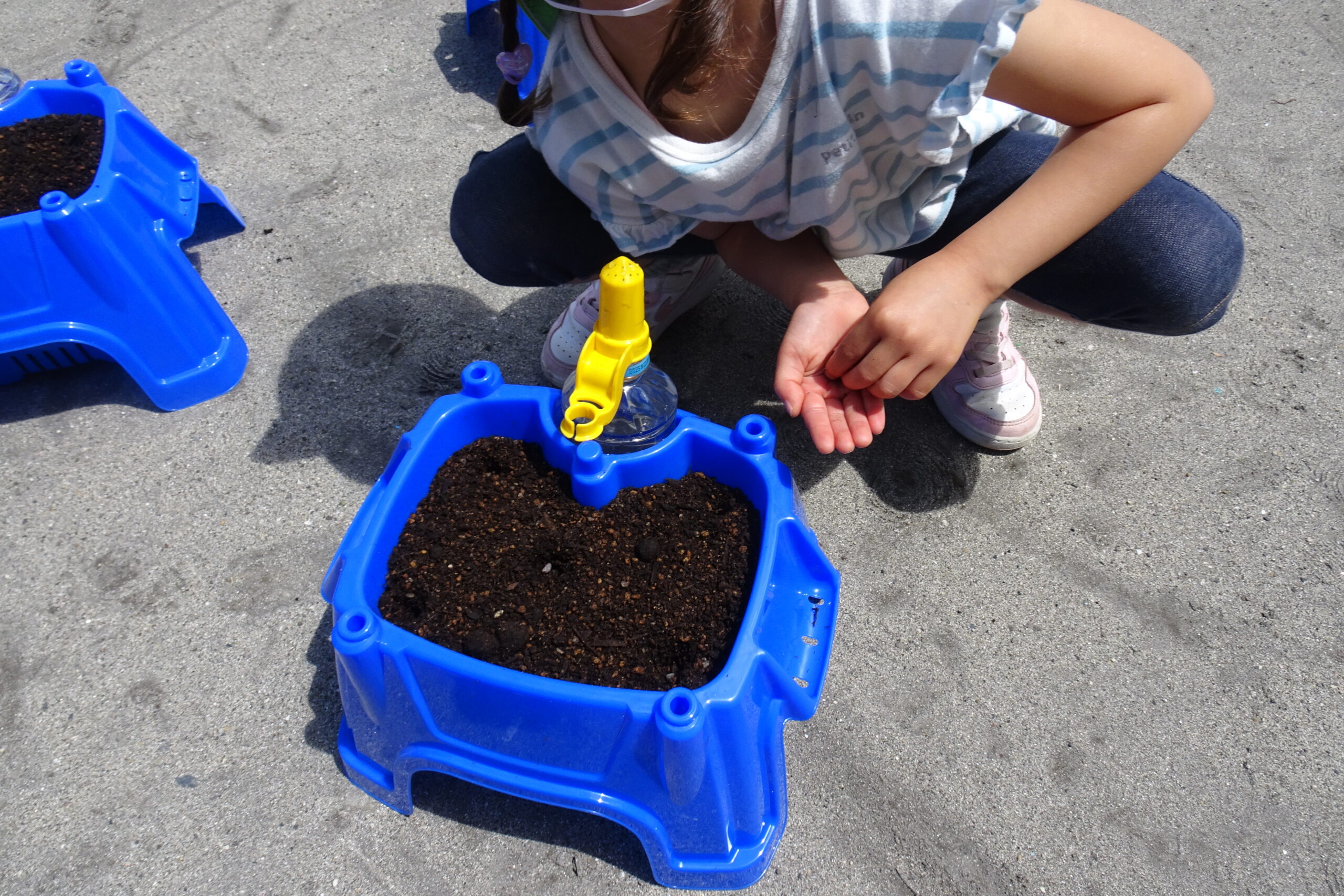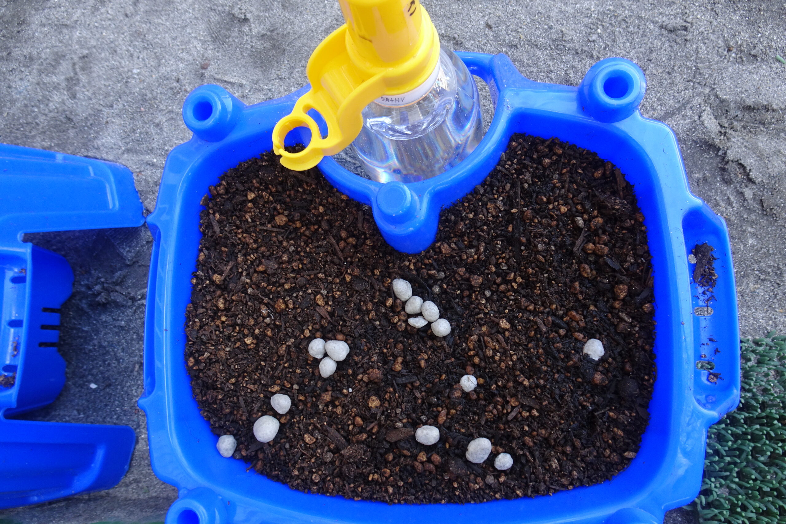 一人一鉢栽培で、朝顔の種まきをしました。まず鉢に花の土を入れ、土に5カ所の穴を開けます。そこに、朝顔の種を1個ずつ5個まき、土をかぶせました。更にその横に白い粒の玉肥料を置きました。そして、家から持ってきたペットボトルに水を入れ、鉢に取り付けました。植え付けの終わった鉢は、2号園舎の廊下の外側に置きました。これから気付いたことや疑問に思ったことなどを調べられるよう図鑑なども準備して育てていきます。