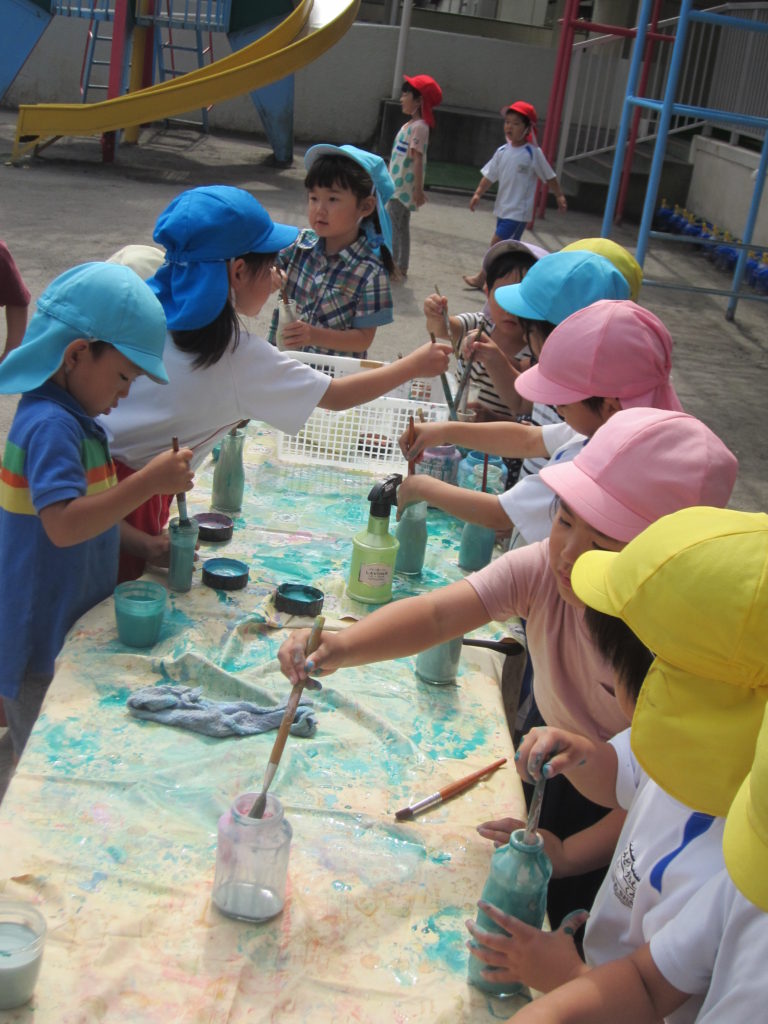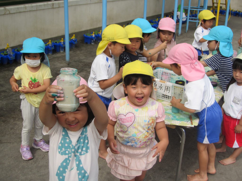 6月の主な活動は、「水遊び・プール遊び」です。朝きたら水のかけあいや色水づくり、プール遊びなどが計画してあります。