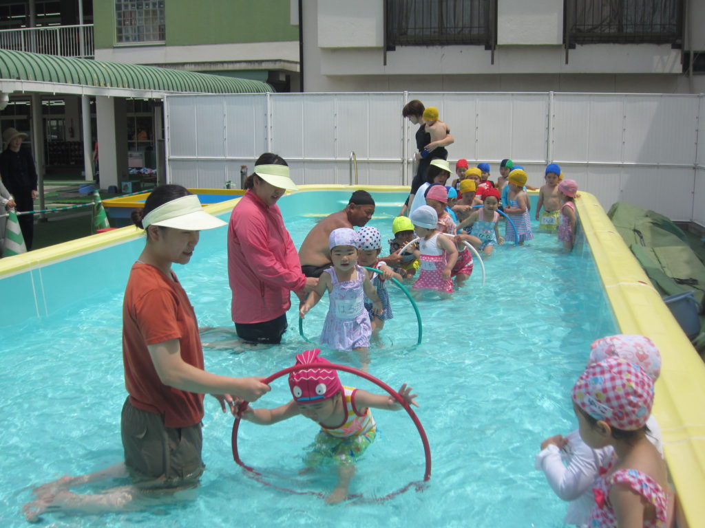 プールの中で輪くくり。水の中怖くないよ。上手に輪くくりできました。
