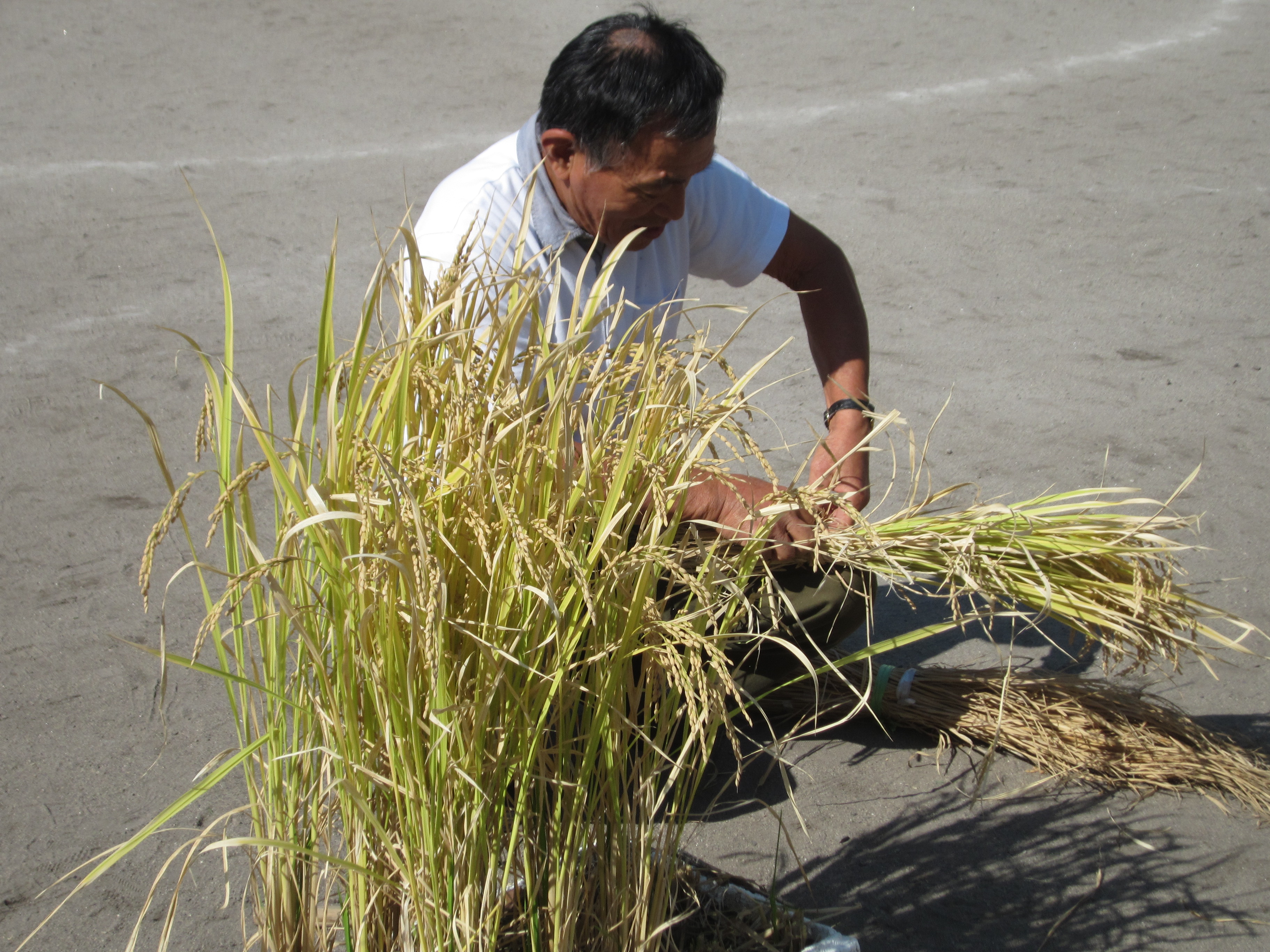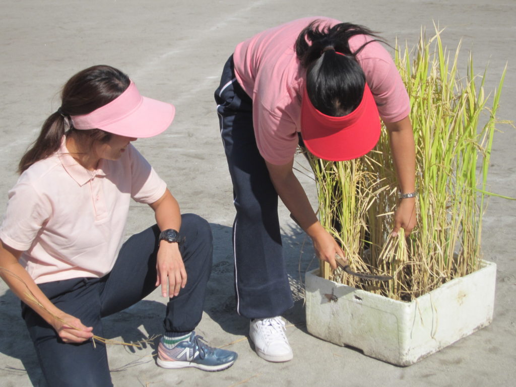 6月に発砲スチロールに田植えした稲が今年も黄金色に実り、今日(10月18日)稲刈りをしました。刈り取った稲は胸像前に掛け干ししました。