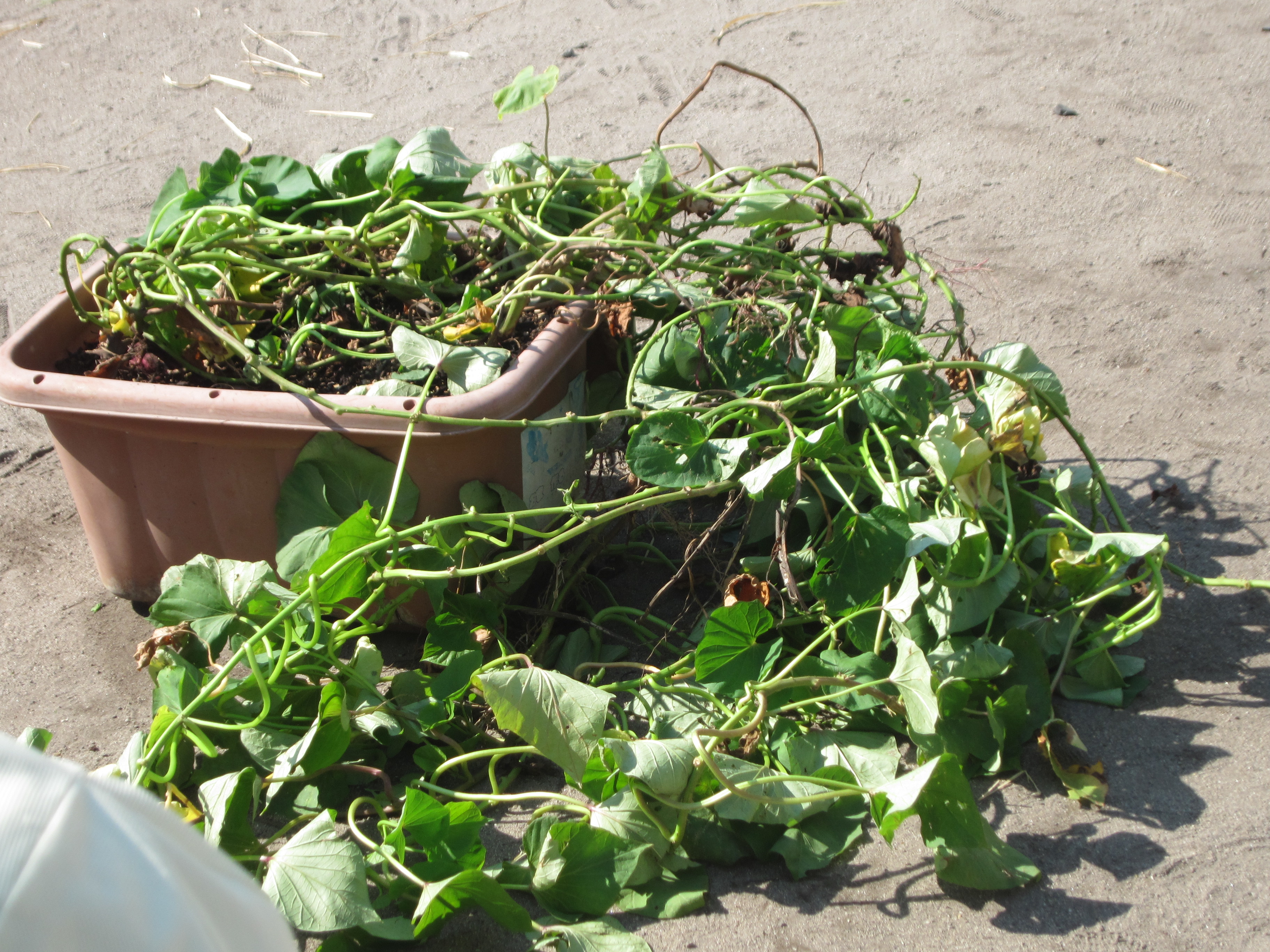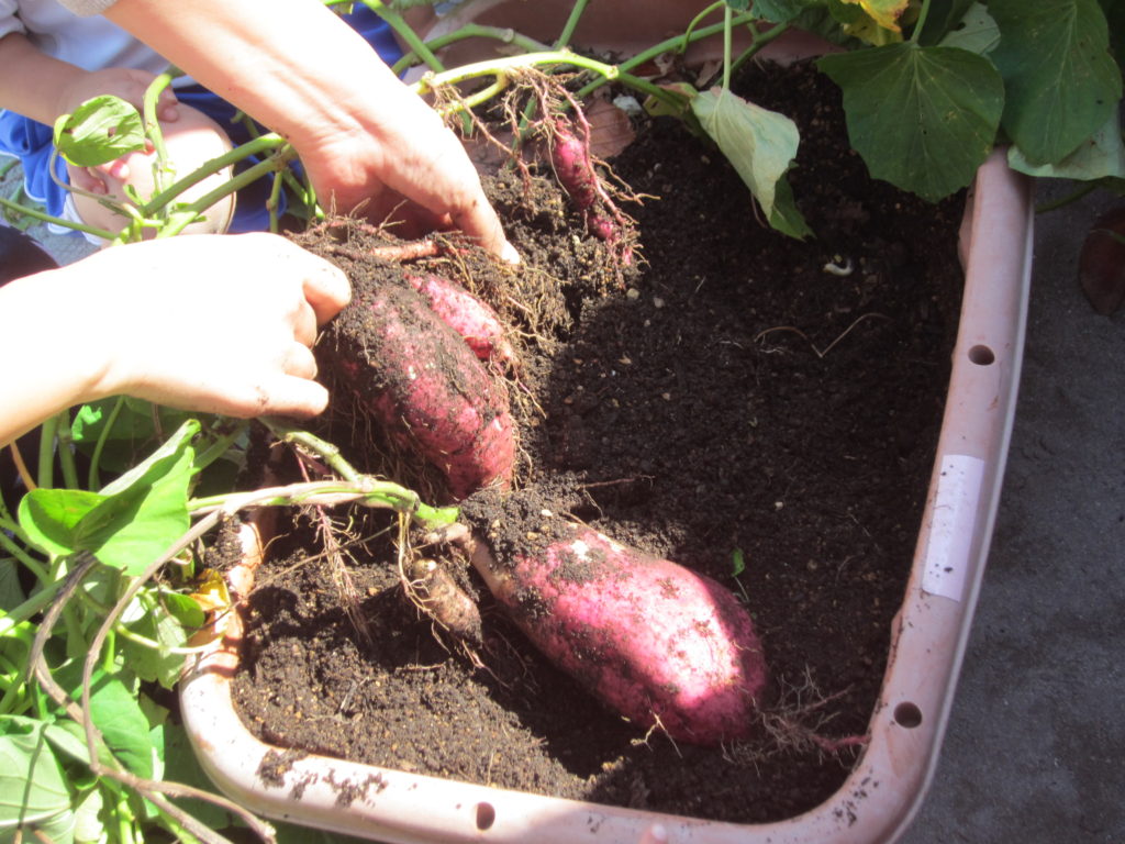 稲刈りの後は、プランタに植えたサツマイモ堀をしました。今年は例年になくたくさんの芋が取れました。 芋のつるを取り、サツマイモが見えてくると歓声が上がっていました。 10月30日は芋ほり遠足です。子どもたちは、畑でたくさんの芋を掘るのを楽しみにしています。
