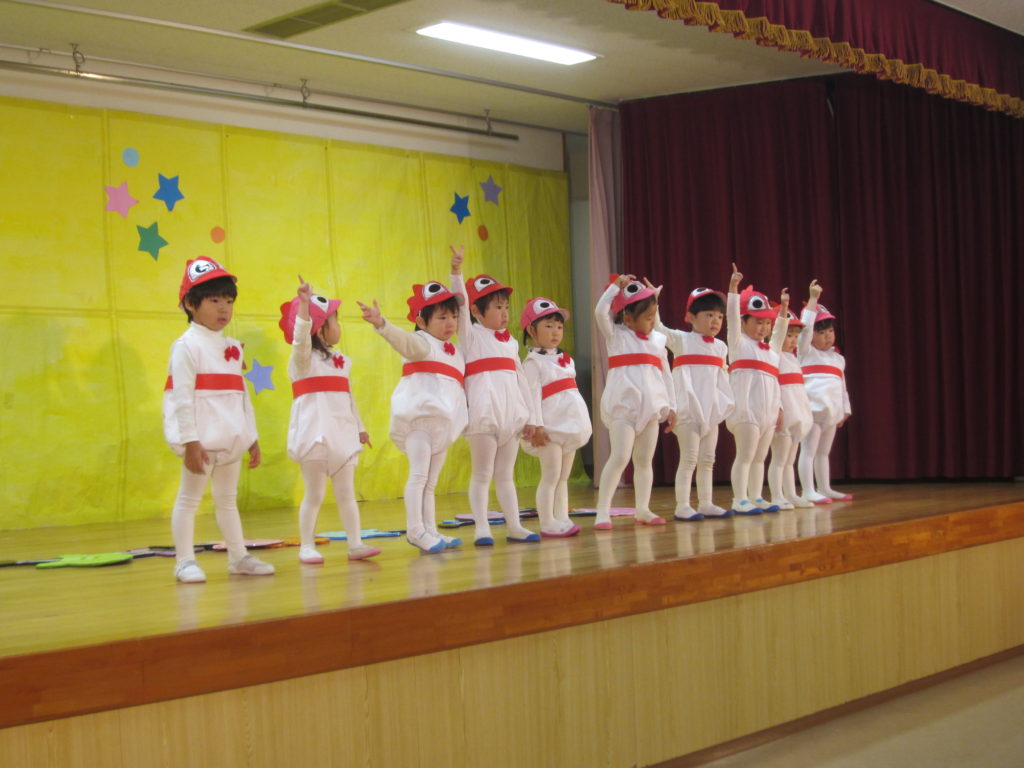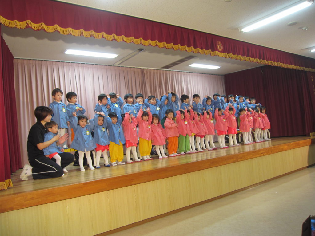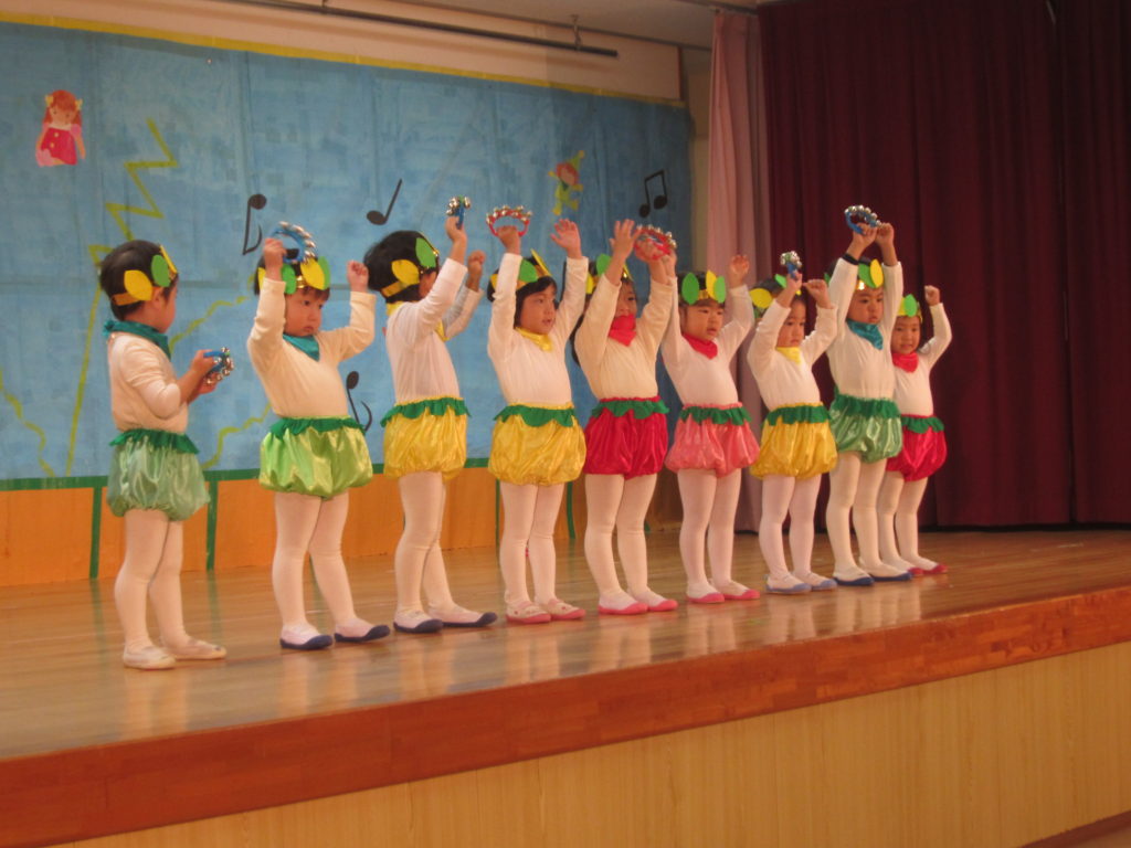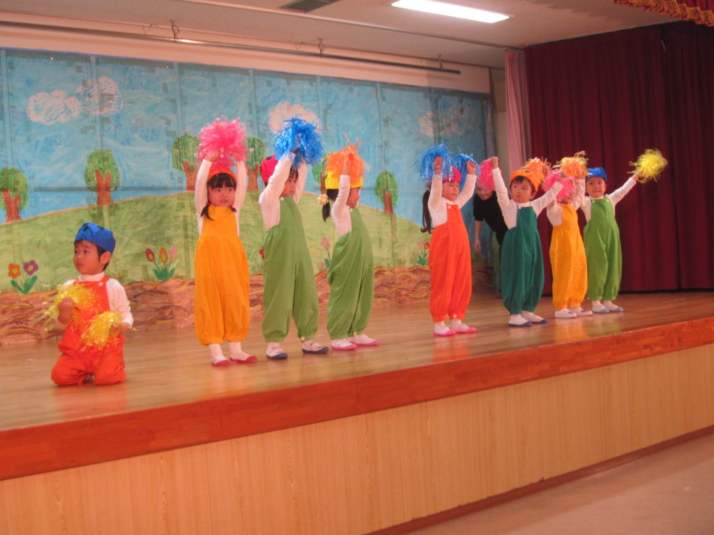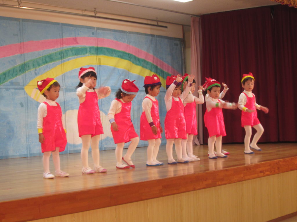 二日目は、午前中に「ちゅうりっぷ組」、午後に「年長」の発表会を行いました。 「ちゅうりっぷ組」は、最初と最後に全員による歌を歌い、あとクラスを4組に分けて遊戯の発表をしました。 どの組もかわいい姿で精一杯の表現をしてくれ、大きな賞賛の拍手をいただきました。今後の成長が楽しみです。
