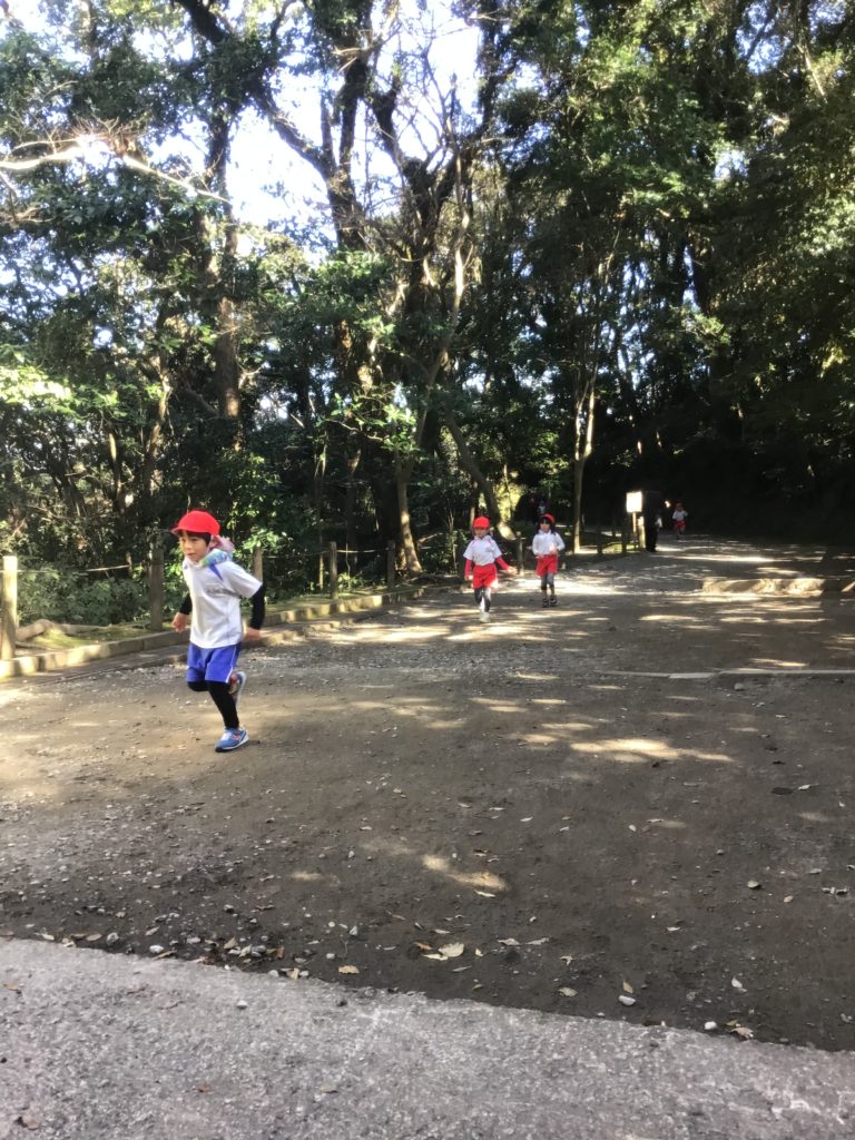 幼稚園から遊歩道上り口まで約30分かかりました。上り口で準備運動をして、いっせいに頂上をめがけてスタートしました。早い子どもは8分程度で登りきりました。