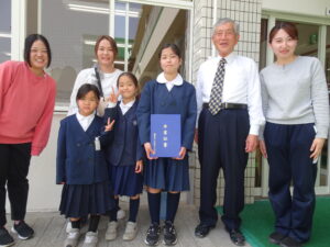 3月24日(月)県内の小学校の卒業式がありました。その中で、さみどり幼稚園を卒園した小学校の卒業生が晴れ姿を見せに、幼稚園に来てくれました。鹿児島市内の広木小学校や山下小学校を卒業した小学生、西田小学校や武小学校、原良小学校などを卒業した卒業生、そして、遠くは霧島市の綾南小学校を卒業生した卒園生まで来てくれました。6年前、卒園した小学生、心も体も大きく成長しており、立派でした。中にはお母さんより大きくなっている子どもさんもいました。「ありがとう」という感謝の心に触れ、感激で胸がいっぱいになりました。小学校の卒業生の皆さん、卒業おめでとうございます。中学校への進学おめでとうございます。 「 春風や 闘志抱きて 丘に立つ 」