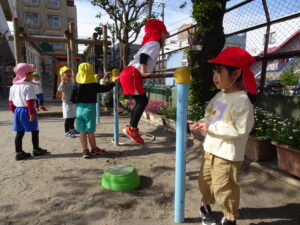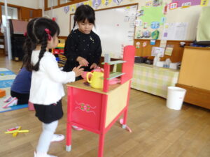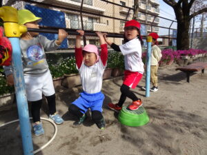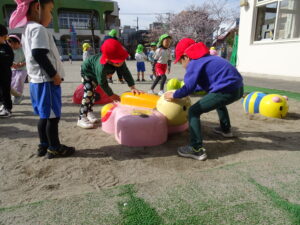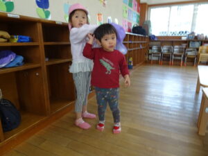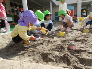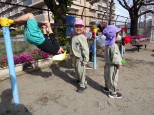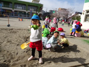 始業式2日目の活動Ⅰ(登園後~9時50分)の様子です。暖かい春の日差しを浴びながら、思い思いの活動Ⅰの時間を楽しんでいました。桜の花びら集めをしている子、ダンゴムシム探している子、砂場で砂遊びの子、お部屋でブロック遊びの子、妹や弟のお世話をしている子など、自由な時間のいろいろな姿が見られました。明日は、入園式です。