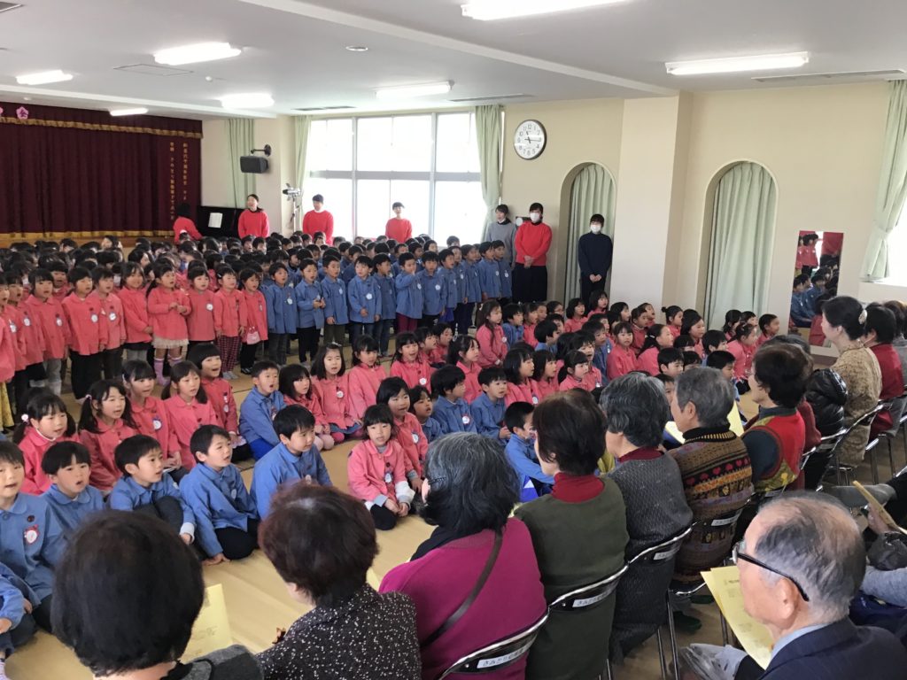 今年は36名のおじいちゃん、おばあちゃん方が来てくださいました。最初は、お雛様の飾ってある遊戯室で、年長さんが合奏や遊戯、劇の発表をしました。