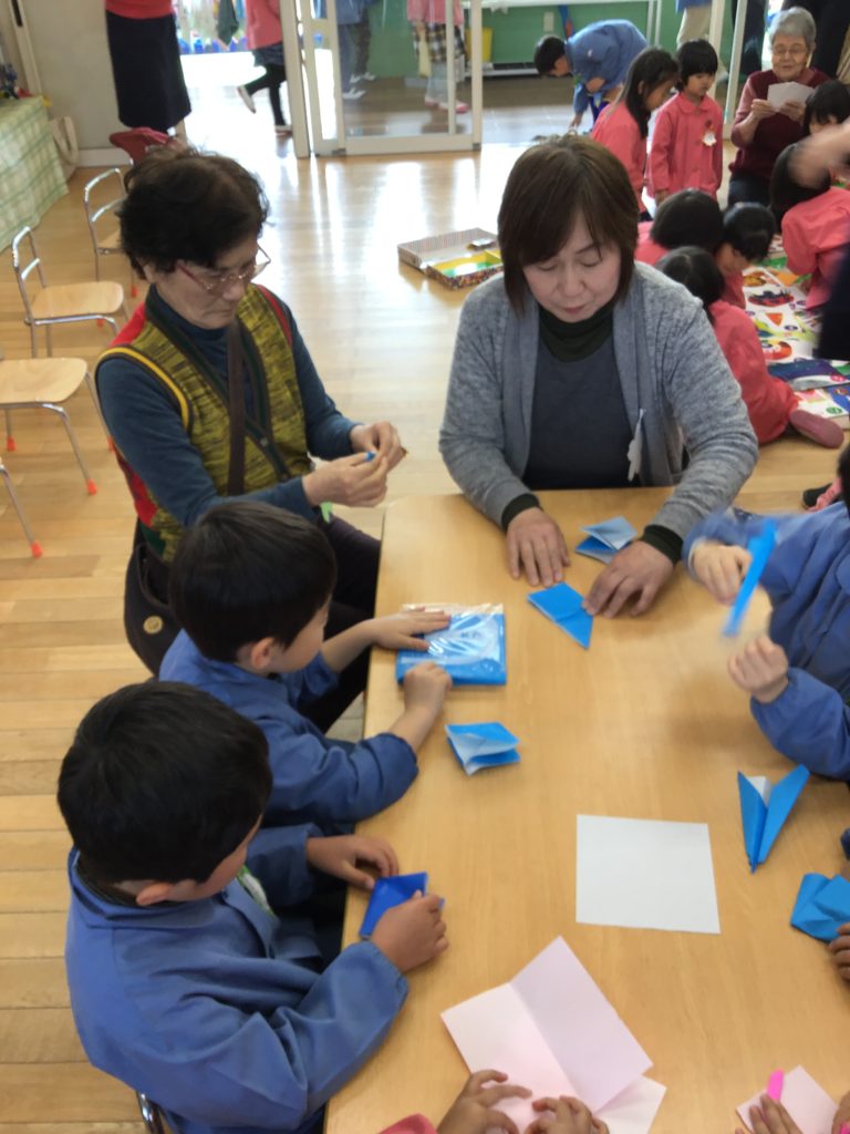 遊戯室で一緒に「うれしいひな祭り」を歌い、その後、教室へ移動しました。教室では、あやとりをしたり、折り紙をしたりいっぱい遊んでもらいました。