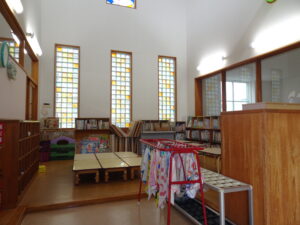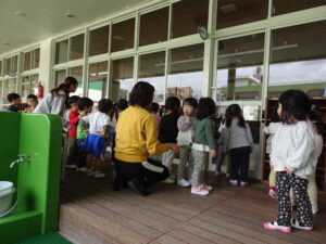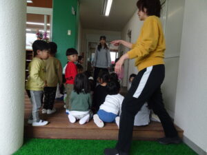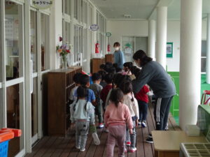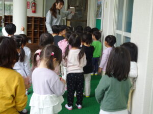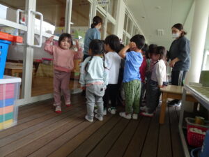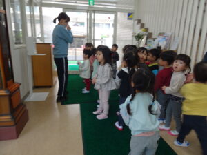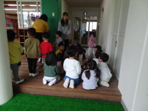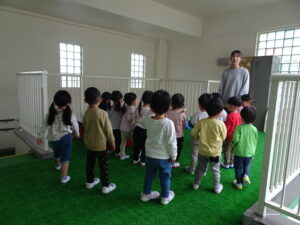 年少さんが、園内巡りをしました。それぞれの部屋に行き、部屋の名前や部屋の使い方を教えてもらいました。新しい部屋の見学の時は、目を丸くして驚いているようでした。