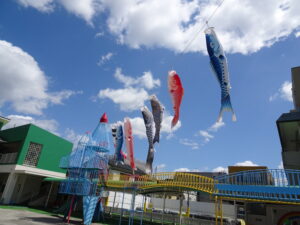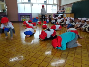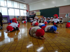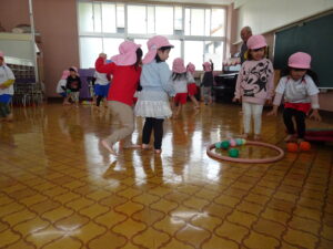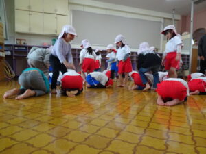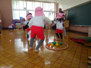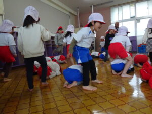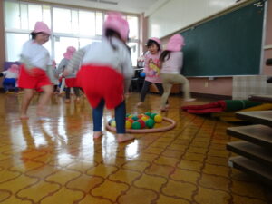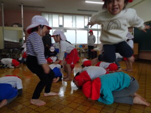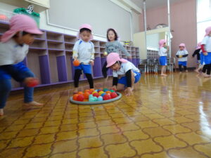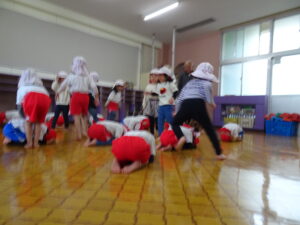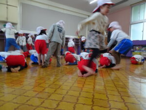 第1回目の運動遊びがありました。月曜日は雨模様のため、室内(プレイルーム)になりました。年長さんは友達の背中に手をついて飛び越したり、手をつかずに飛び越したりして遊びました。また、こいのぼり運動会の行進の練習もしました。年中さんはボール入れ競争を楽しみました。これからの運動遊びが楽しみです。