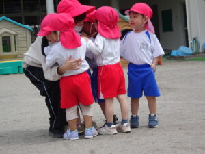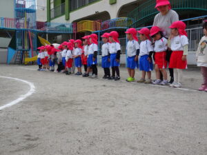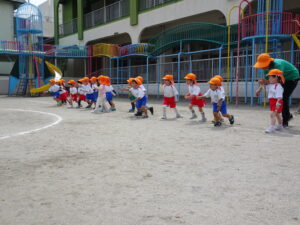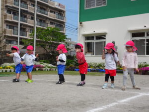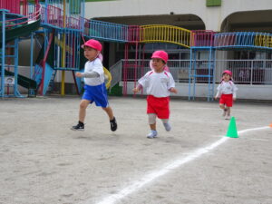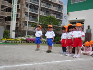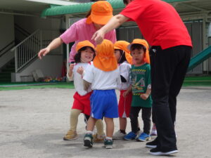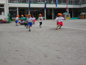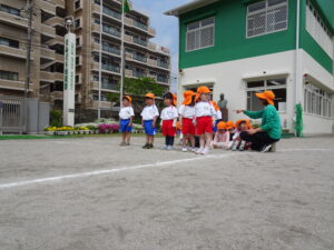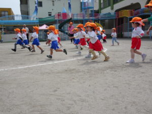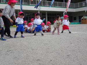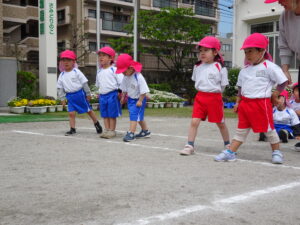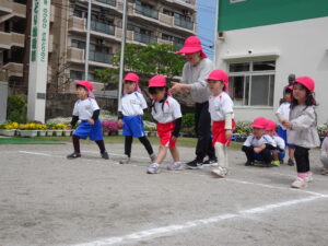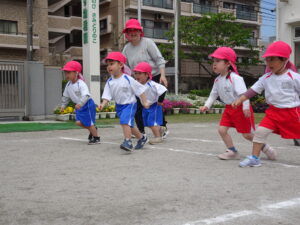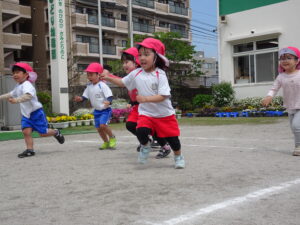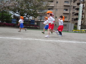 18日(金)、年少さんの初めての運動遊びは、かけっこ遊びでした。初めてトラックを走ります。「位置について」「よーい」「ドン」というかけ声に、なかなか動作が連動しません。その前に走る意欲がわいてこない子どもたち。でも最後はゴールテープの先に待っている先生の姿が見えると、先生めがけて飛び込んでいました。こいのぼり運動会では、どんな走りを見せてくれるのでしょうか。