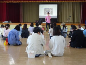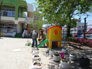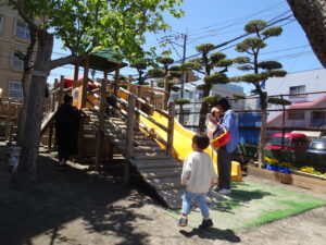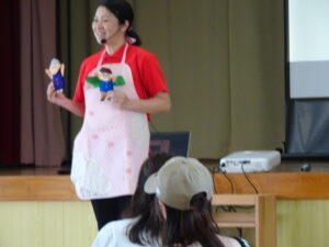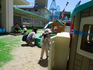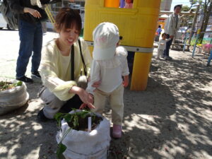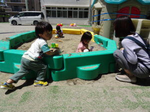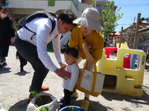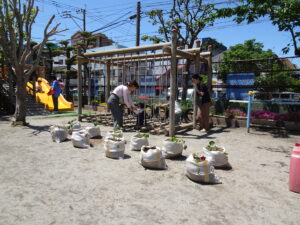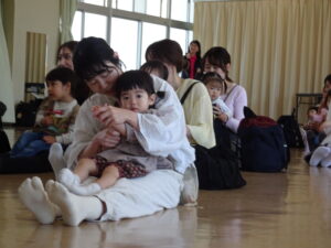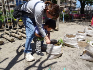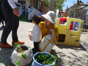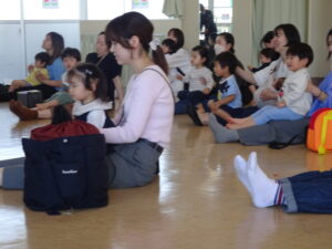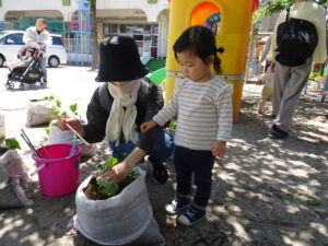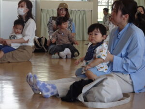 未就園児教室(ひまわりクラブ)の開講式がありました。開講式では、ひまわりクラブのお世話をしてくださる三島琴音先生、小川晶子先生、福元裕子先生、若松紀子先生、大人のためのEQ絵本講師の山下美恵子先生5名の紹介とひまわりクラブの活動のねらいについてのお話がありました。その後、親子で歌を歌ったり触れ合い遊びをしたりしました。最後はエプロンシアターや大人の絵本「しあわせになあれ」の読みきかせもありました。終了後、お芋を植えたり、園庭の遊具で遊んだりしました。次は5月21日(水)です。
