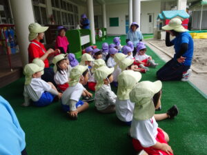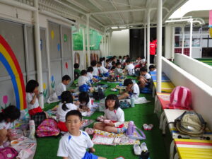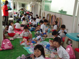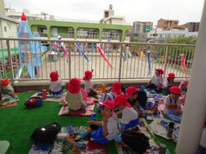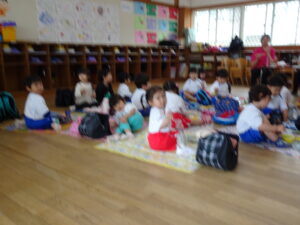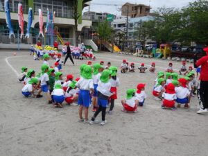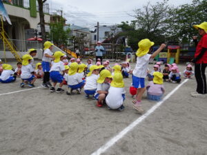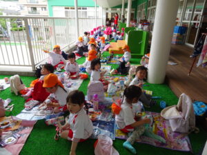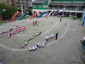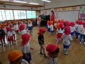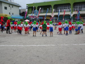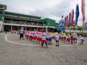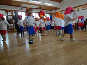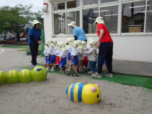 園内触れ合い活動がありました。年長さんは、クラス対抗のころがしドッジボールやネコとねずみの追いかけっこ、年中さんは玉転がしゲームや玉入れ競争、年少さんは、教室で音楽に合わせてゴー・ストップなどの「歩こうゲーム」、ちゅうりっぷさんは、並んで移動したりアスレチック滑り台で滑ったり、最後は砂遊びでした。昼食時間は学年ごとに別れて、遊戯室や渡り廊下、プレイルームなど、好きな場所で家で作ってもらったお弁当を食べていました。楽しい園内触れ合い活動になりました。