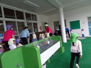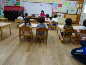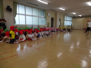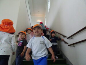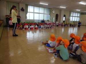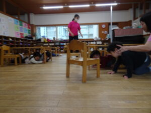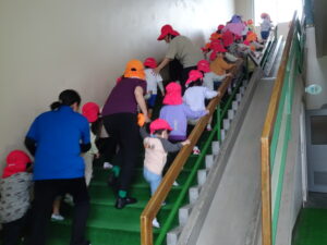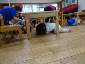 地震が起きた場合の身の守り方や安全な避難の仕方を訓練しました。教室や園庭などいろいろな場所にいた時、地震が起きたらどう避難したらよいかを考えて、避難しました。
