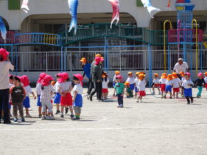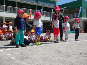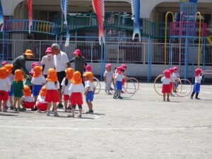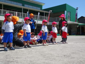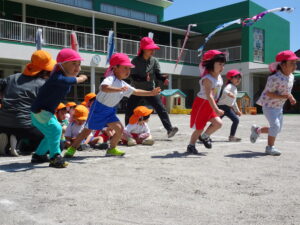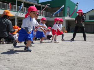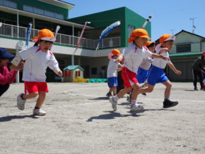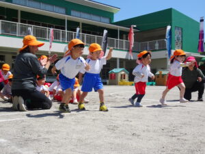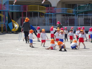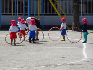 今日の年少さんの運動遊びは、かけっこと輪くぐりの運動でした。