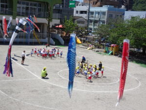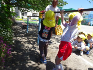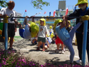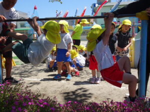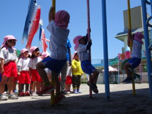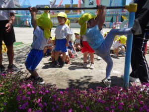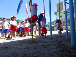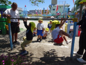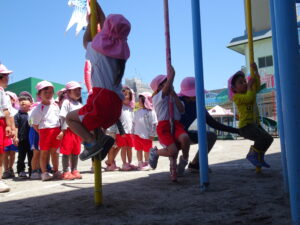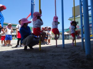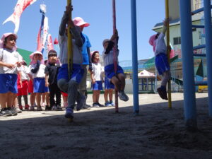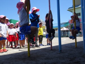 今日の年中さんの運動遊びは、かけっこと玉入れ、そして、登り棒や鉄棒を使っての体力つくりでした。登り棒や鉄棒に捕まり、自分の体を必死に支えていました。
