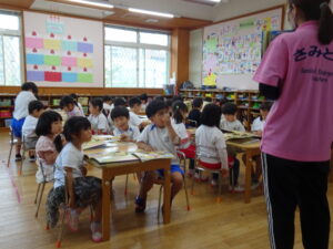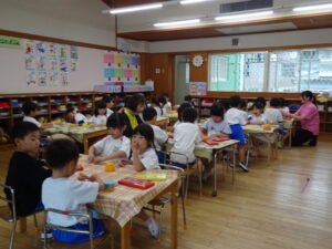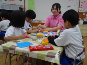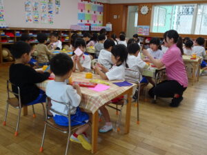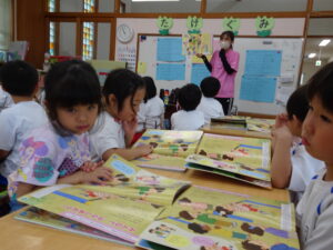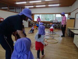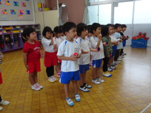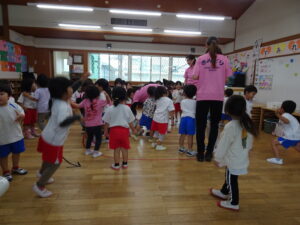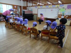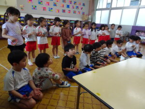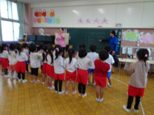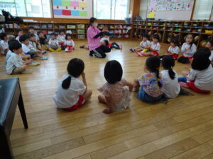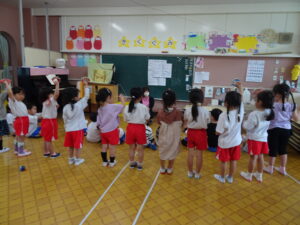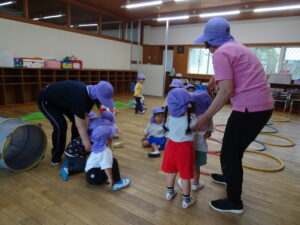 天気予報通り雨の日になり、こいのぼり運動会が中止になりました。これまで一生懸命練習してきた子どもたちの姿を見てもらえずに残念。でも、この間、かけっこが最後まで上手に走れるようになりました。クラス対抗の玉入れやリレーもしっかりできるようになりました。これらは、秋の運動会で発表します。雨降りの日の各教室を訪問しました。年少少のちゅうりっぷ組さんは、教室で運動器具を使った遊び。年少さんは、学年で、昼と夜の活動遊びと粘土遊び。年中さんは、スズ楽器の使いかたの学習。年長さんは絵本読みと折り紙学習。各学年いろいろな活動が展開されていました。