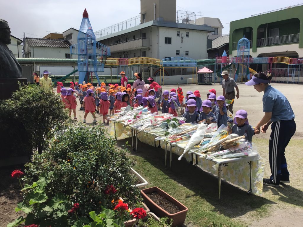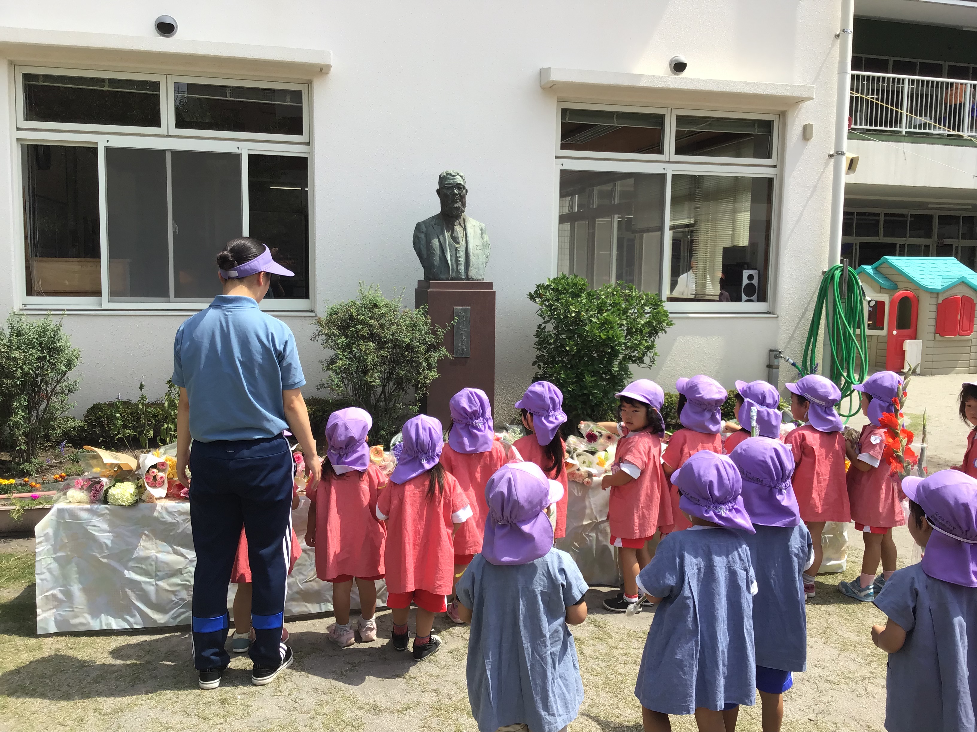 6月13日はさみどり幼稚園の創立記念日です。今年は、創立73年に当たります。 毎年全園児が一輪ずつ花を持ち寄り、創始者「新川近義」氏の胸像前に献花し、お礼を述べています。
