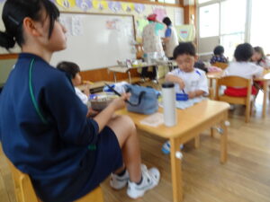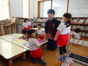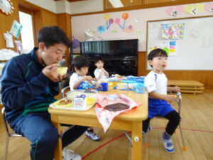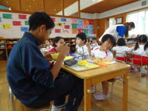 城西中学校の生徒さん7名が、さみどり幼稚園に2日間(木、金)、職場体験学習に来ております。さみどり幼稚園出身の方もいます。今日は、さみどり幼稚園の一日の流れや合同リズム運動、給食活動など、各クラスに別れて体験しております。子どもたちは、お兄さんお姉さんたちとの触れ合いを楽しんでいます。ここでの職場体験が将来の職業を考える上での材料になれば幸いです。