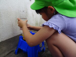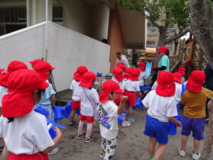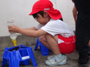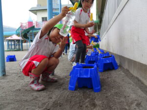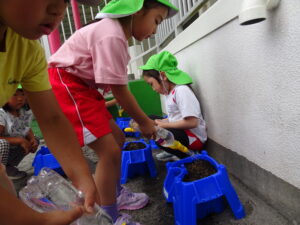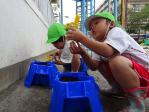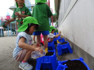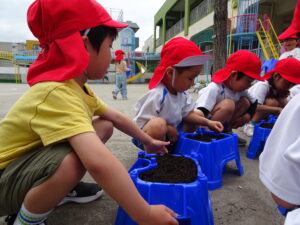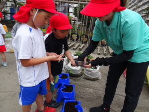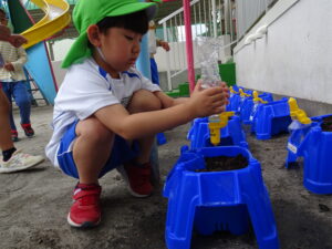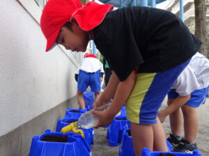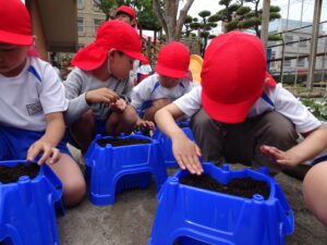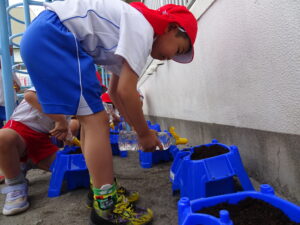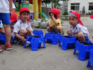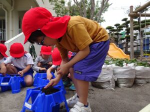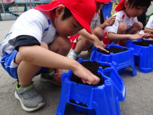 これまで年長さんは、さつまいもや稲の植え付けをしてきましたが、今日は、一人一鉢の栽培で朝顔の種をまきました。まず、自分の鉢に土を入れてもらい、そして、昨日水に湿しておいた朝顔の種を先生から5粒づつもらい土に植えました。その後、ペットボトルに入れた水をかけました。これから朝顔の芽の出方や育ち方をなどを観察し生長を見守っていきます。