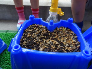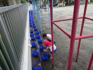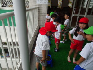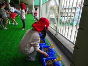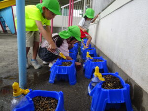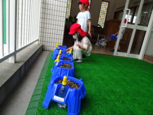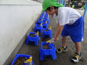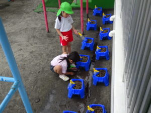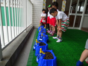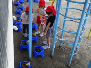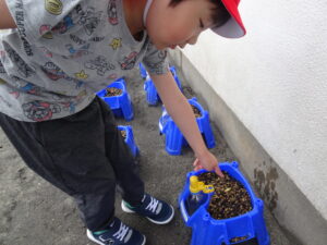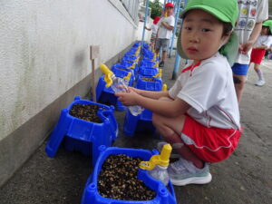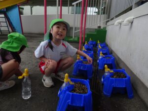 2号園舎の前においた朝顔の鉢に子どもたちが集まり、一生懸命ペットボトルで水かけしている姿がありました。よく見ると、朝顔の芽が出ています。5個植えたうちの2個が芽が出ています。残りの種も芽が出るように水かけしているのだそうです。先生が「水かけしすぎると、くされてしまうよ。土が乾いたら、水かけしてね。」と話しておられました。芽が出た鉢は、自分たちのクラスの近くの1号園舎ベランダに運んで、生長の様子を観察するのだそうです。