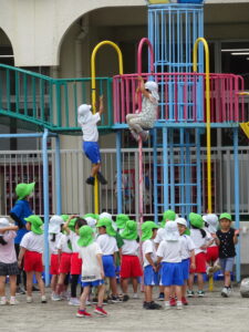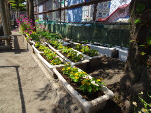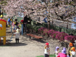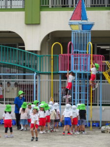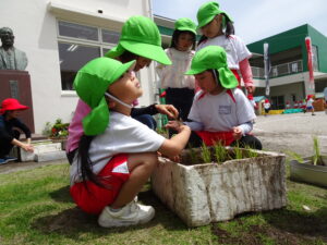 さみどり幼稚園の良いと思うところを、今年新しく来られた1年目の先生3名にお聞きしました。二人目は、長い間、幼稚園の教諭として勤務され、今回、さみどり幼稚園勤務3週目になり、年長の副担任として勤務されている先生に突然インタビューしました。「さみどり幼稚園の良いところはどんなことですか。」先生は「花がきれいですね。そしてその花に集まる虫やカタツムリ、ダンゴムシなど自然にふれあえる環境が準備されている。そして、子どもたちが自分で考えて行動できるように、先生方が子どもに働きかけておられるところです。」と話されました。3週間目の朝(月曜日)、インタビューに答えてくださいました。さみどり幼稚園が目指している子どもの姿をほめていただき嬉しいでした。