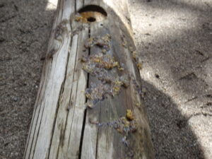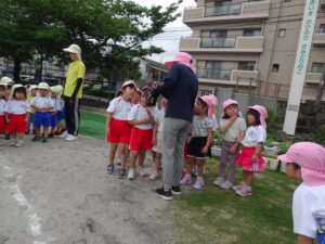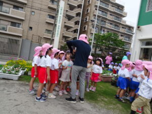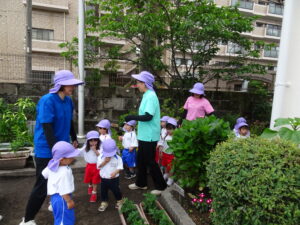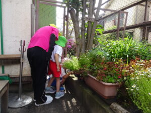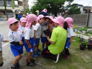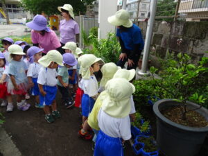 年長のAさんが「園長先生、卵みたいなもの見つけたんだけど何の卵ですか。早く来てください」と呼びに来ました。ジャングルジムの横の花壇に、子どもたちが集まっています。よく見ると、かえるの卵みたいな物が、花壇の木の枠にたくさんついています。年長のK君が見つけたのだそうです。その卵は、ノンスボールの花の種が、雨に濡れてカエルの卵みたいに固まり、花壇の柵にくっついていたものでした。その卵を生き物の卵と想像したK君もえらいでしたが、そのために、園長先生を探しに来たAさんもえらいでした。このことを合同リズム運動の中で子どもたちに紹介し、「不思議なことやおもしろいことなどを見つけたら、お友達や先生方にも教えてください。」と話しました。そして、「今、幼稚園のミカンの木や葉ボタンには、蝶の幼虫が成長しています。見つけてください。」不思議なことの発見プレゼントをしました。 自然との触れ合いの中で、子どもたちの五感は刺激され、思いやる心や豊かな感性が育まれます。友達と協力することで自発性や社会性が身に付きます。